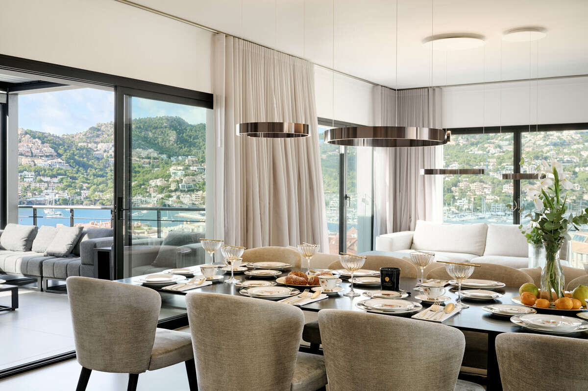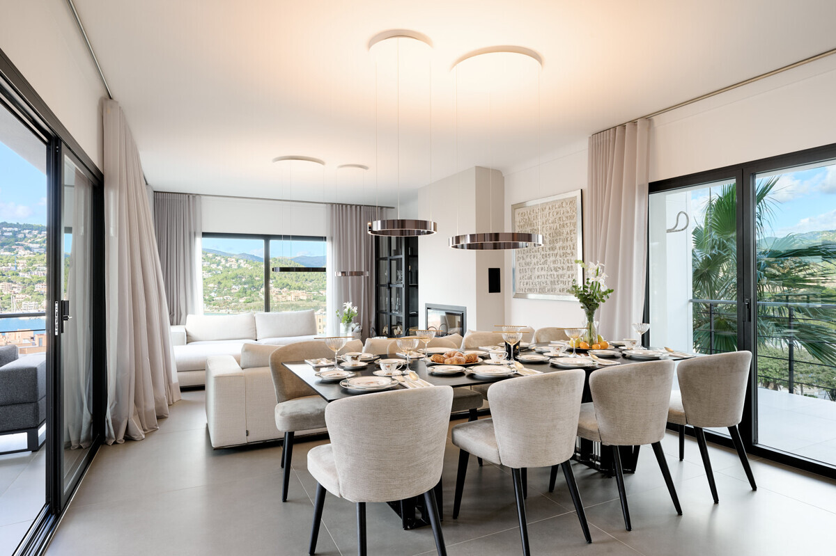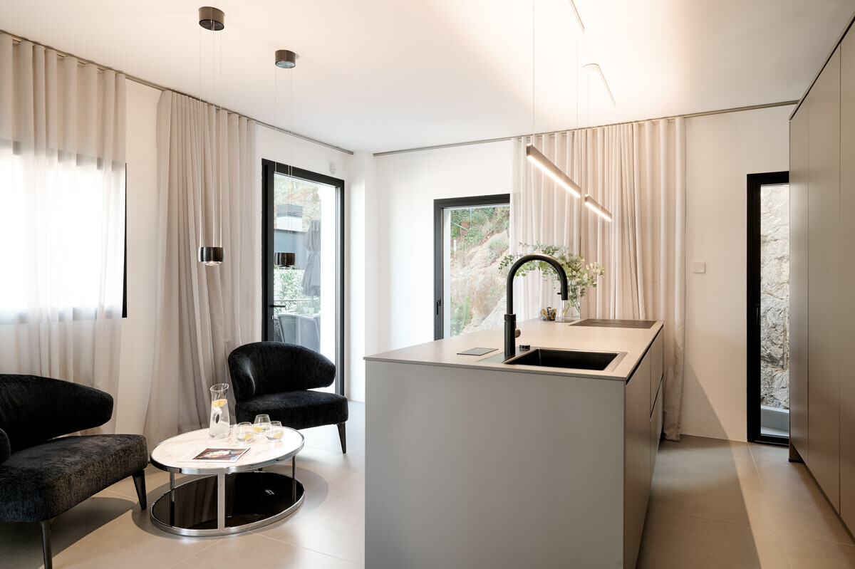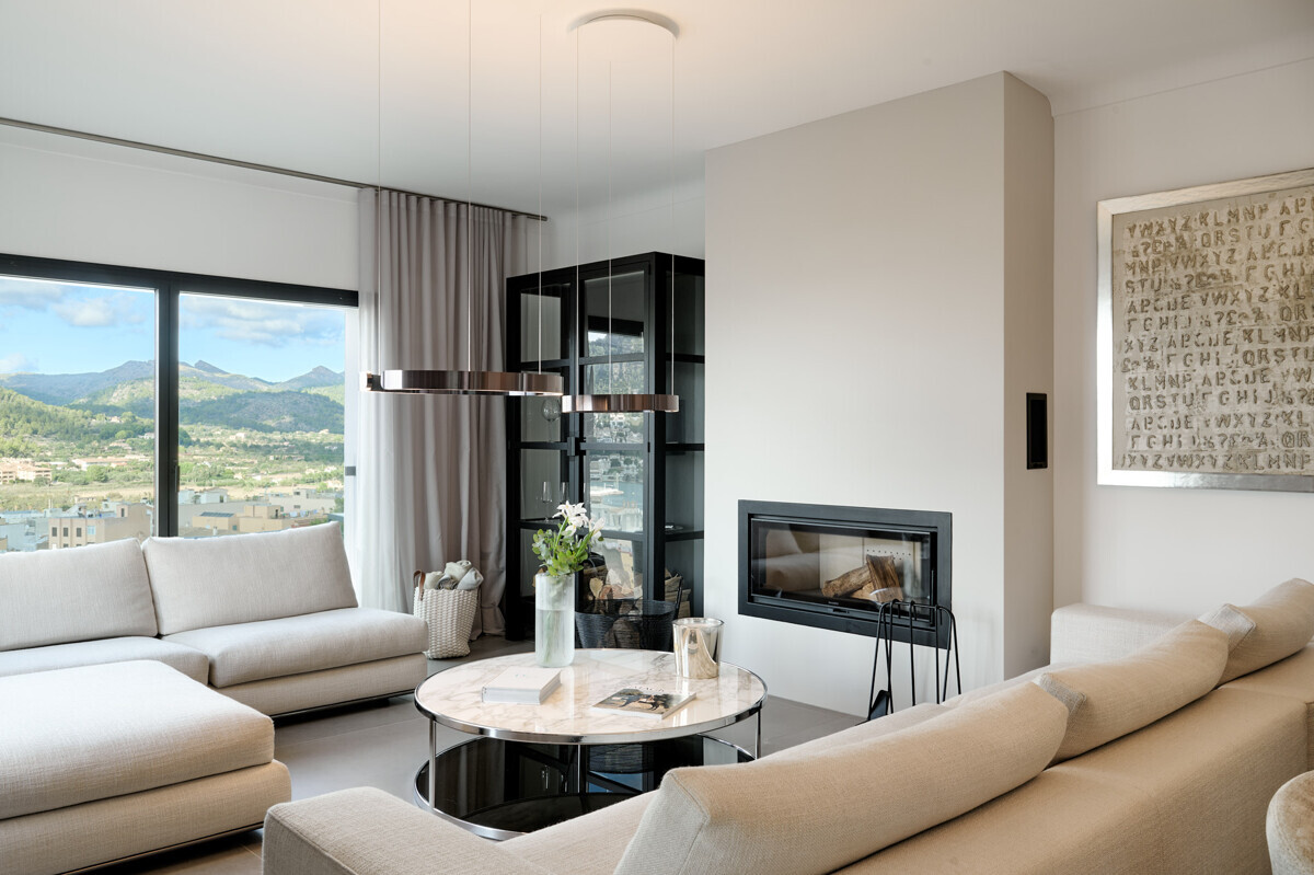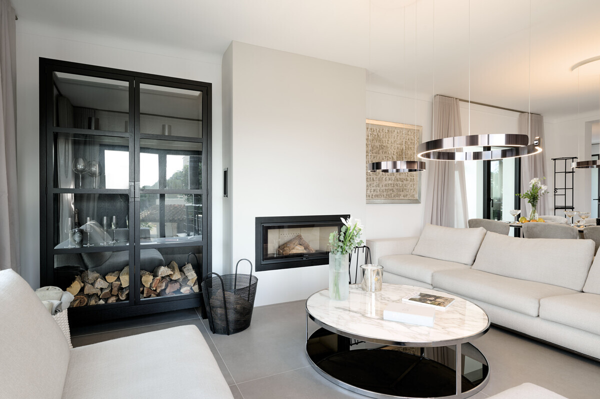 Checkroom, fully equipped designer kitchen with Miele appliances, open-plan living/dining room with fireplace, access to the covered terrace with lounge area and fantastic views, 1 bedroom with en suite bathroom