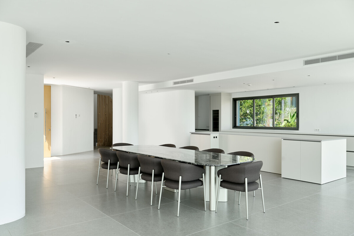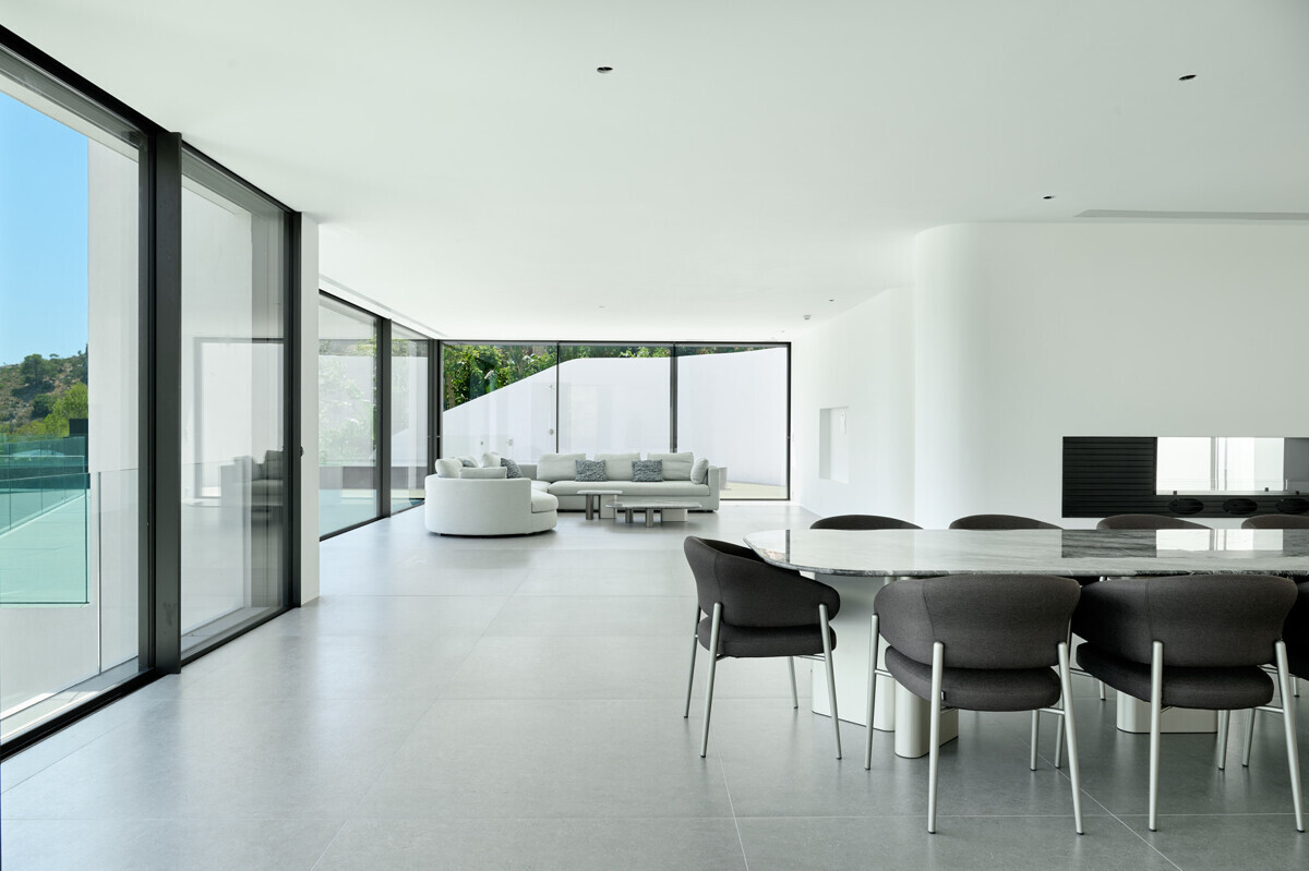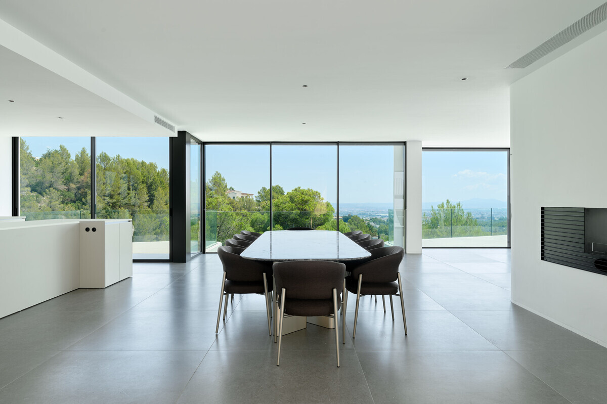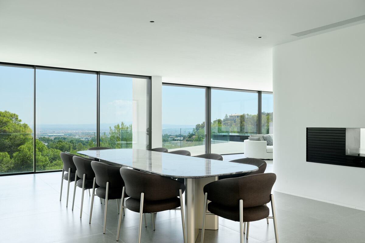 zona de salón-comedor abierta y luminosa con chimenea, cocina totalmente equipada, despensa, despacho, acceso a la terraza, zona de piscina con solarium y fantásticas vistas.