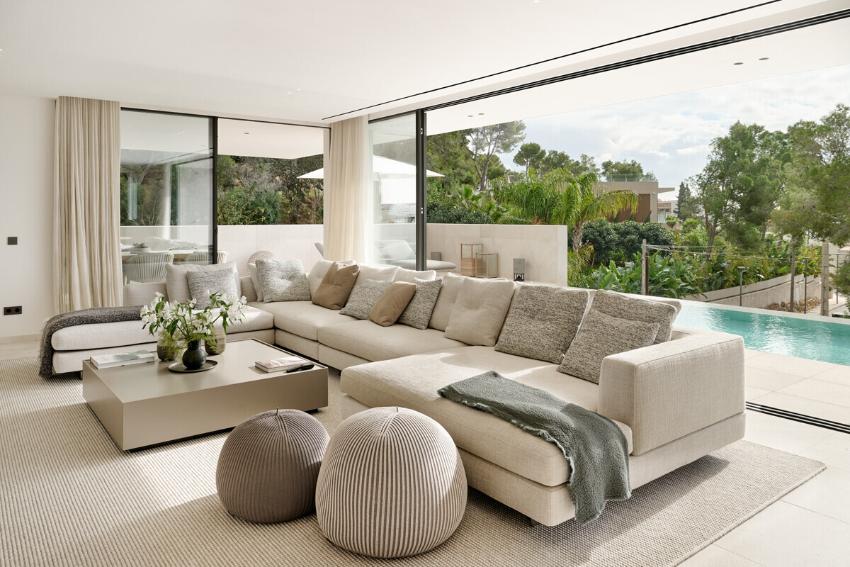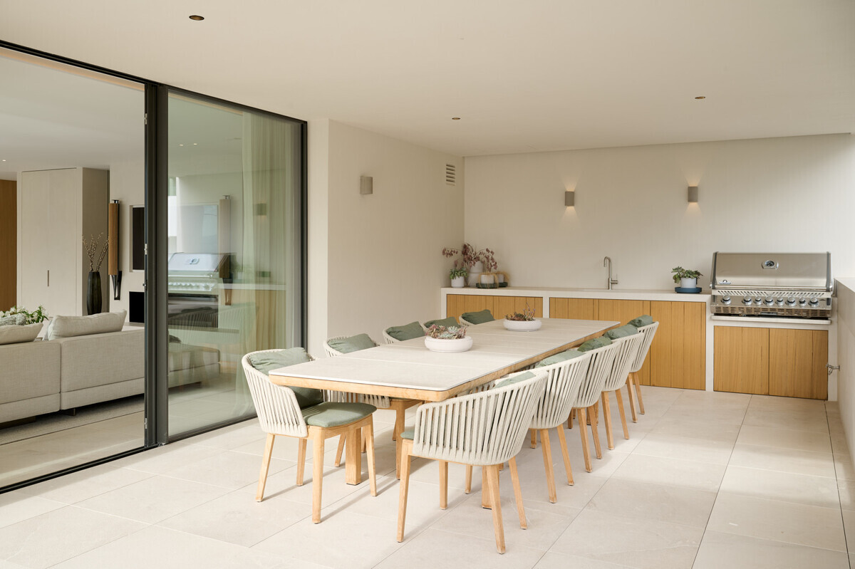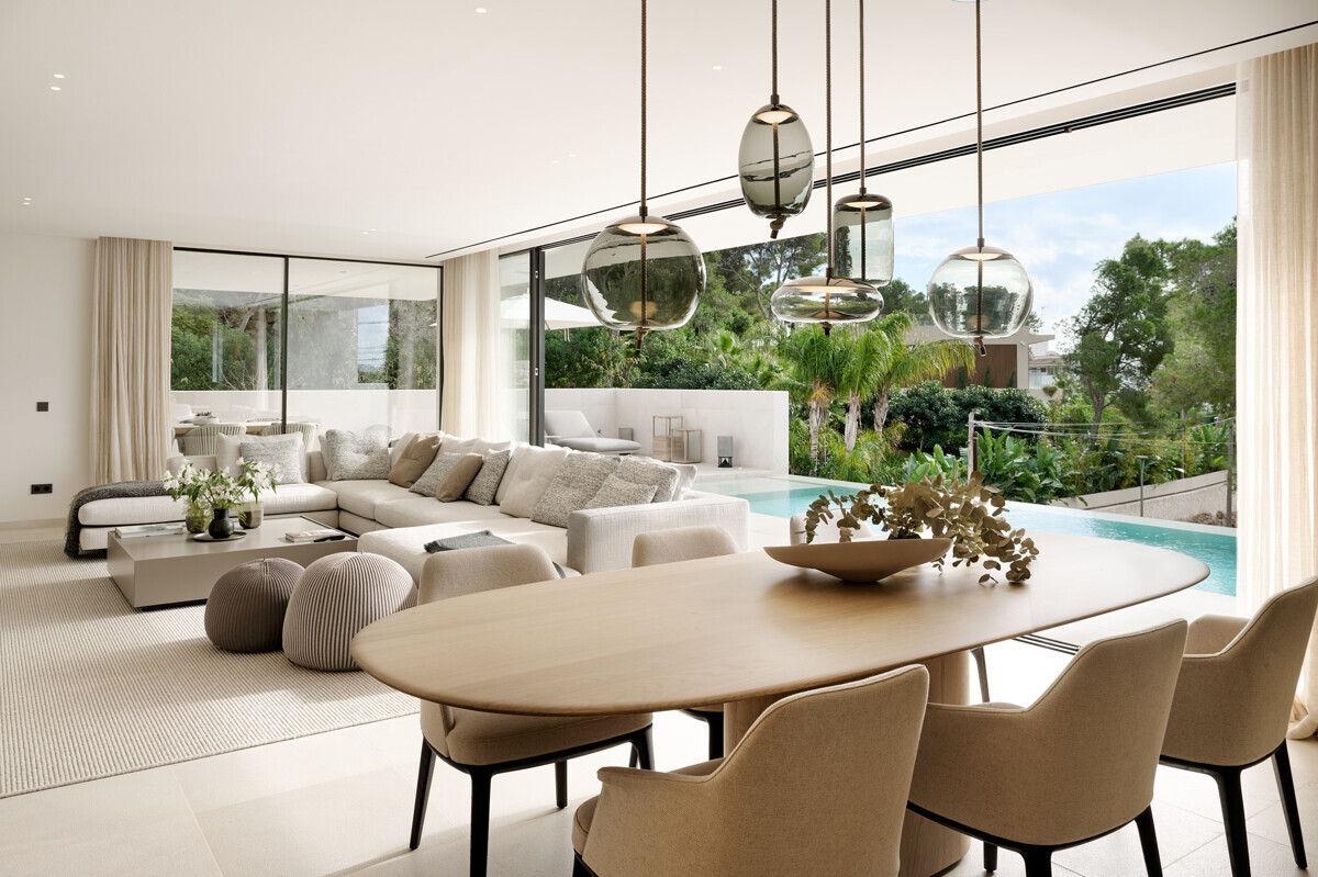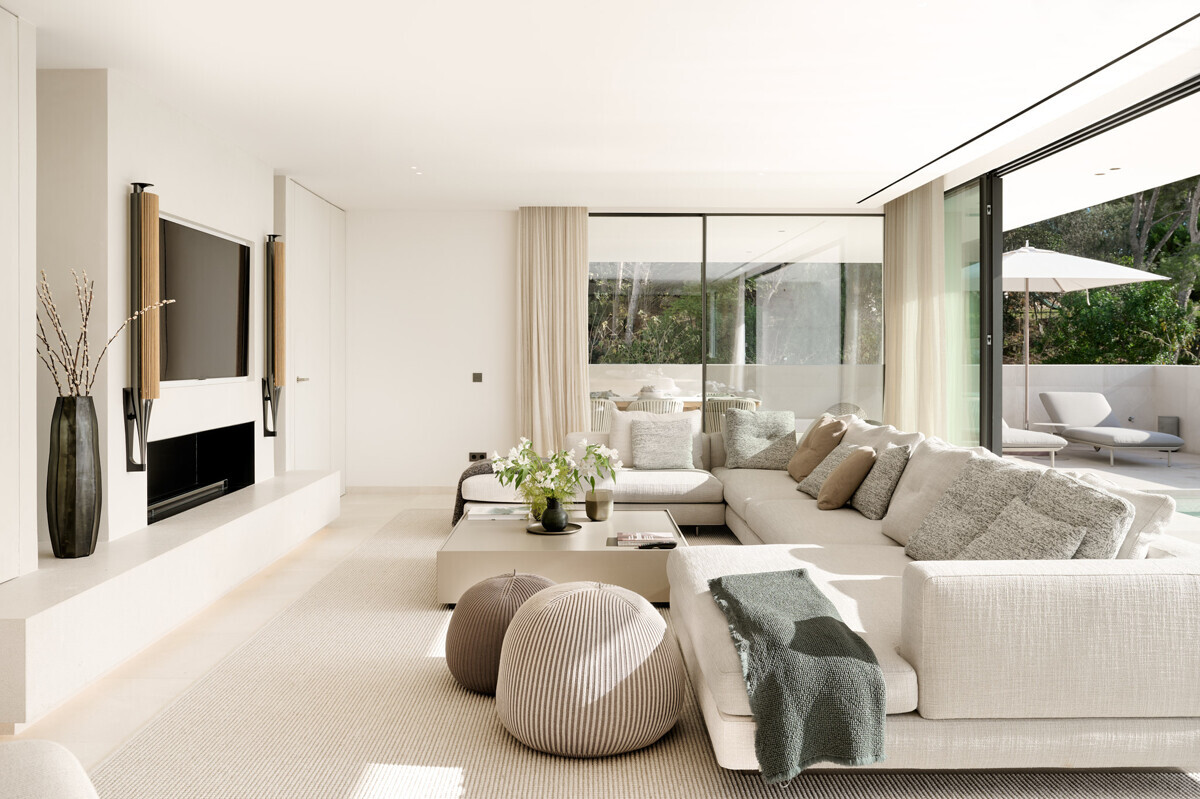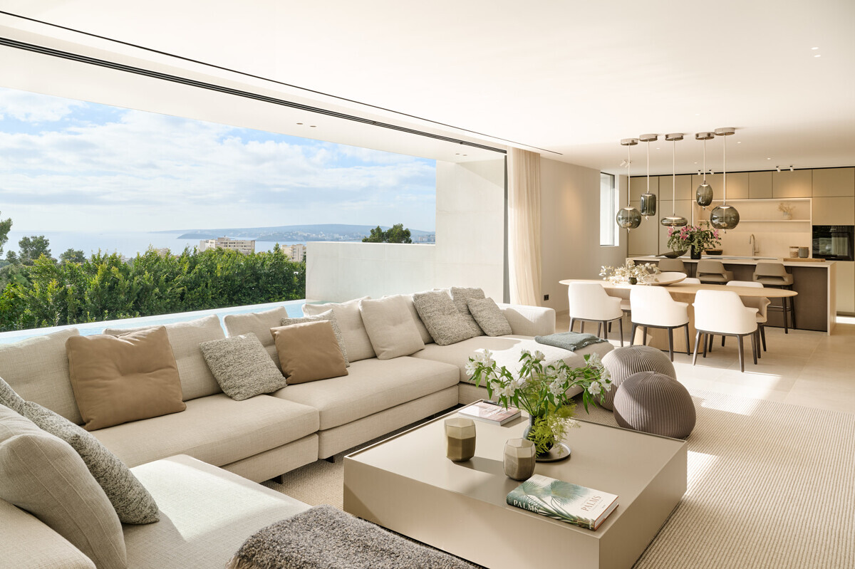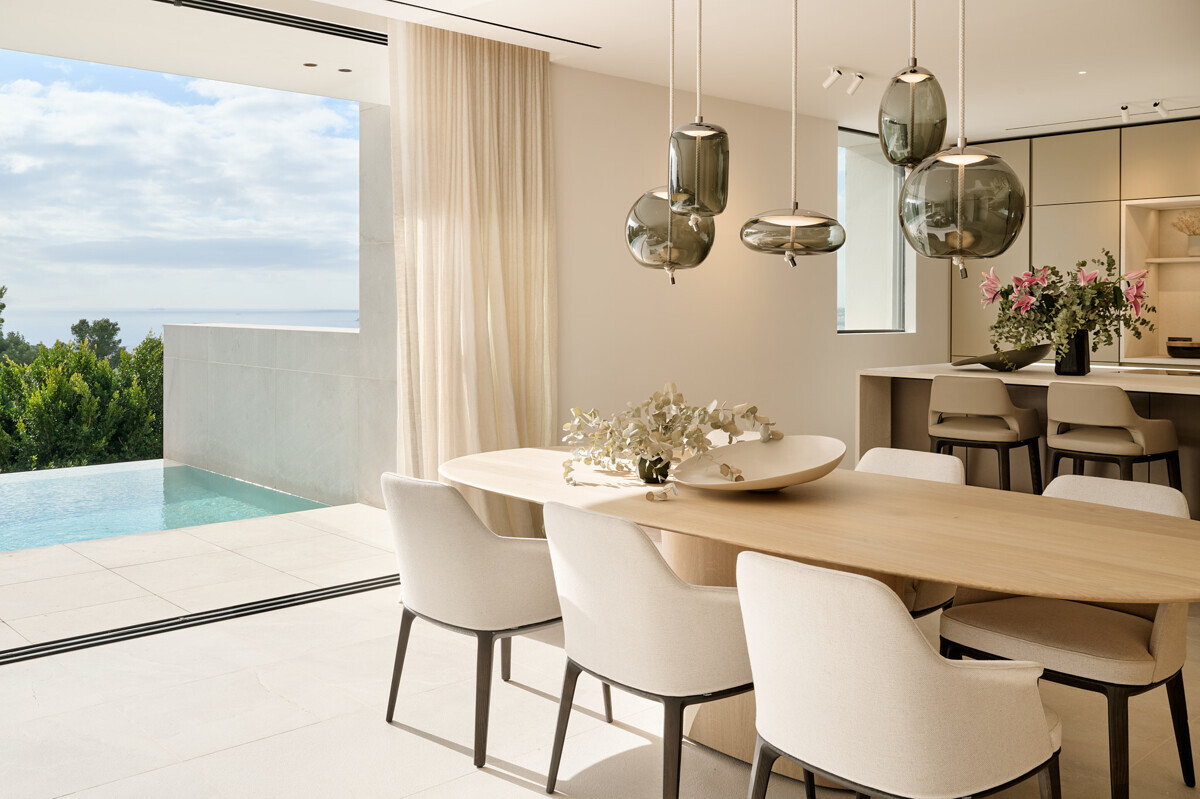 Amplio salón/comedor con chimenea, cocina de diseño totalmente equipada, acceso a la terraza cubierta con cocina exterior y barbacoa, más zona de piscina con solarium y vistas al mar