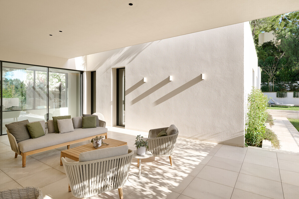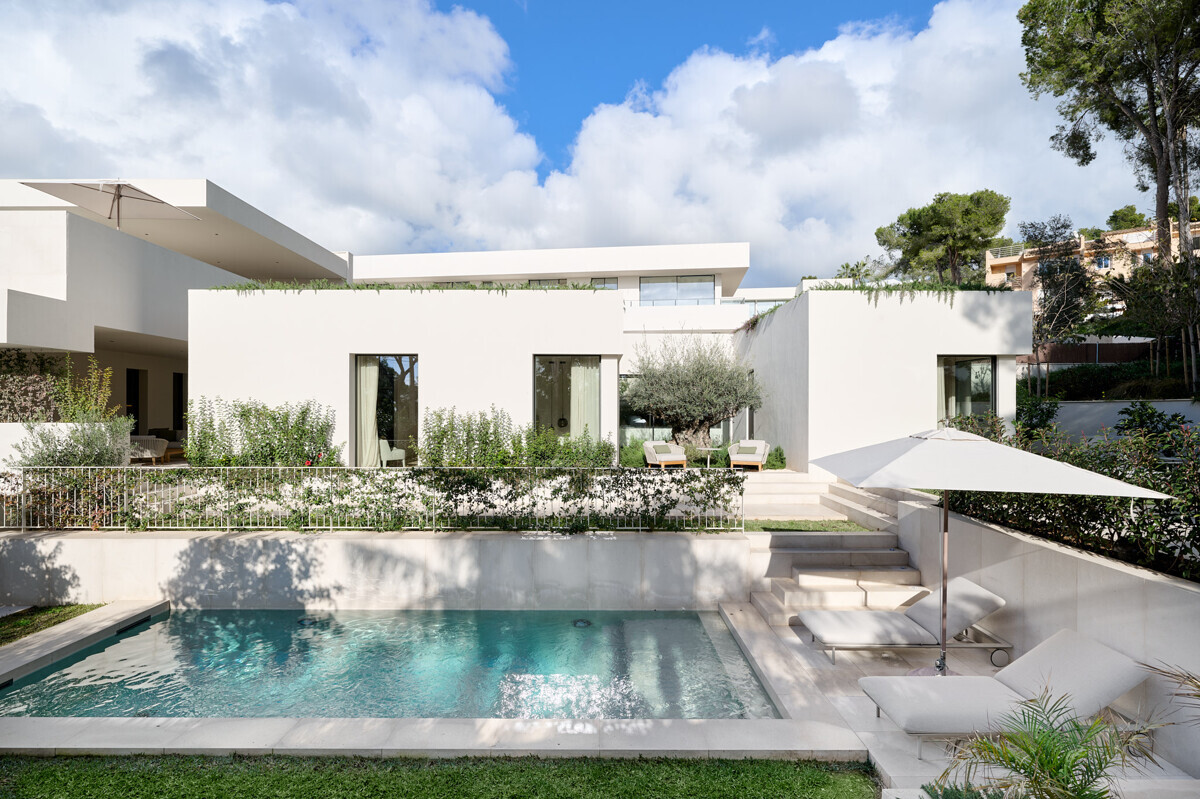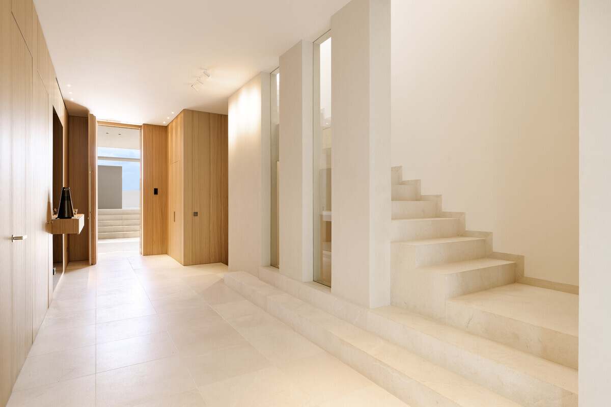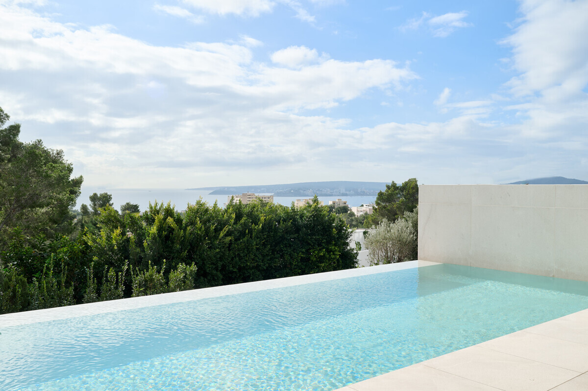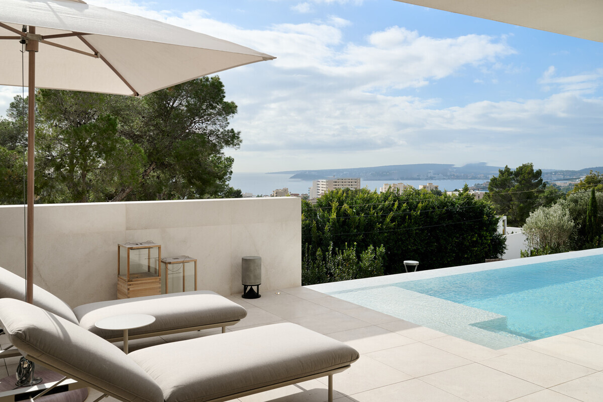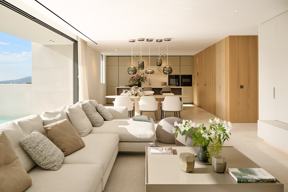 Amplio salón/comedor con chimenea, cocina de diseño totalmente equipada, acceso a la terraza cubierta con cocina exterior y barbacoa, más zona de piscina con solarium y vistas al mar