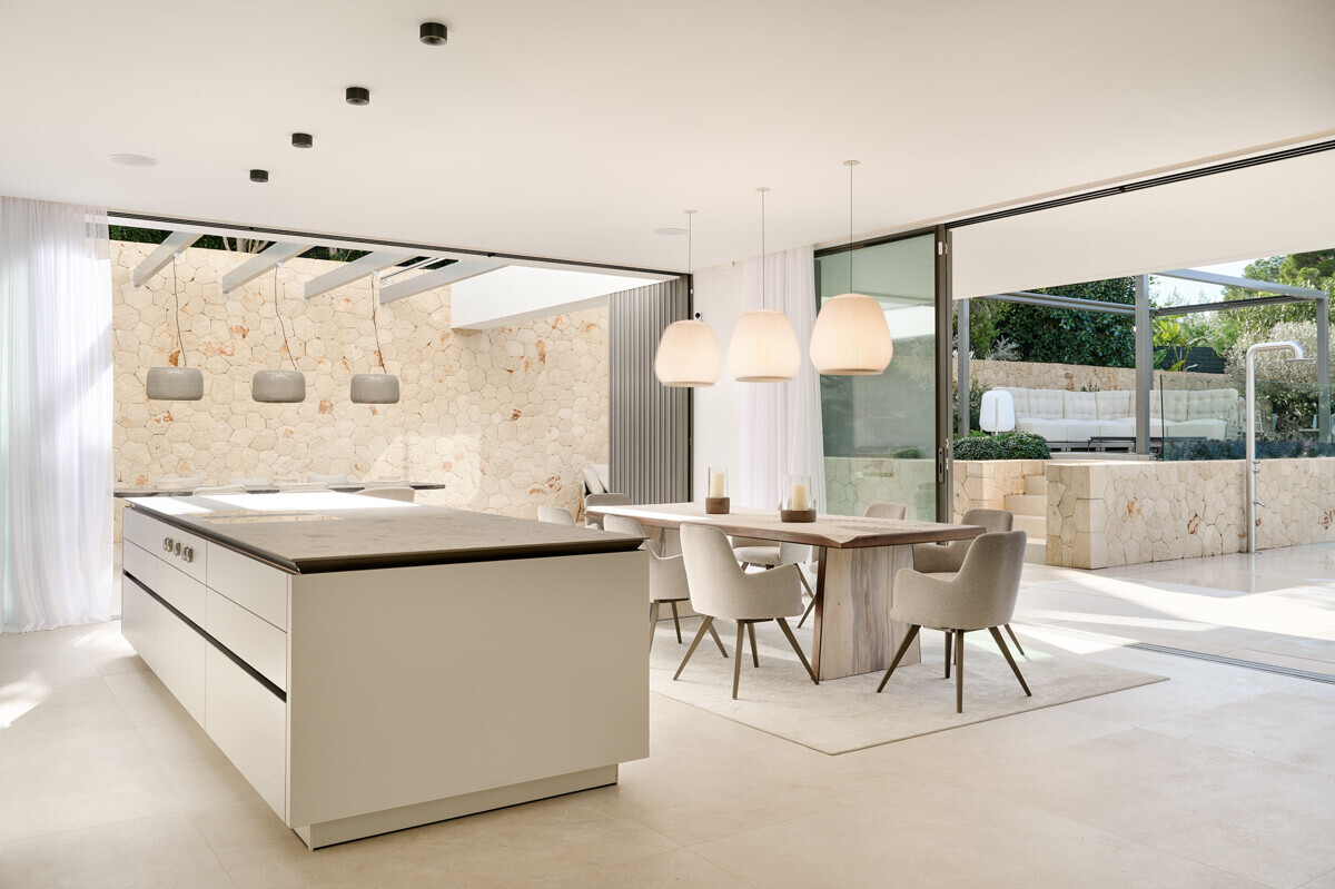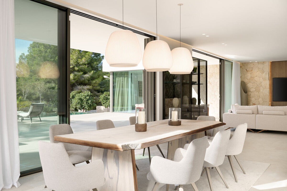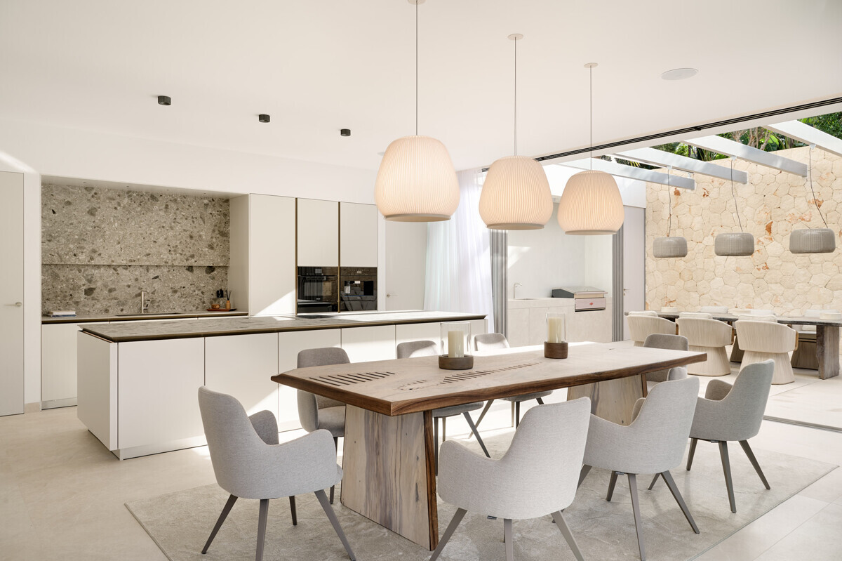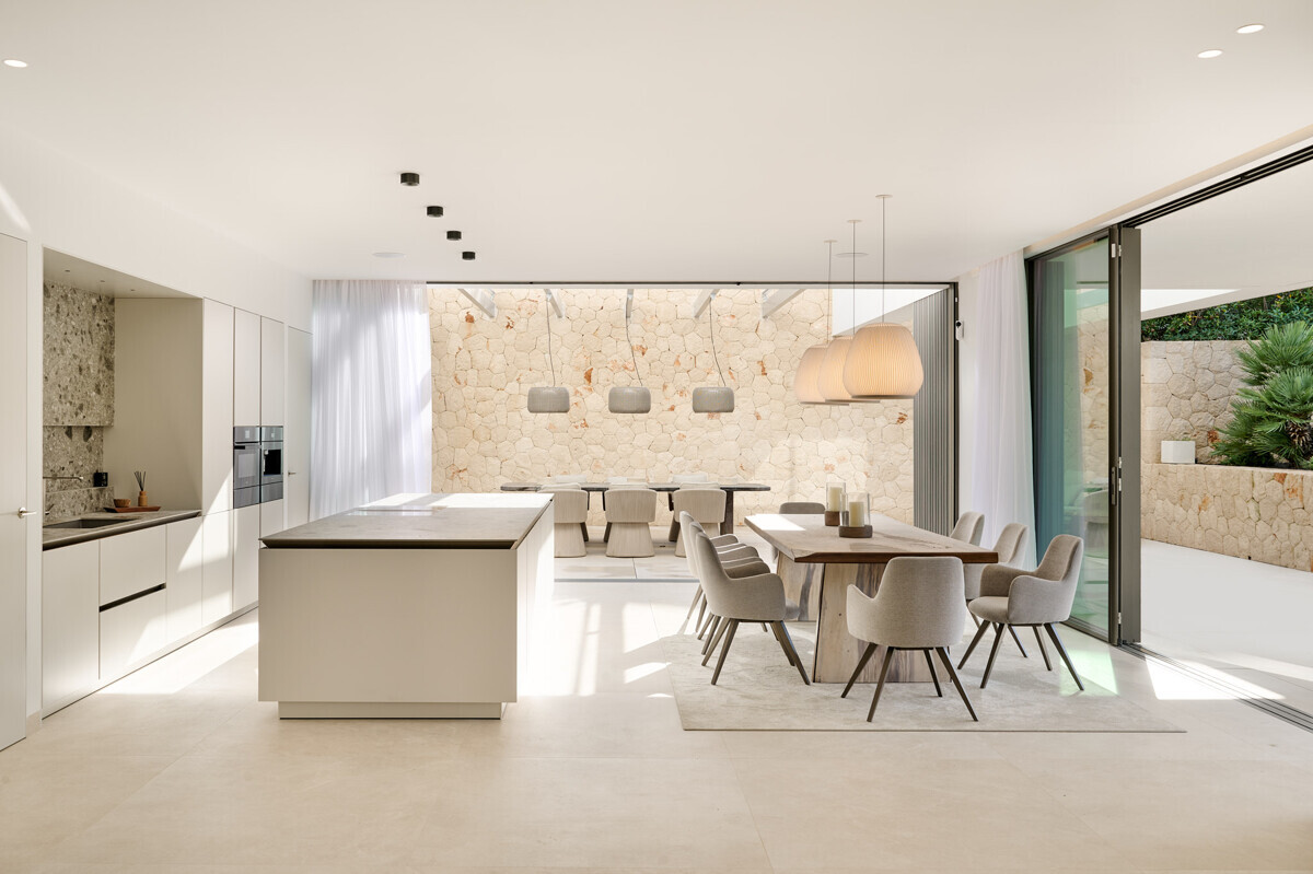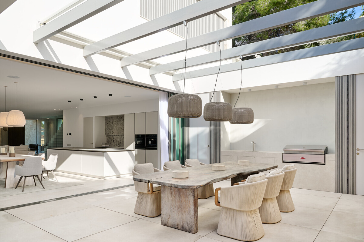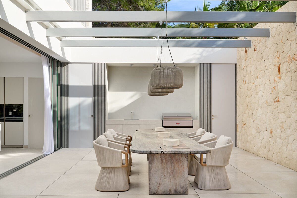 salón-comedor amplio y diáfano, cocina de diseño totalmente equipada con electrodomésticos Miele, cocina de preparación, aseo de invitados, 1 dormitorio principal con vestidor y baño en suite, acceso a la terraza cubierta, zona de estar, zona de piscina con terraza solárium, bonito jardín paisajístico.