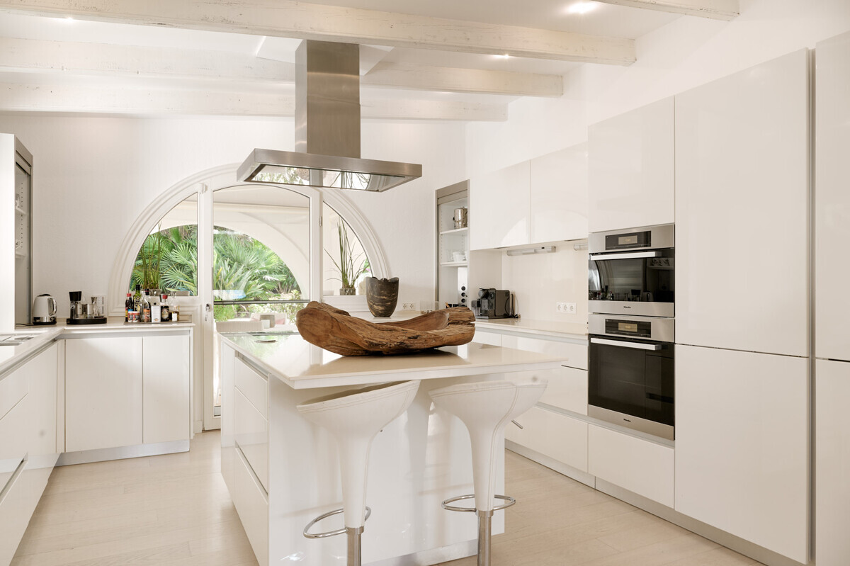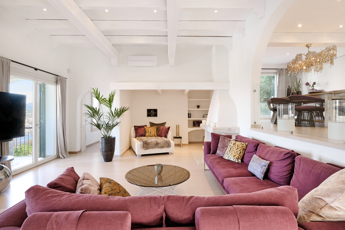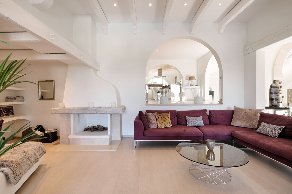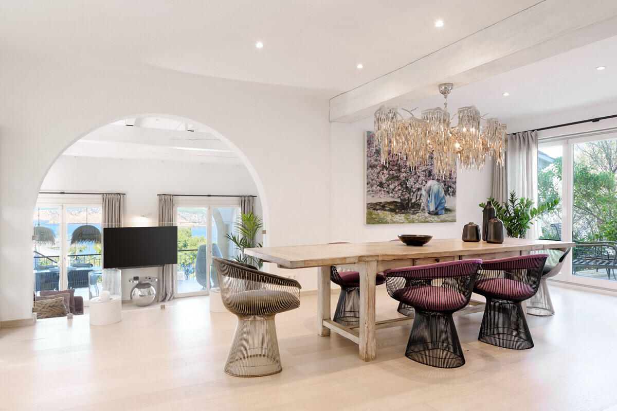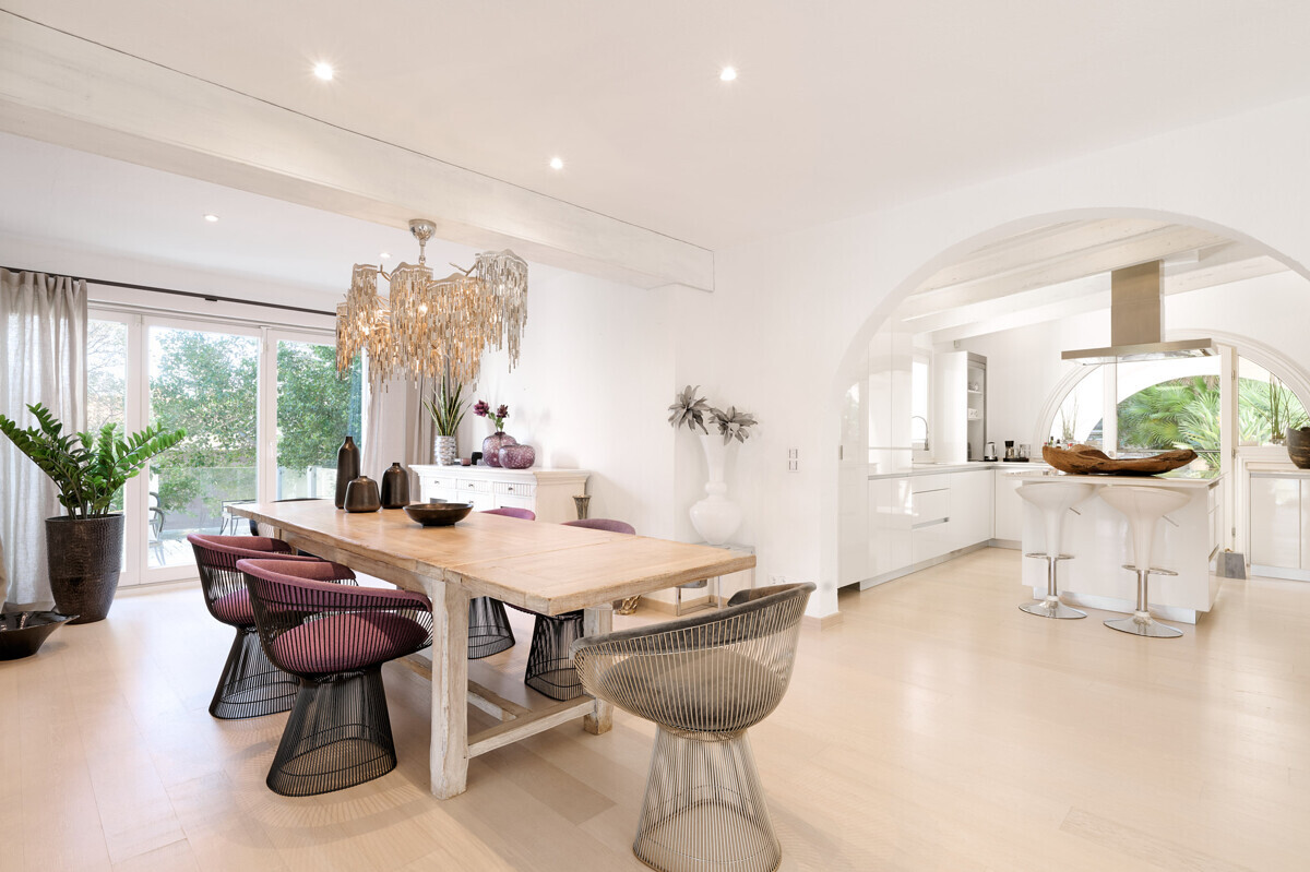 Salón comedor diáfano con chimenea, 1 dormitorio con baño en suite, aseo de invitados, cocina totalmente equipada con electrodomésticos Miele, acceso a la terraza cubierta y zona de piscina con solárium, barbacoa, casita de piscina con zona de estar.