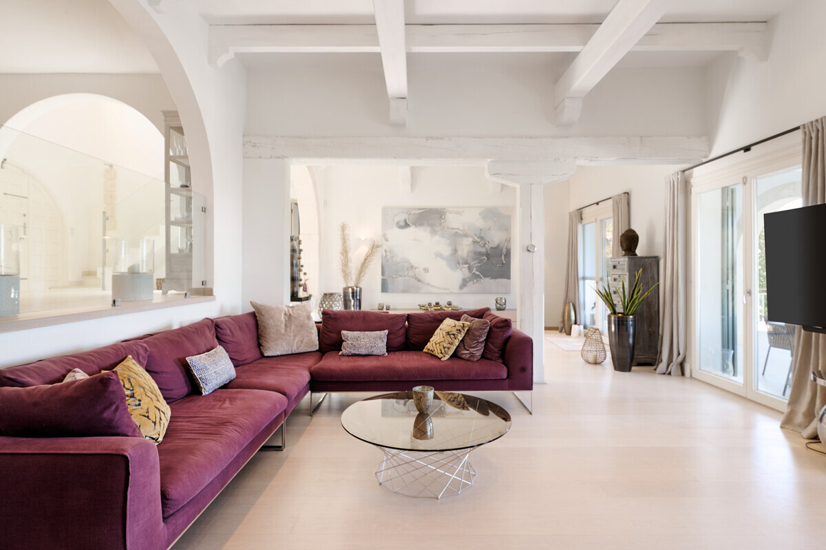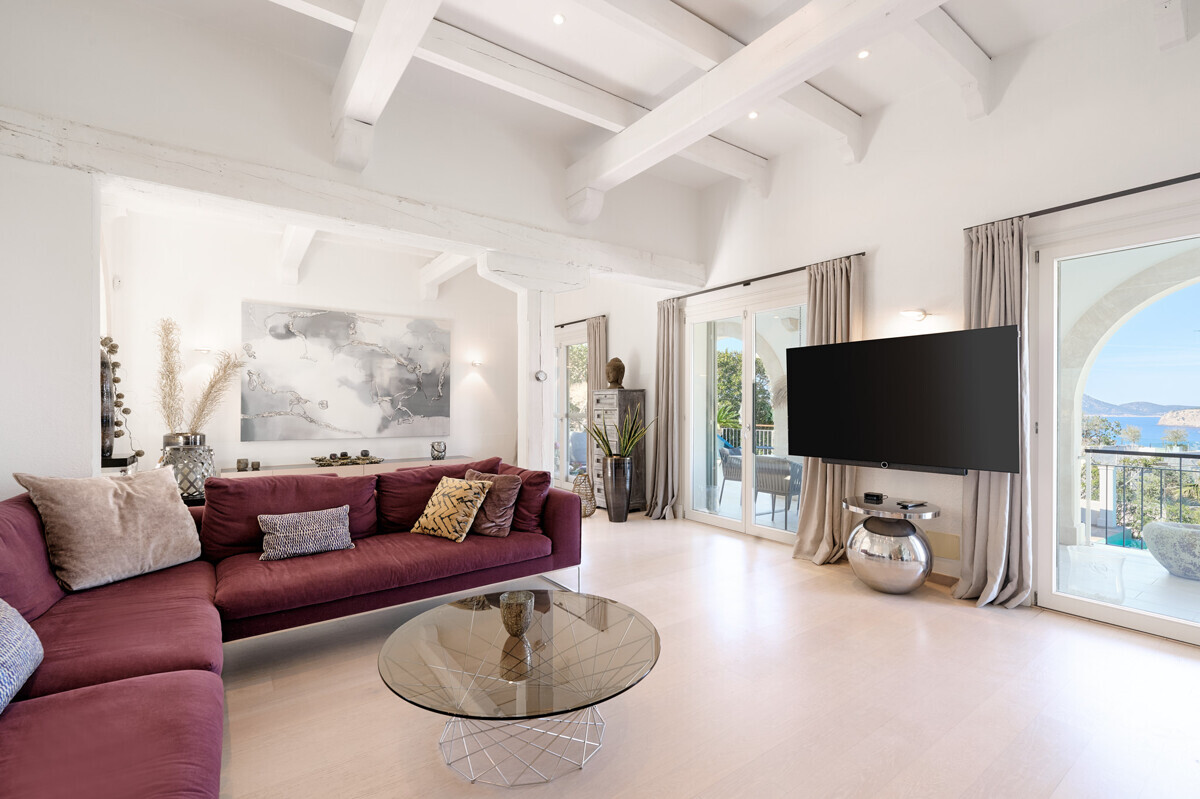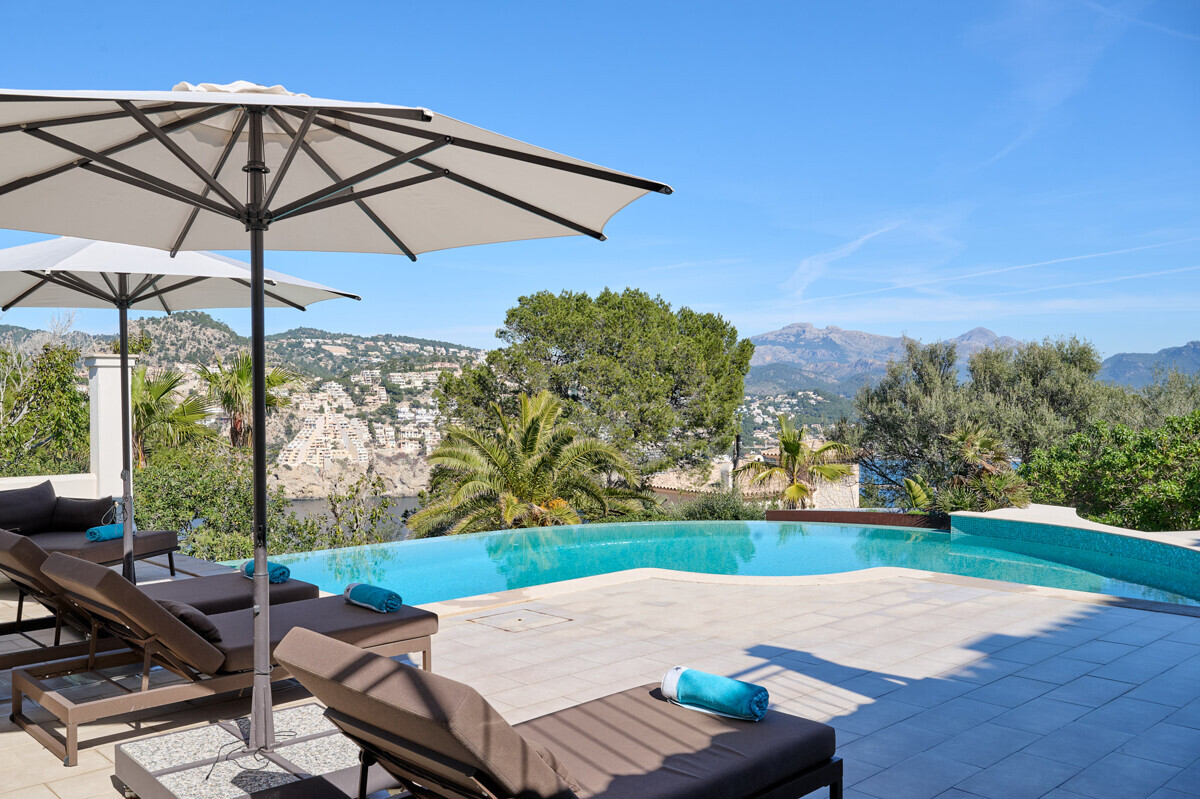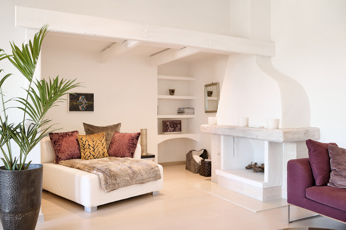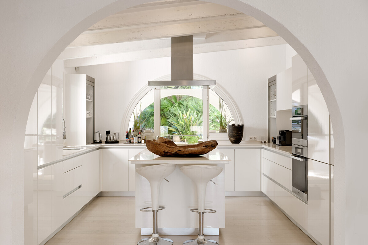 Salón comedor diáfano con chimenea, 1 dormitorio con baño en suite, aseo de invitados, cocina totalmente equipada con electrodomésticos Miele, acceso a la terraza cubierta y zona de piscina con solárium, barbacoa, casita de piscina con zona de estar.