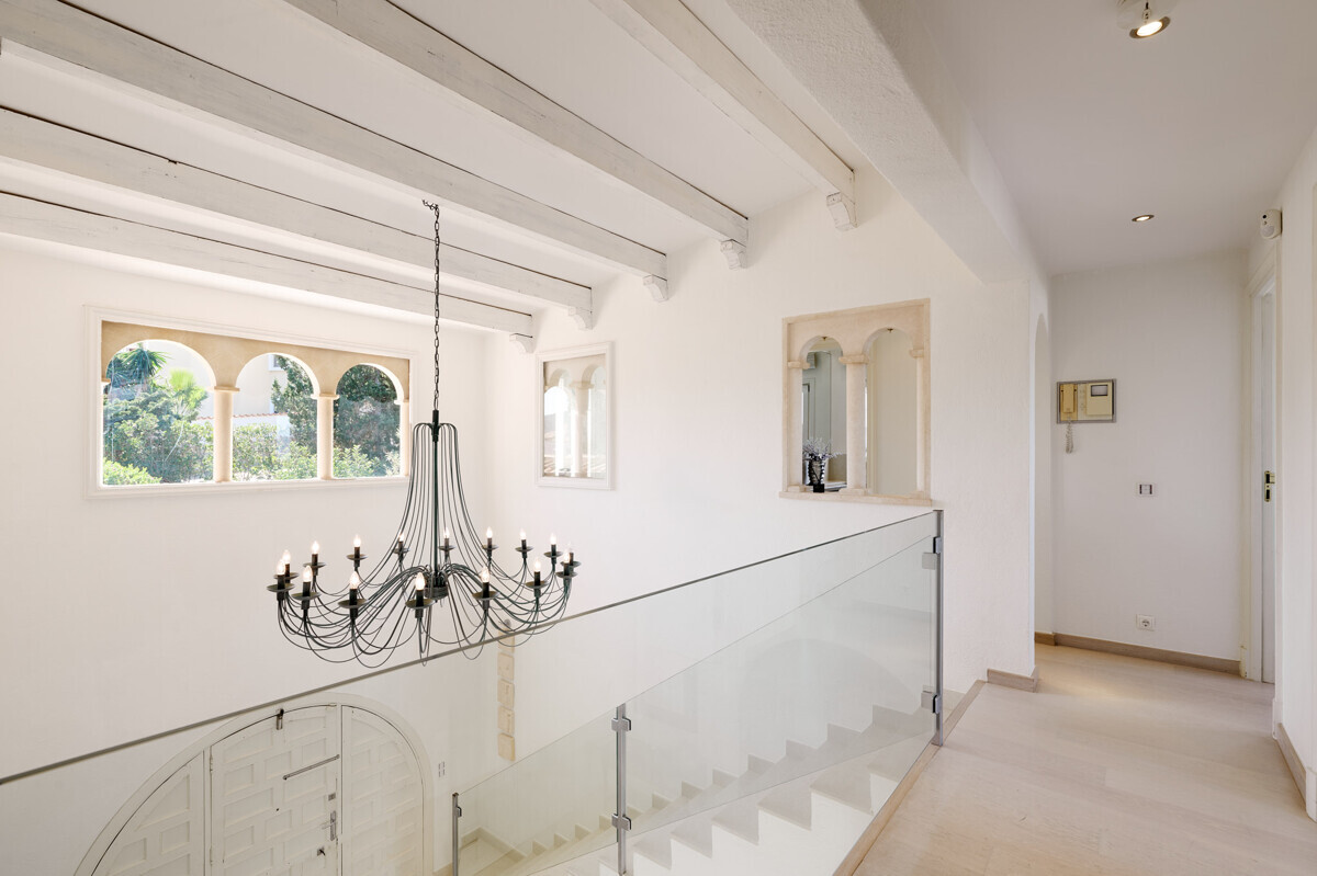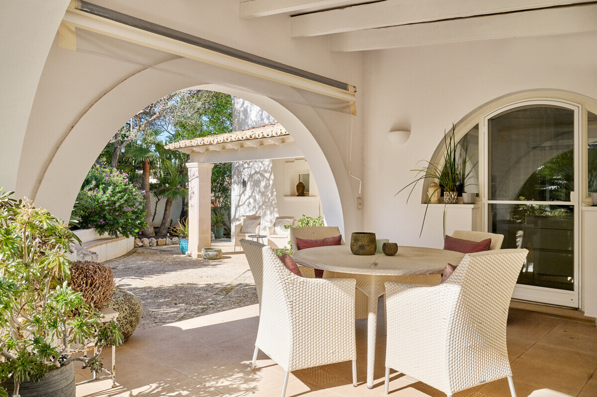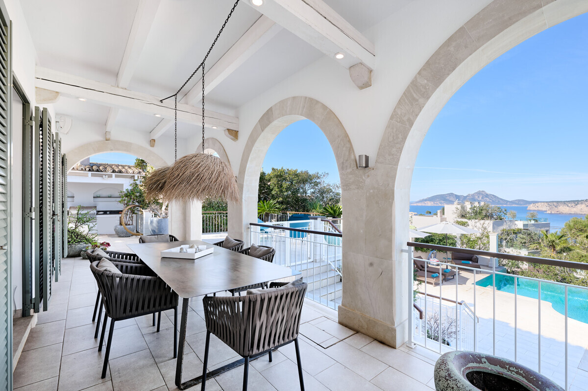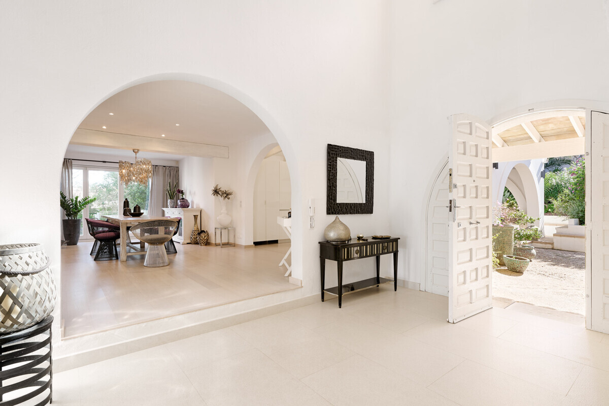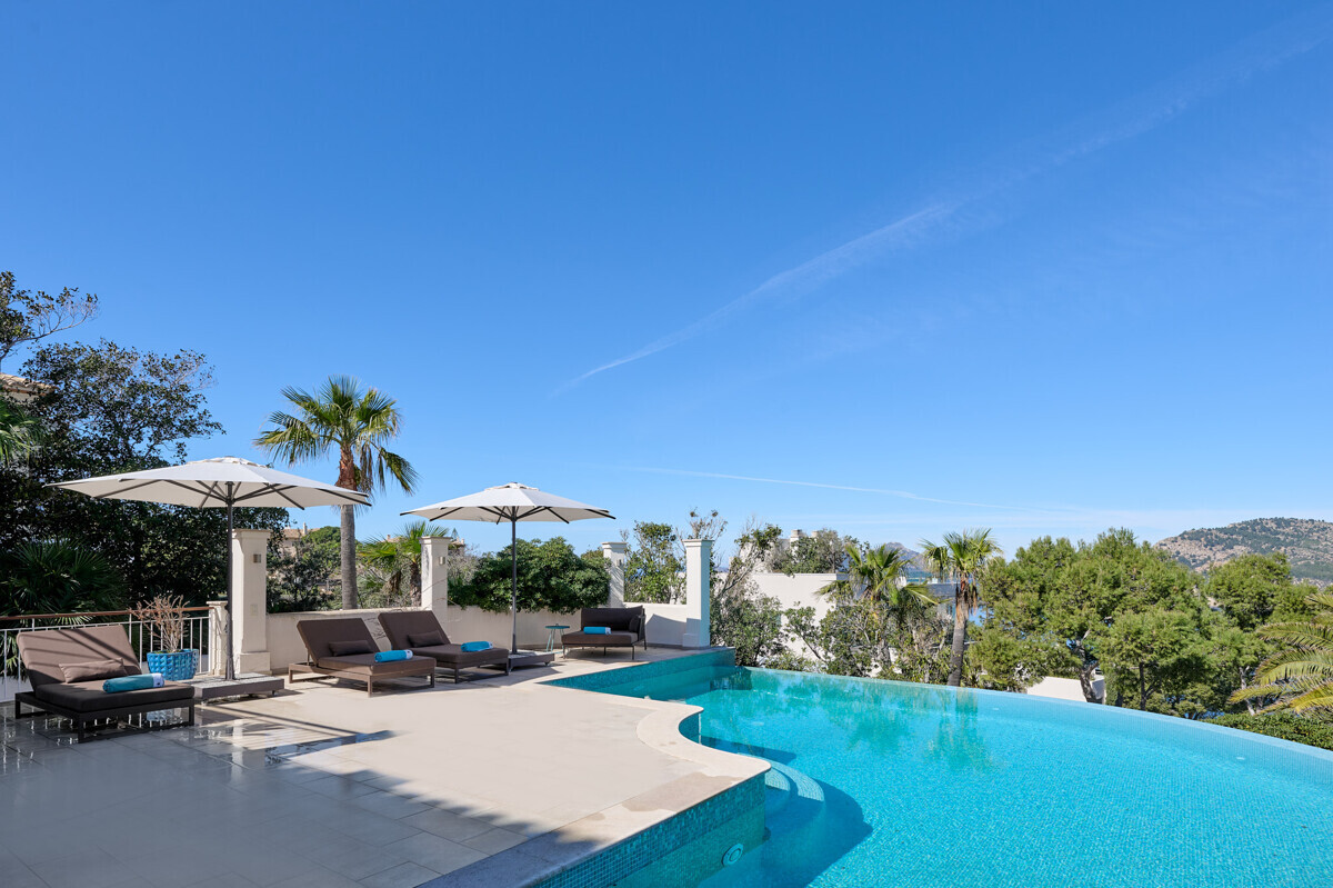 Salón comedor diáfano con chimenea, 1 dormitorio con baño en suite, aseo de invitados, cocina totalmente equipada con electrodomésticos Miele, acceso a la terraza cubierta y zona de piscina con solárium, barbacoa, casita de piscina con zona de estar.
