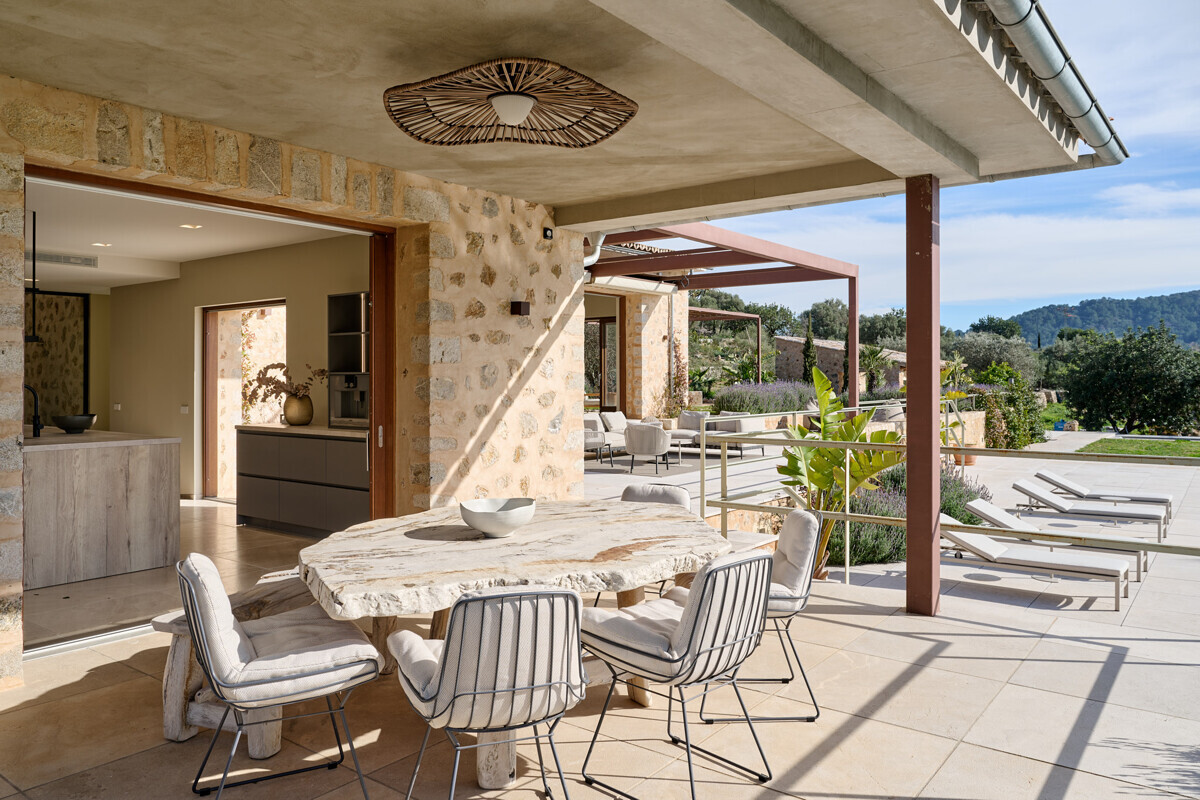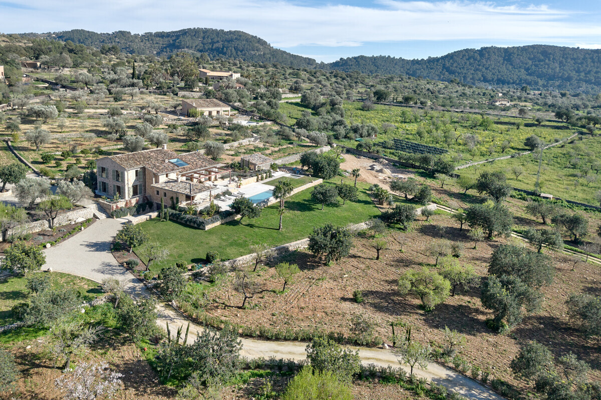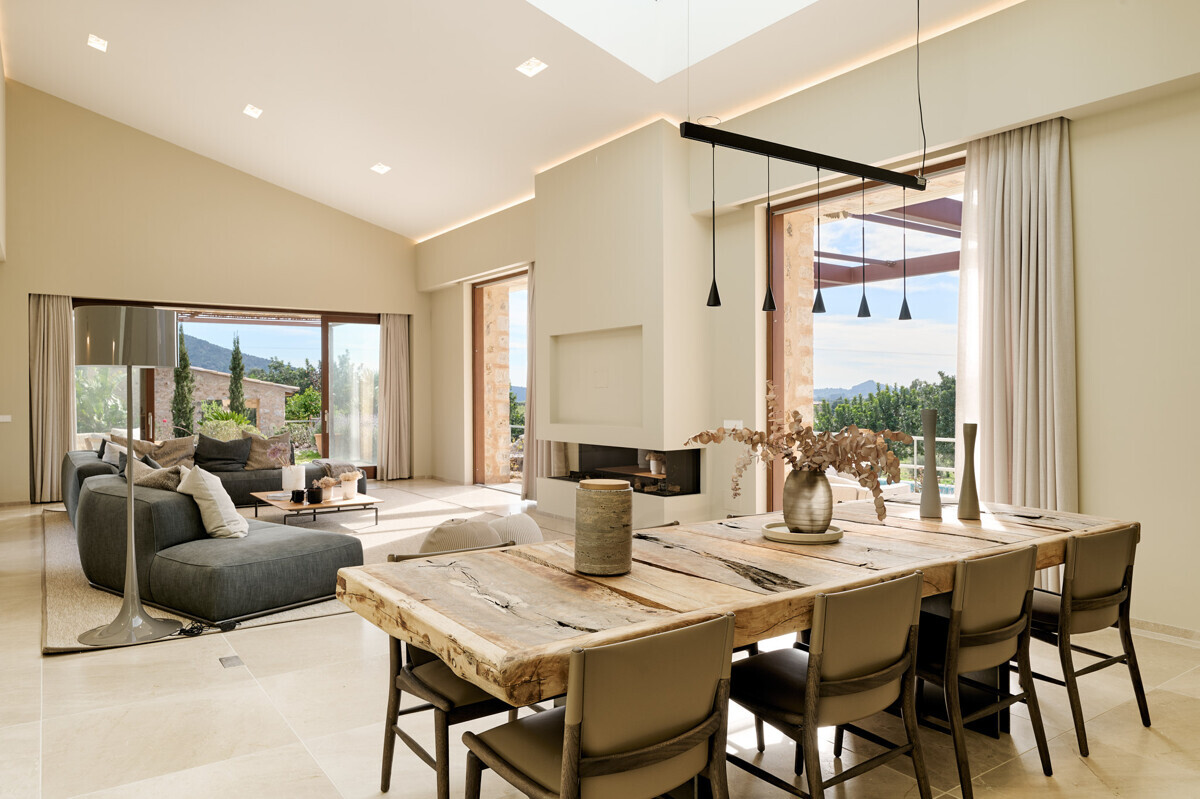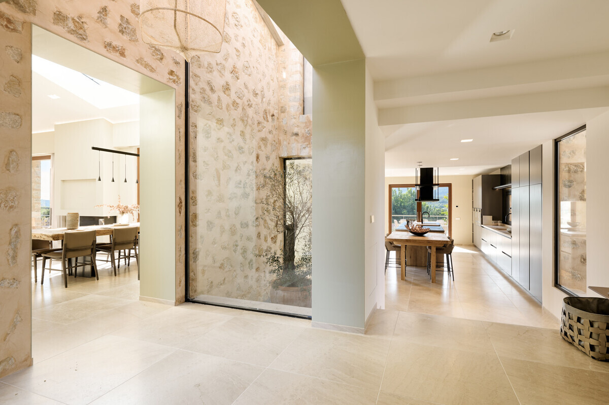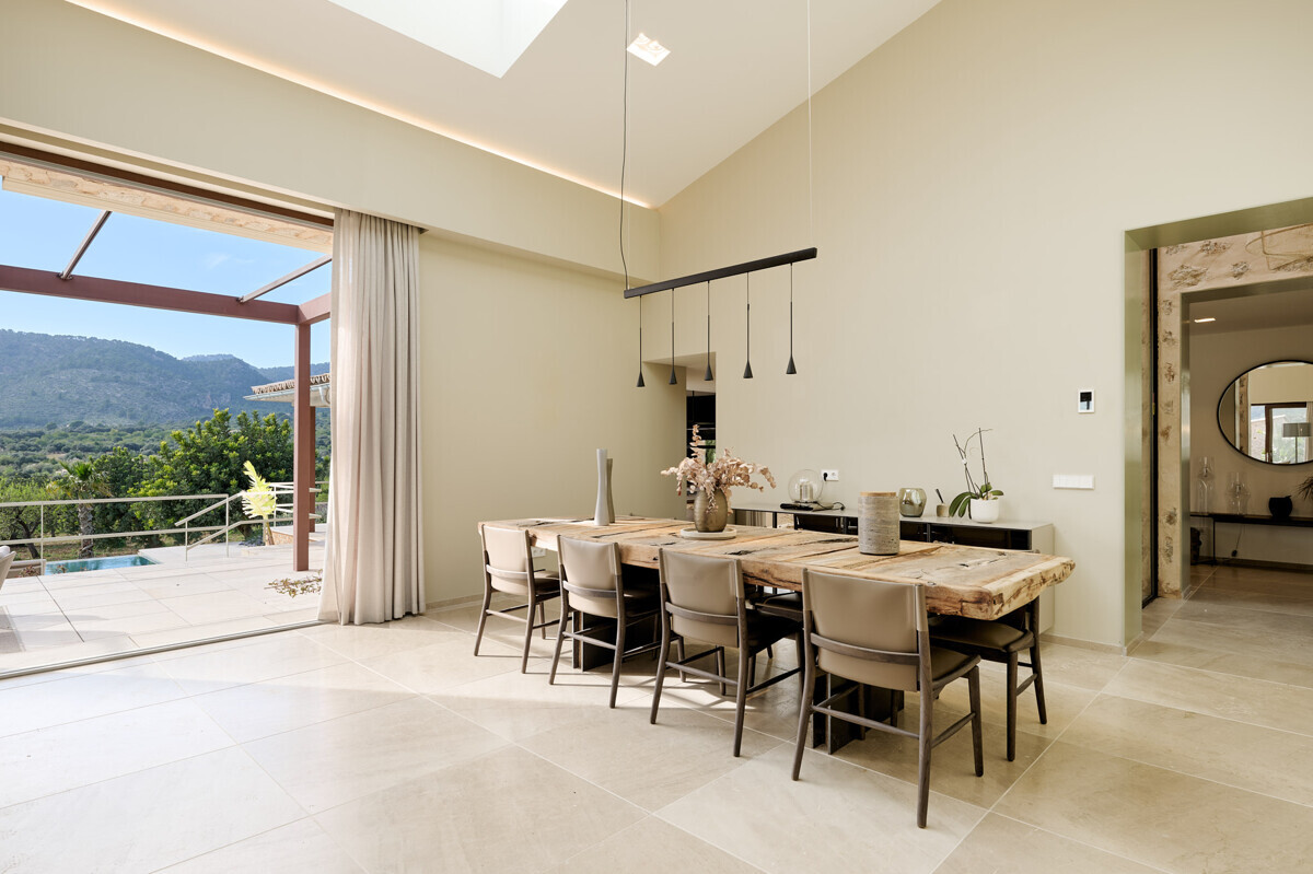 luminosa zona de entrada, cocina abierta totalmente equipada con electrodomésticos Gaggenau y zona de comedor, salón-comedor abierto con chimenea, 1 dormitorio con baño en suite, 1 dormitorio con vestidor y baño en suite, acceso a la terraza con piscina, jacuzzi, barbacoa, amplio jardín mediterráneo bellamente ajardinado con olivos y árboles frutales.