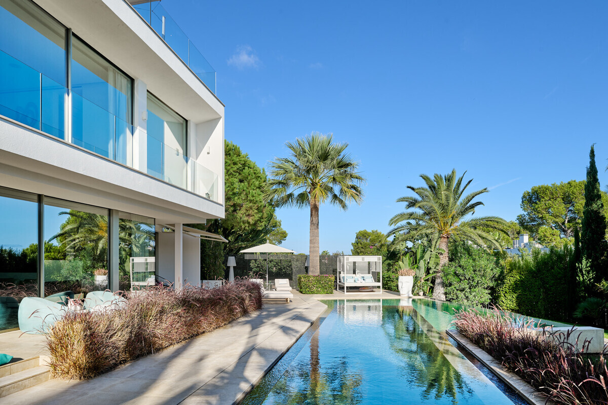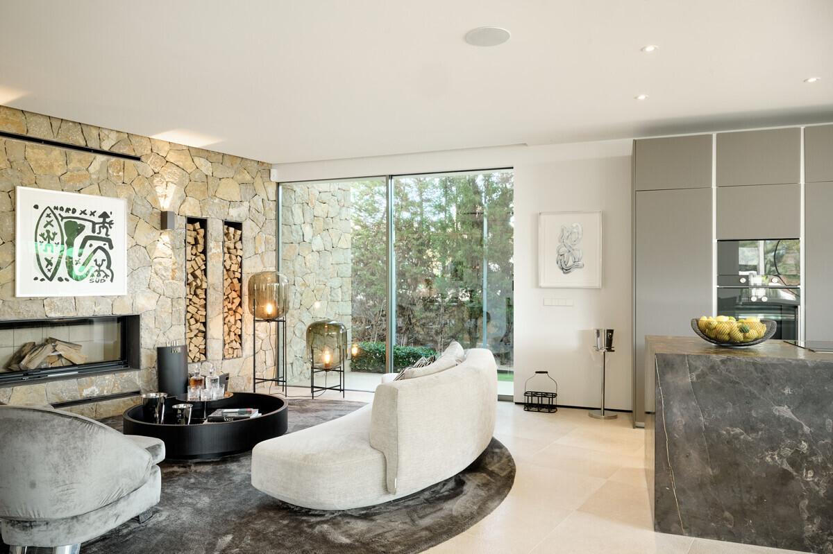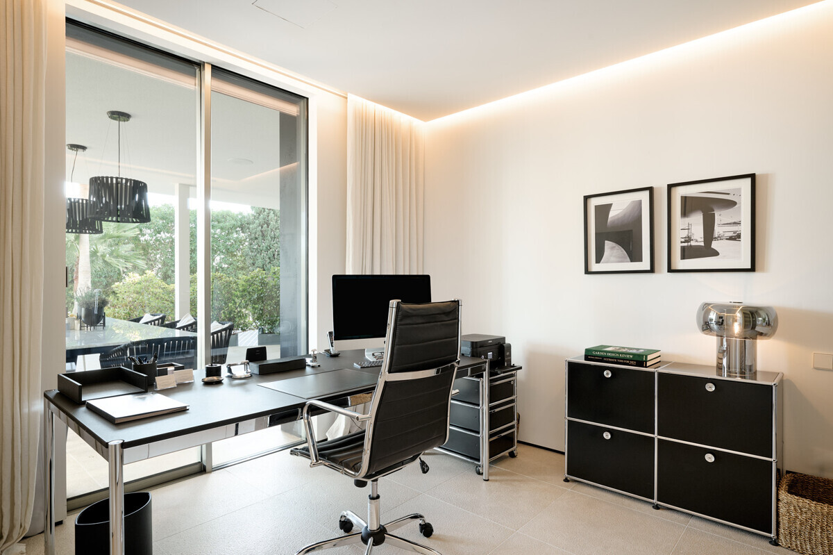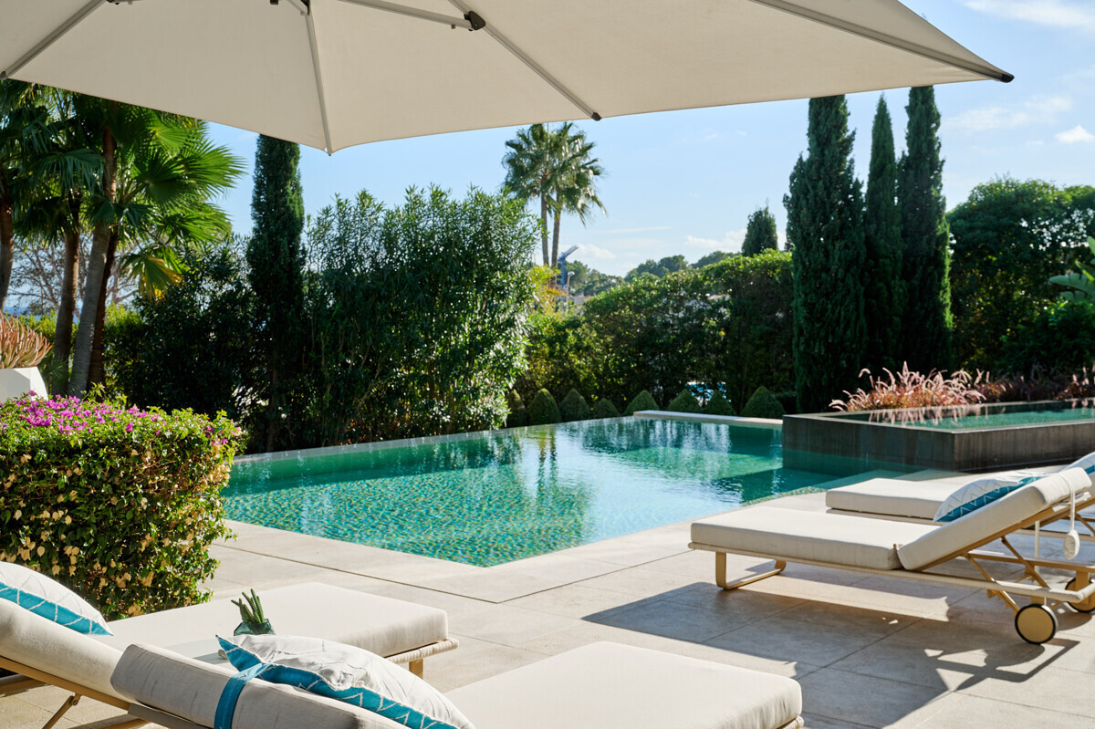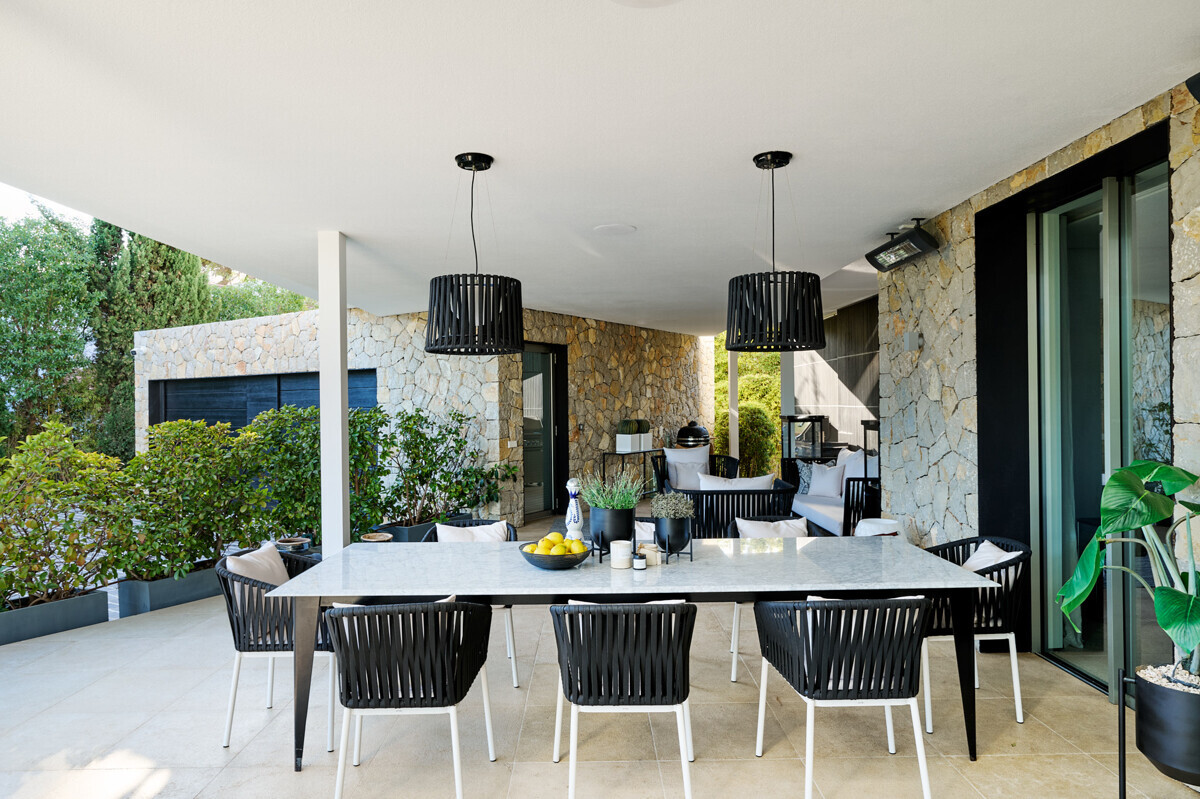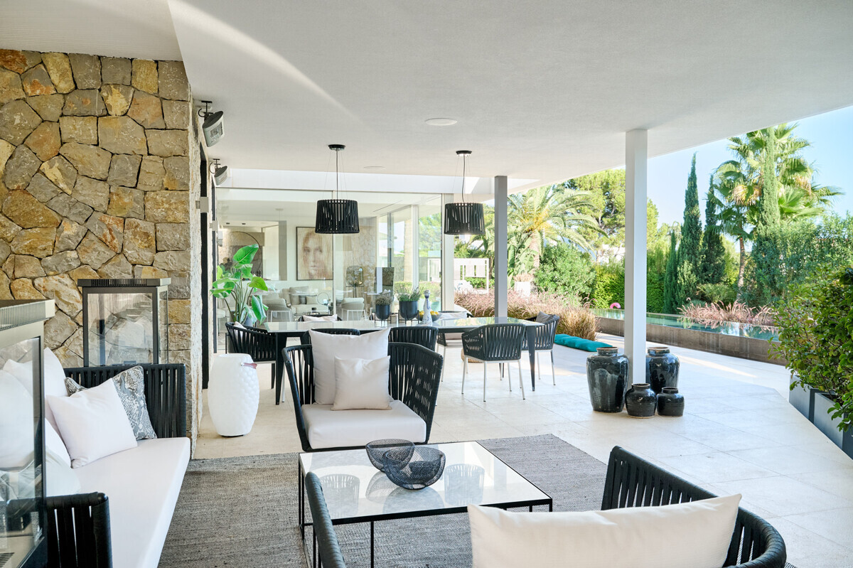 amplio y luminoso salón-comedor, elegante zona de estar con chimenea, moderna cocina americana con electrodomésticos Gaggenau, despacho con cuarto de baño que también puede utilizarse como dormitorio, aseo de invitados, acceso directo a la terraza cubierta, barbacoa, zona de piscina con dos piscinas, terraza solárium y bonito jardín mediterráneo