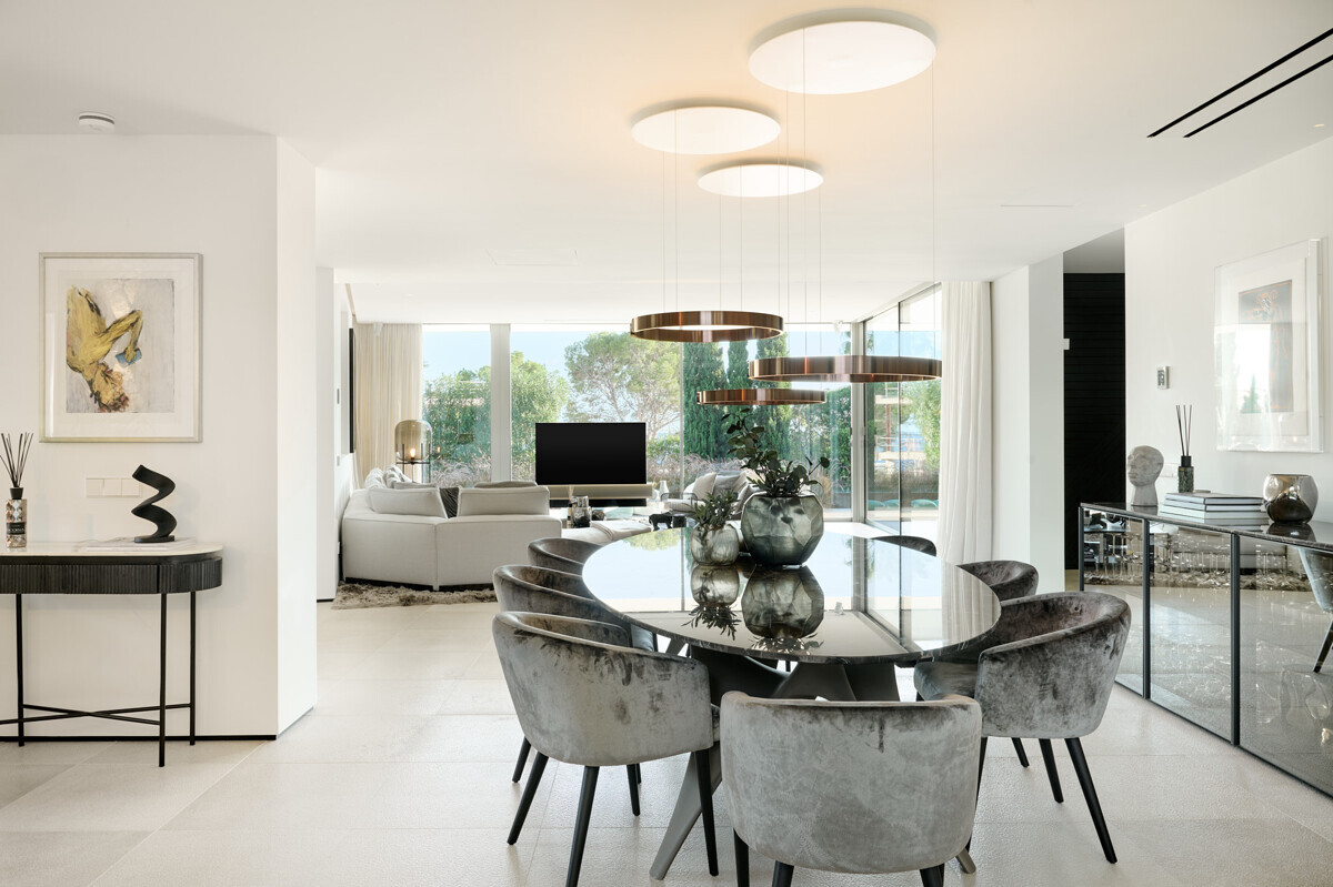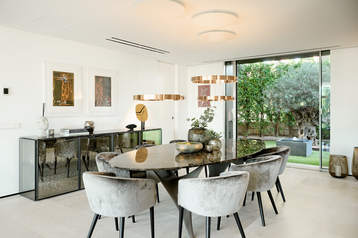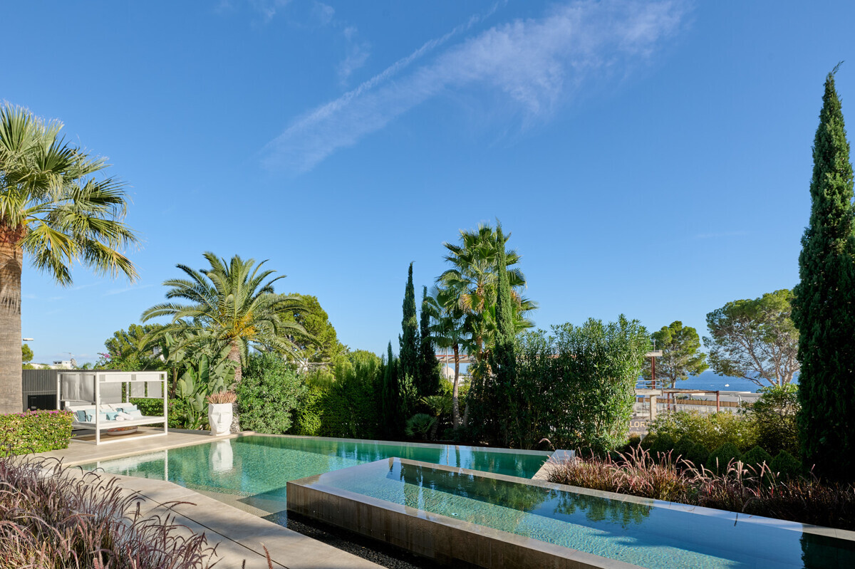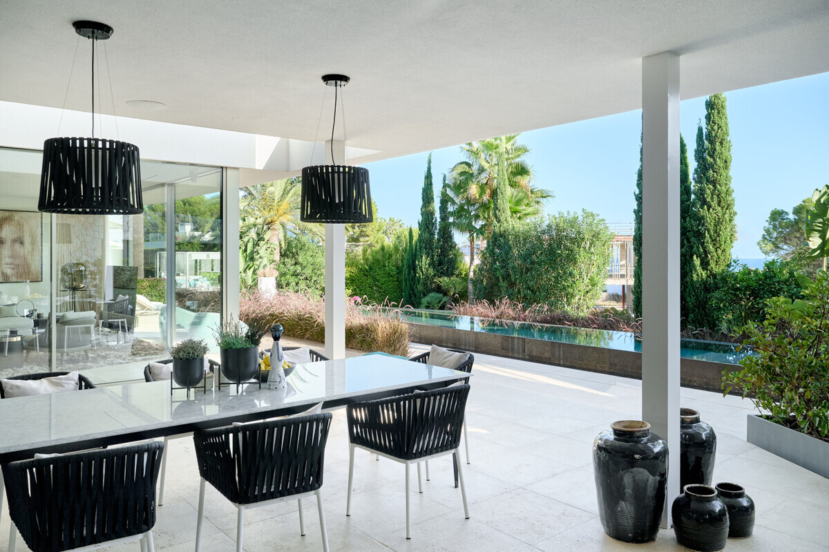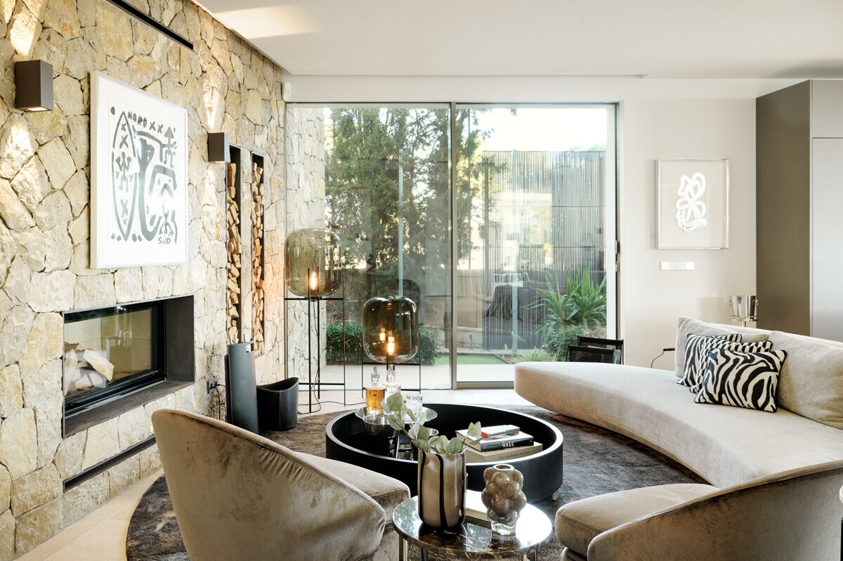 amplio y luminoso salón-comedor, elegante zona de estar con chimenea, moderna cocina americana con electrodomésticos Gaggenau, despacho con cuarto de baño que también puede utilizarse como dormitorio, aseo de invitados, acceso directo a la terraza cubierta, barbacoa, zona de piscina con dos piscinas, terraza solárium y bonito jardín mediterráneo