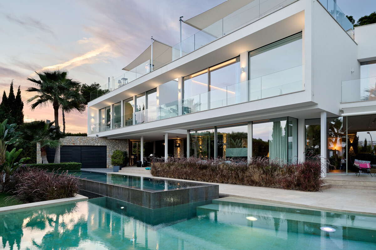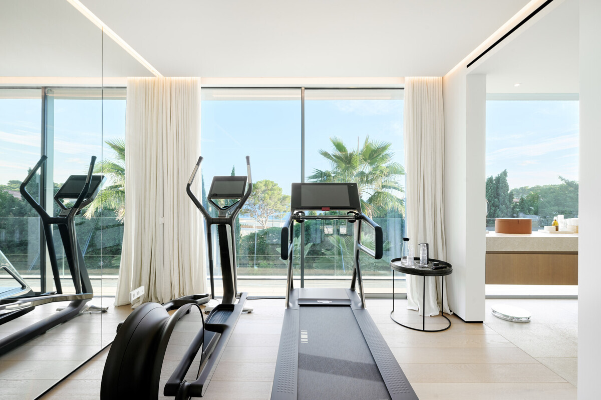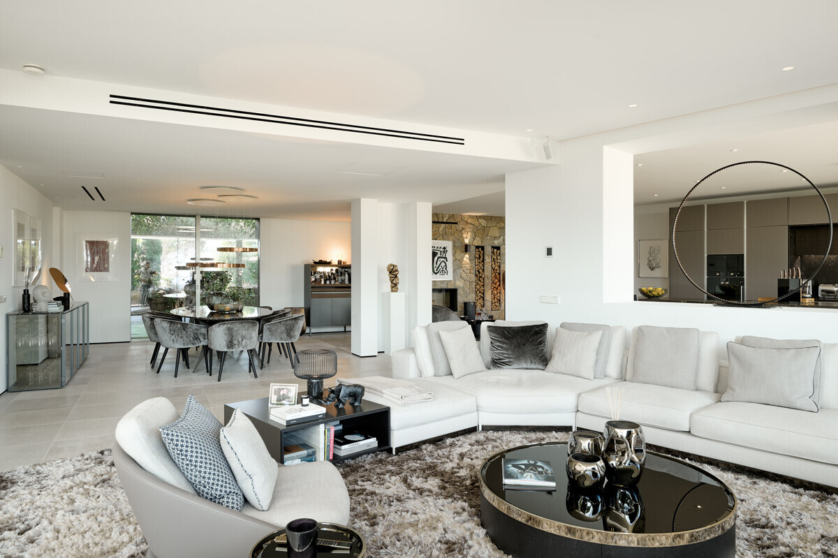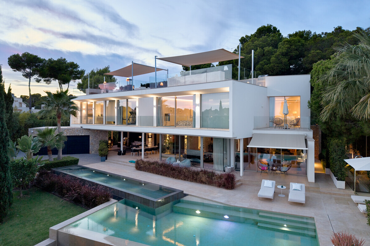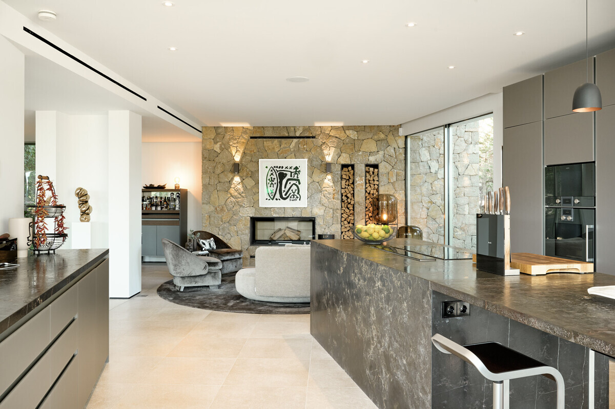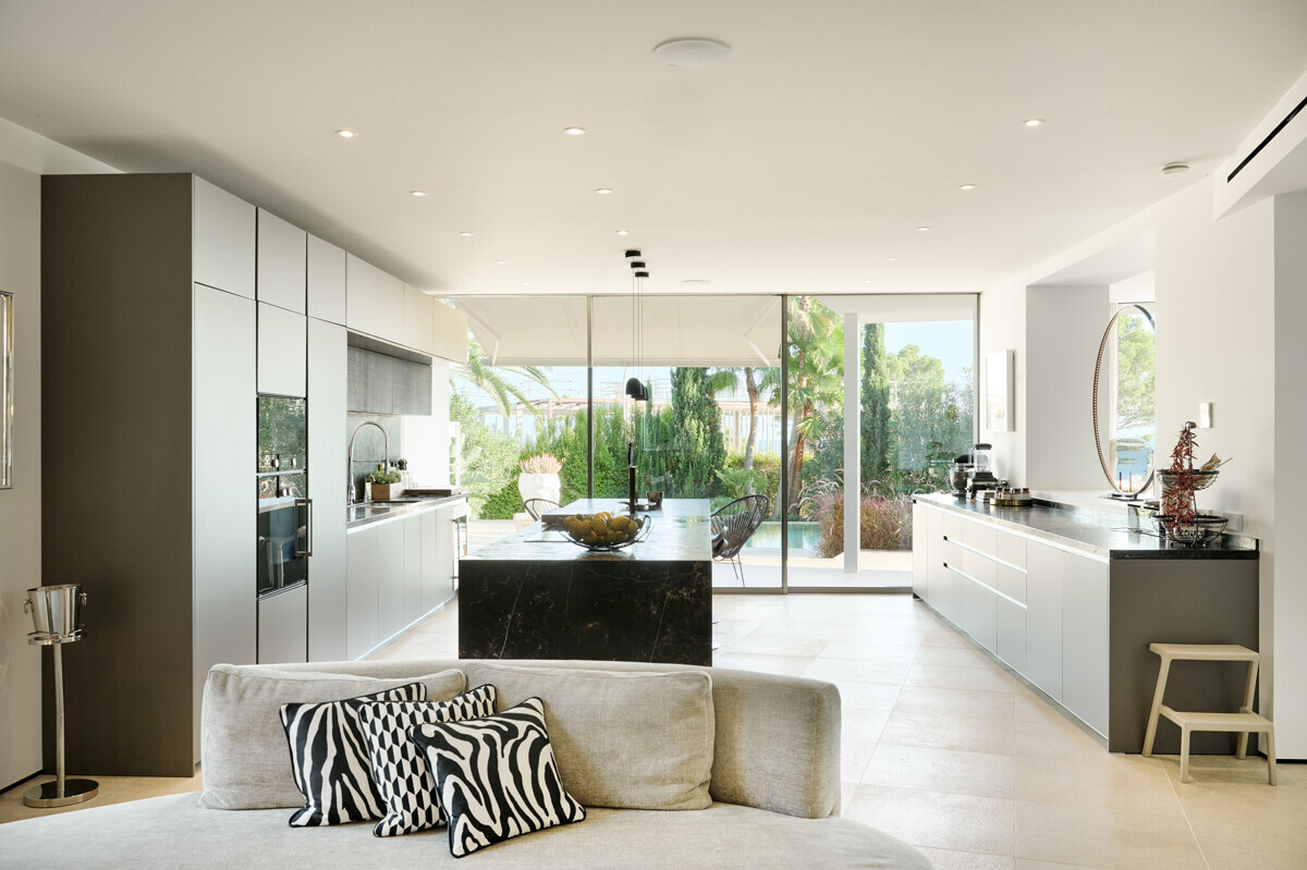 amplio y luminoso salón-comedor, elegante zona de estar con chimenea, moderna cocina americana con electrodomésticos Gaggenau, despacho con cuarto de baño que también puede utilizarse como dormitorio, aseo de invitados, acceso directo a la terraza cubierta, barbacoa, zona de piscina con dos piscinas, terraza solárium y bonito jardín mediterráneo