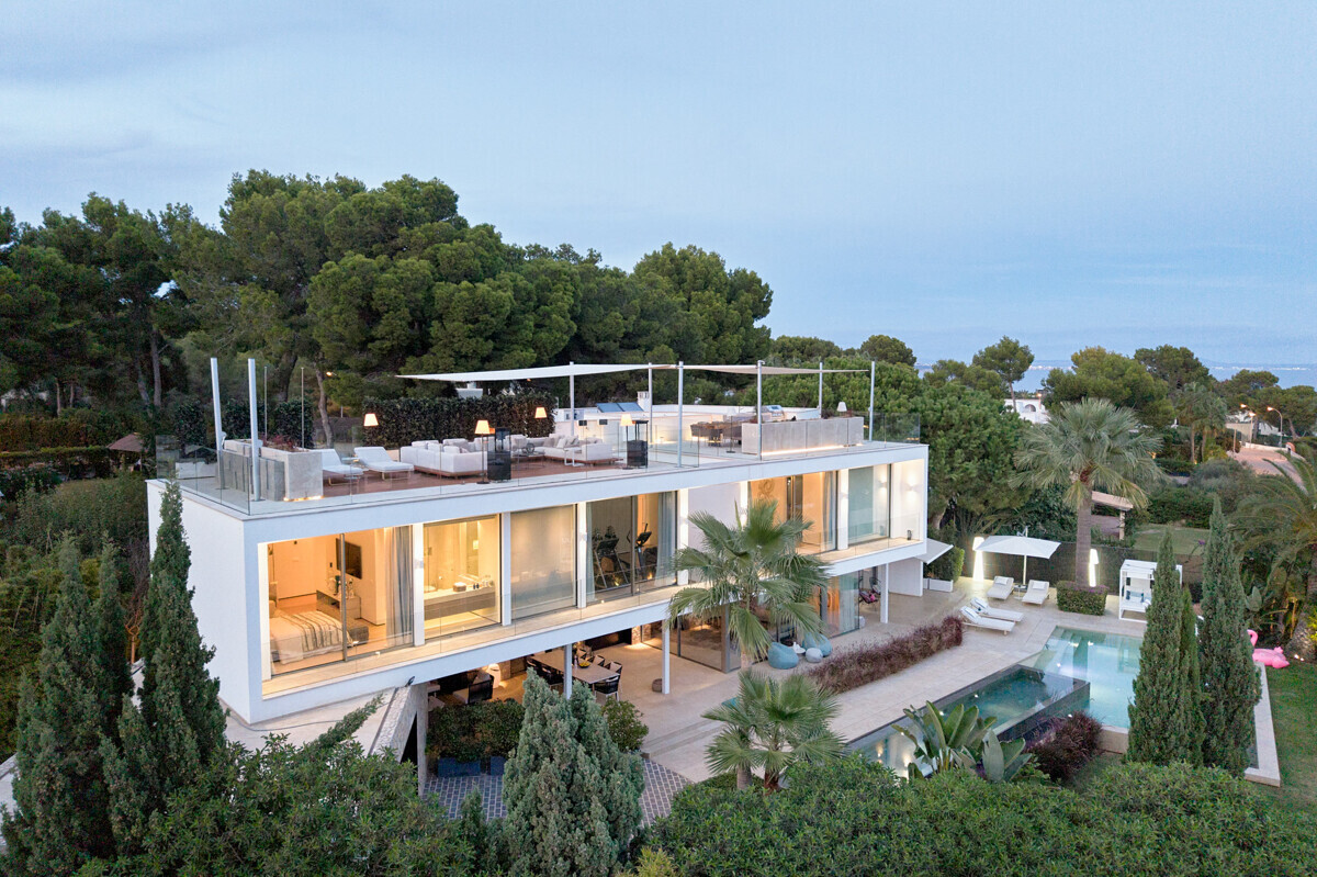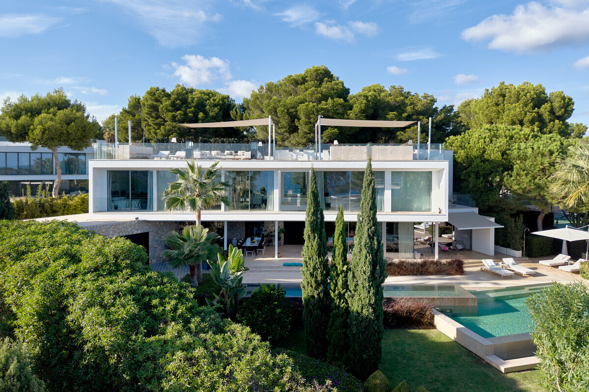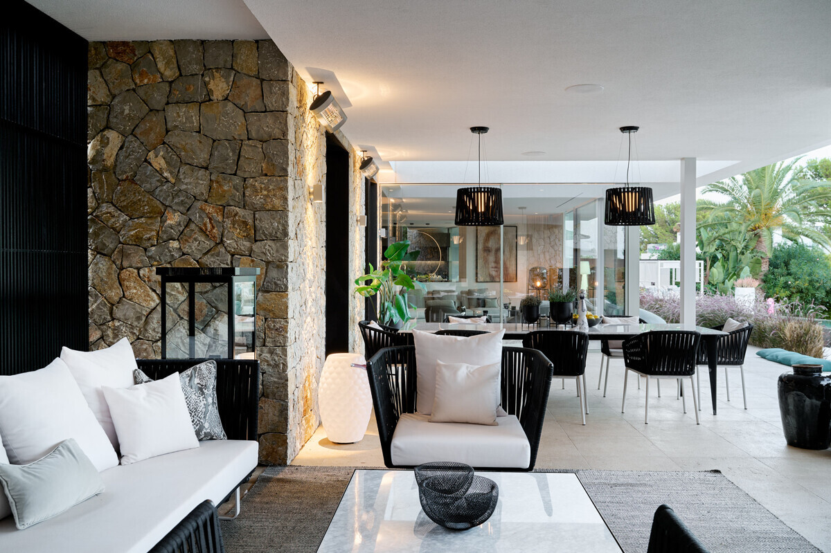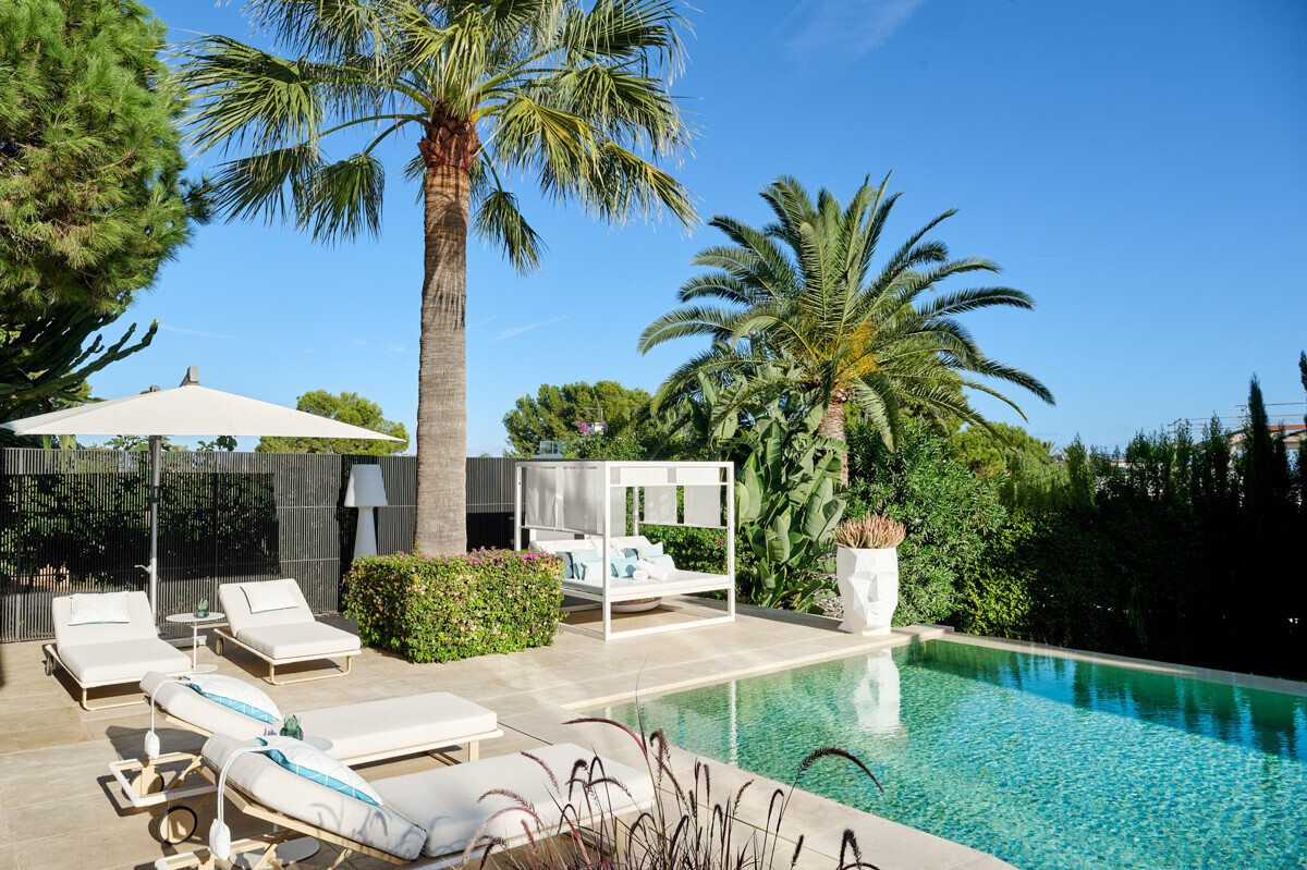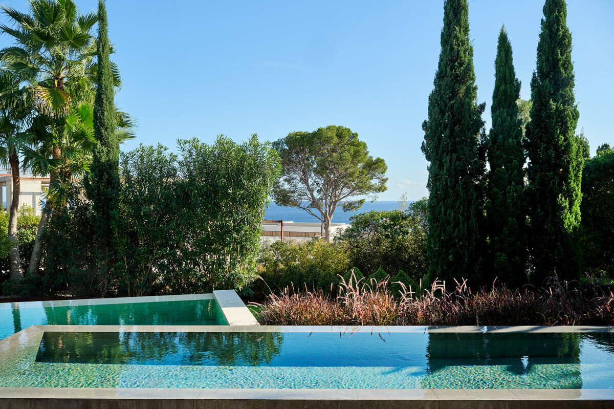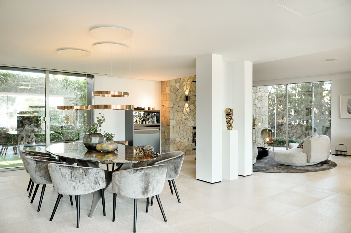amplio y luminoso salón-comedor, elegante zona de estar con chimenea, moderna cocina americana con electrodomésticos Gaggenau, despacho con cuarto de baño que también puede utilizarse como dormitorio, aseo de invitados, acceso directo a la terraza cubierta, barbacoa, zona de piscina con dos piscinas, terraza solárium y bonito jardín mediterráneo