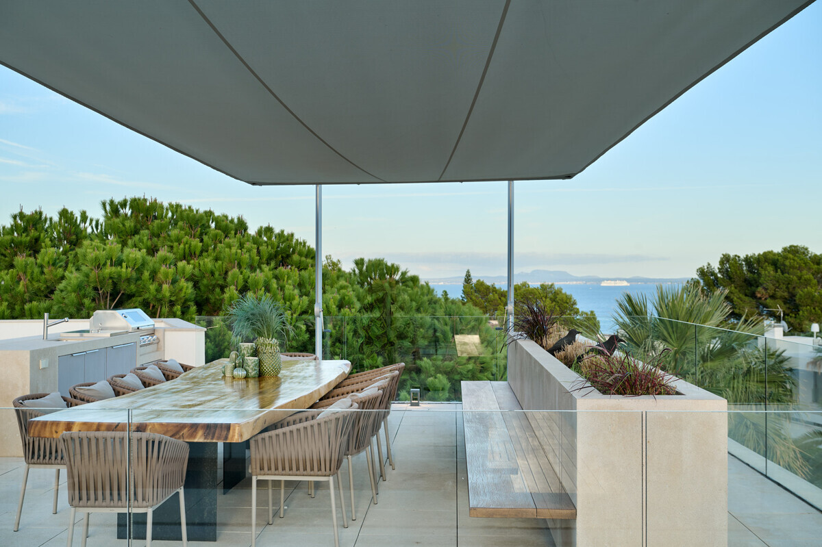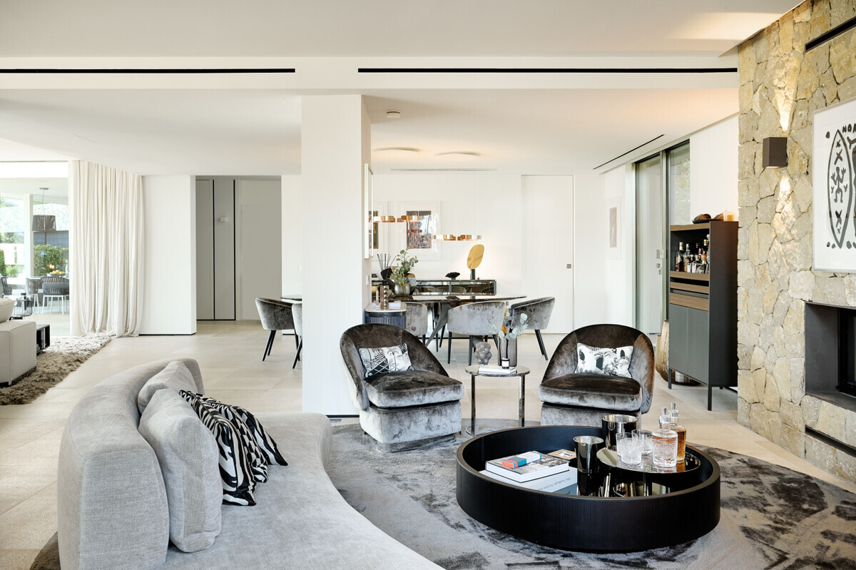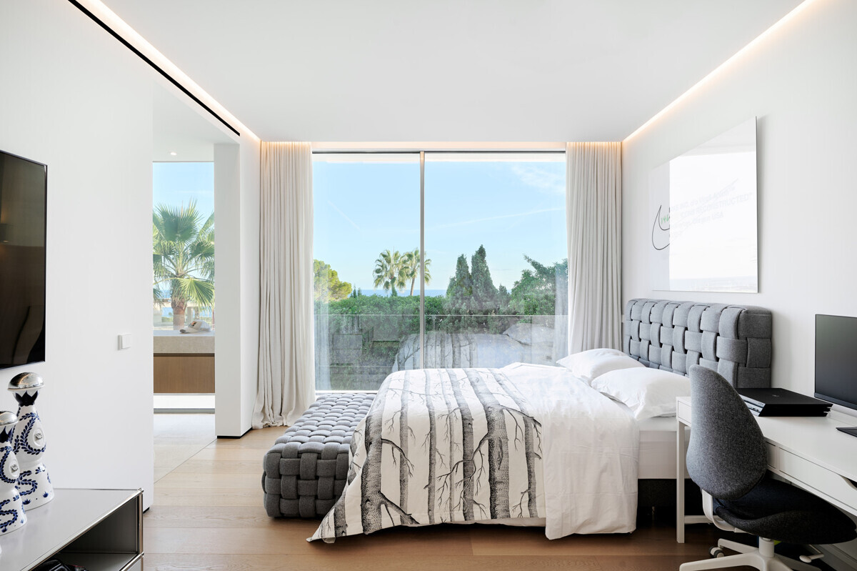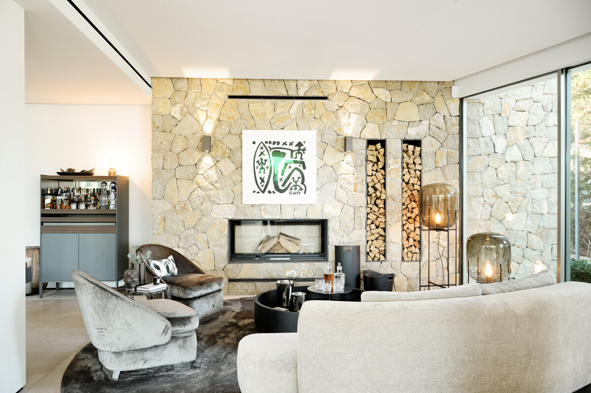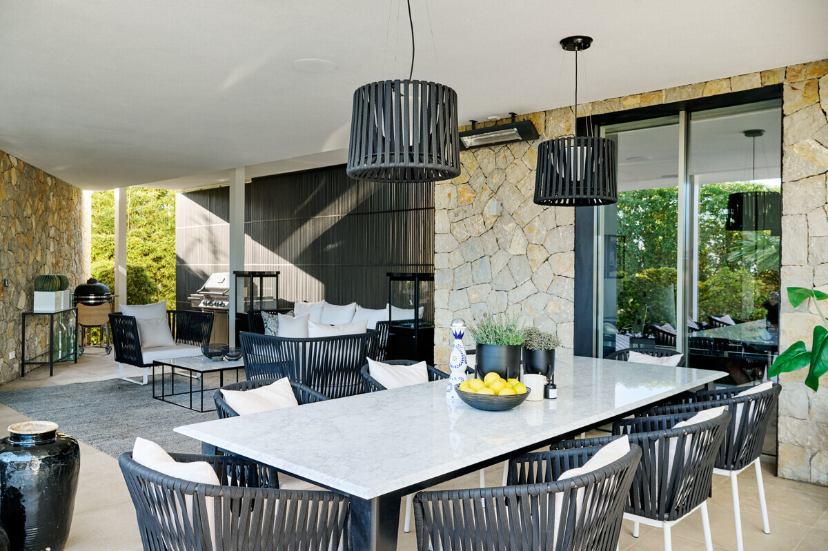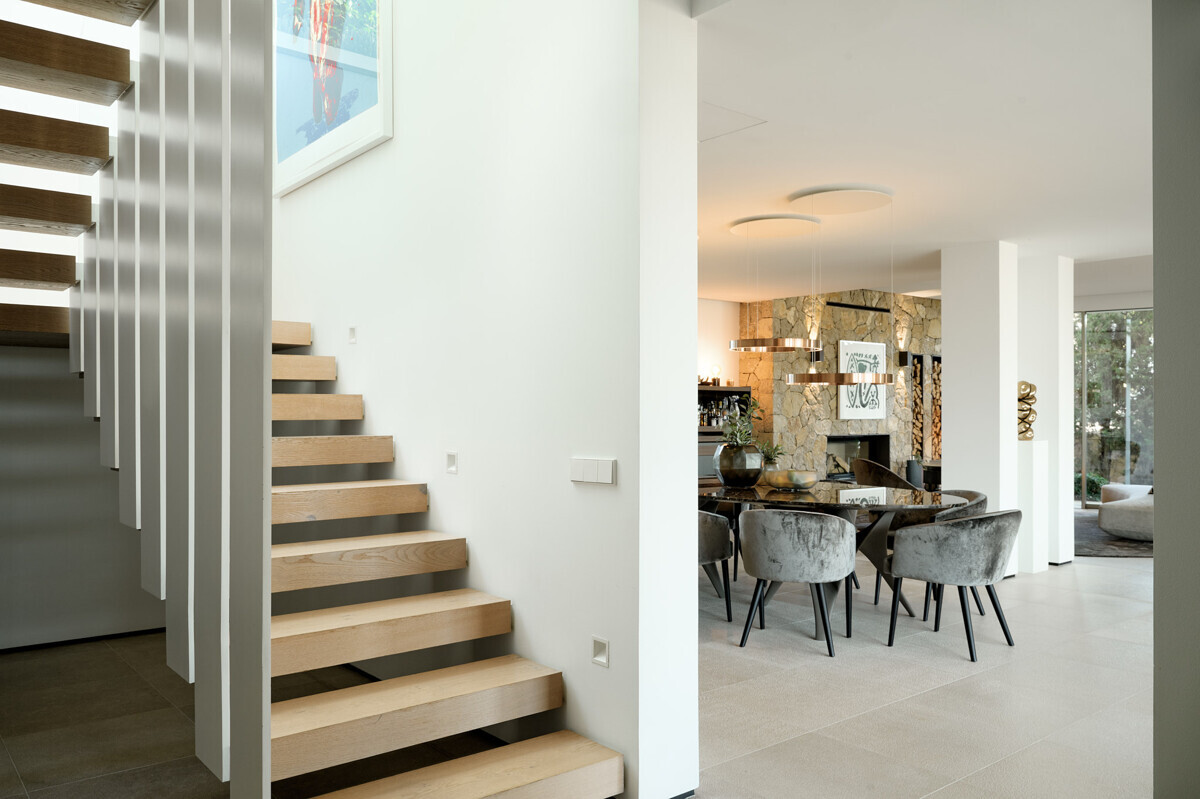 amplio y luminoso salón-comedor, elegante zona de estar con chimenea, moderna cocina americana con electrodomésticos Gaggenau, despacho con cuarto de baño que también puede utilizarse como dormitorio, aseo de invitados, acceso directo a la terraza cubierta, barbacoa, zona de piscina con dos piscinas, terraza solárium y bonito jardín mediterráneo