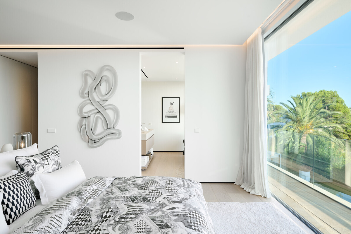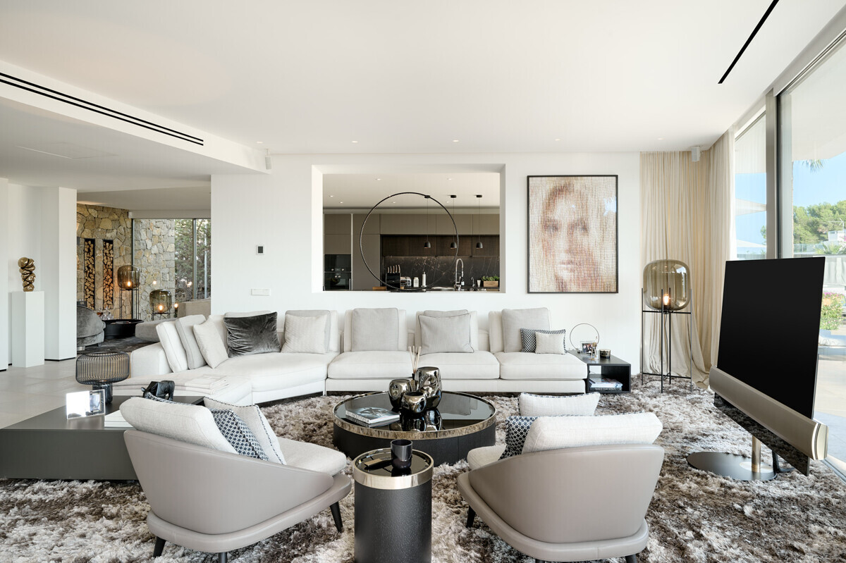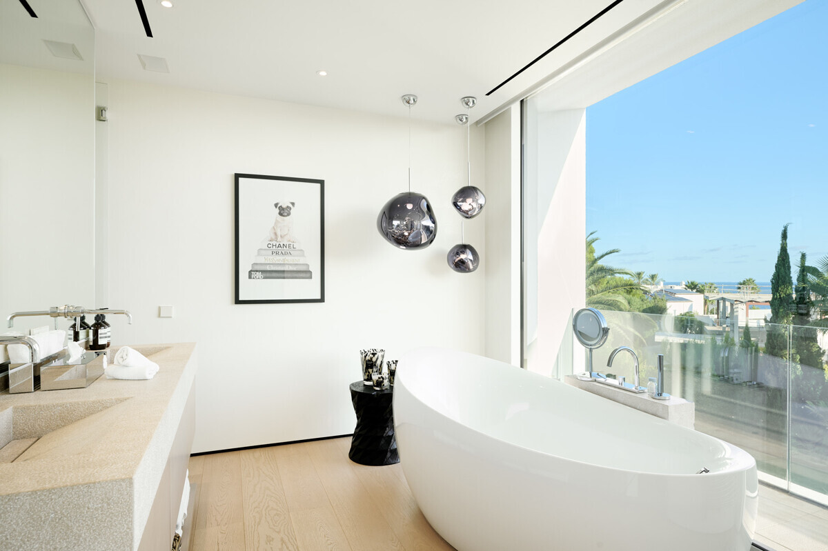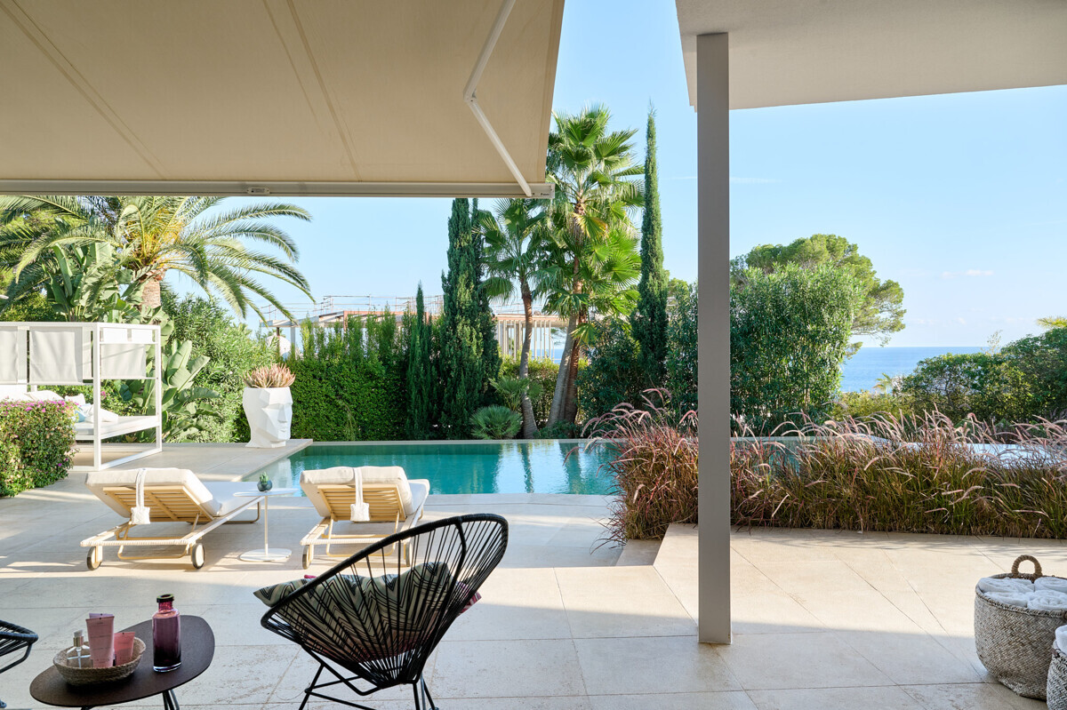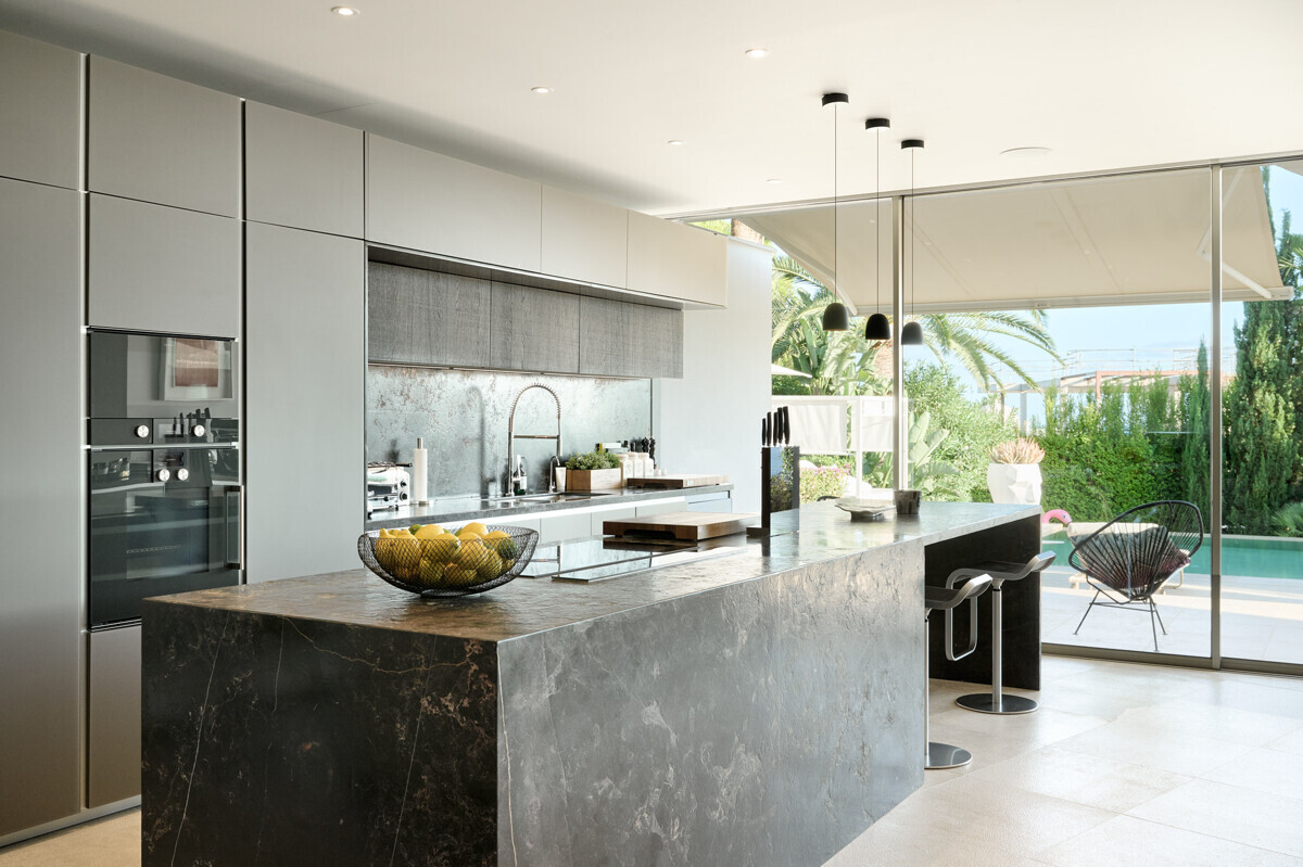 amplio y luminoso salón-comedor, elegante zona de estar con chimenea, moderna cocina americana con electrodomésticos Gaggenau, despacho con cuarto de baño que también puede utilizarse como dormitorio, aseo de invitados, acceso directo a la terraza cubierta, barbacoa, zona de piscina con dos piscinas, terraza solárium y bonito jardín mediterráneo
