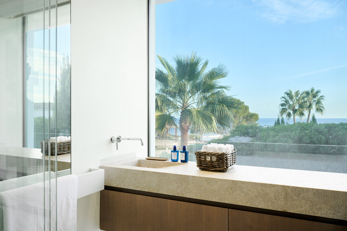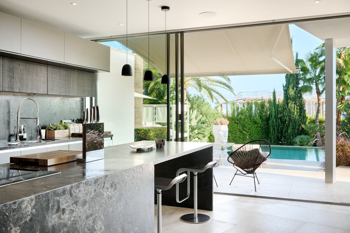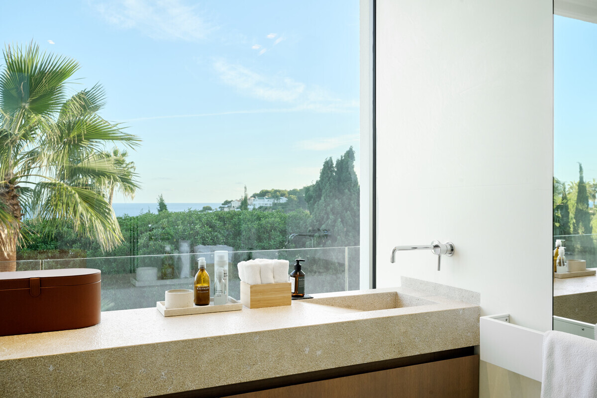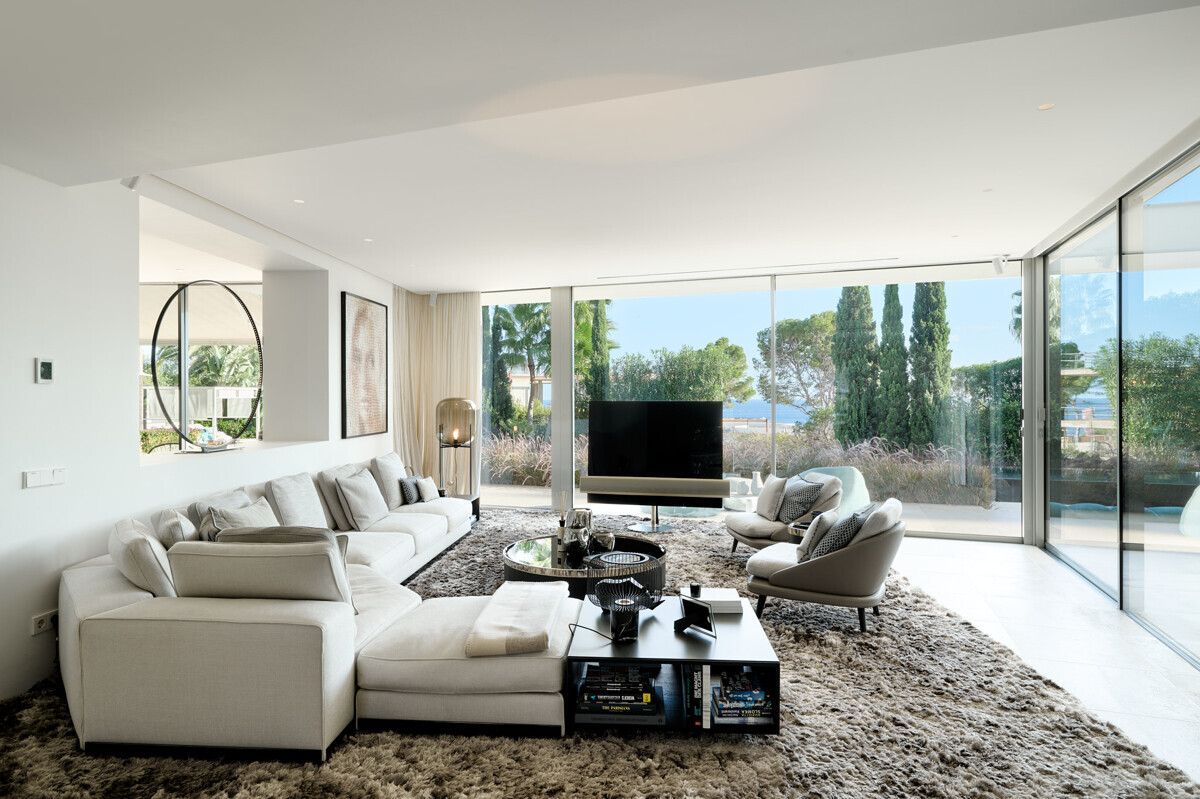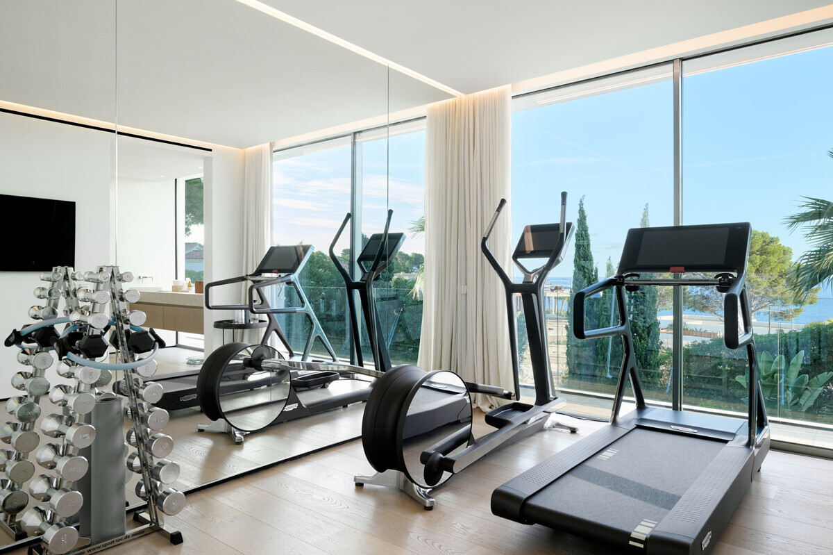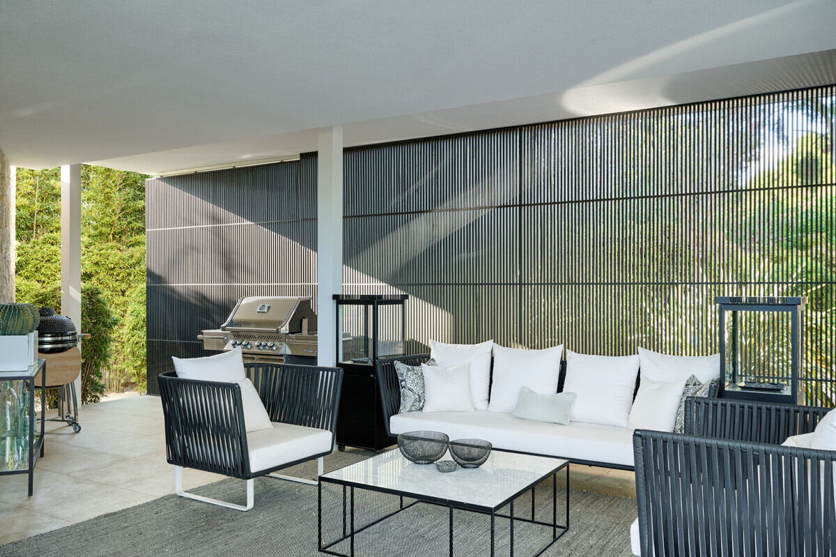 amplio y luminoso salón-comedor, elegante zona de estar con chimenea, moderna cocina americana con electrodomésticos Gaggenau, despacho con cuarto de baño que también puede utilizarse como dormitorio, aseo de invitados, acceso directo a la terraza cubierta, barbacoa, zona de piscina con dos piscinas, terraza solárium y bonito jardín mediterráneo
