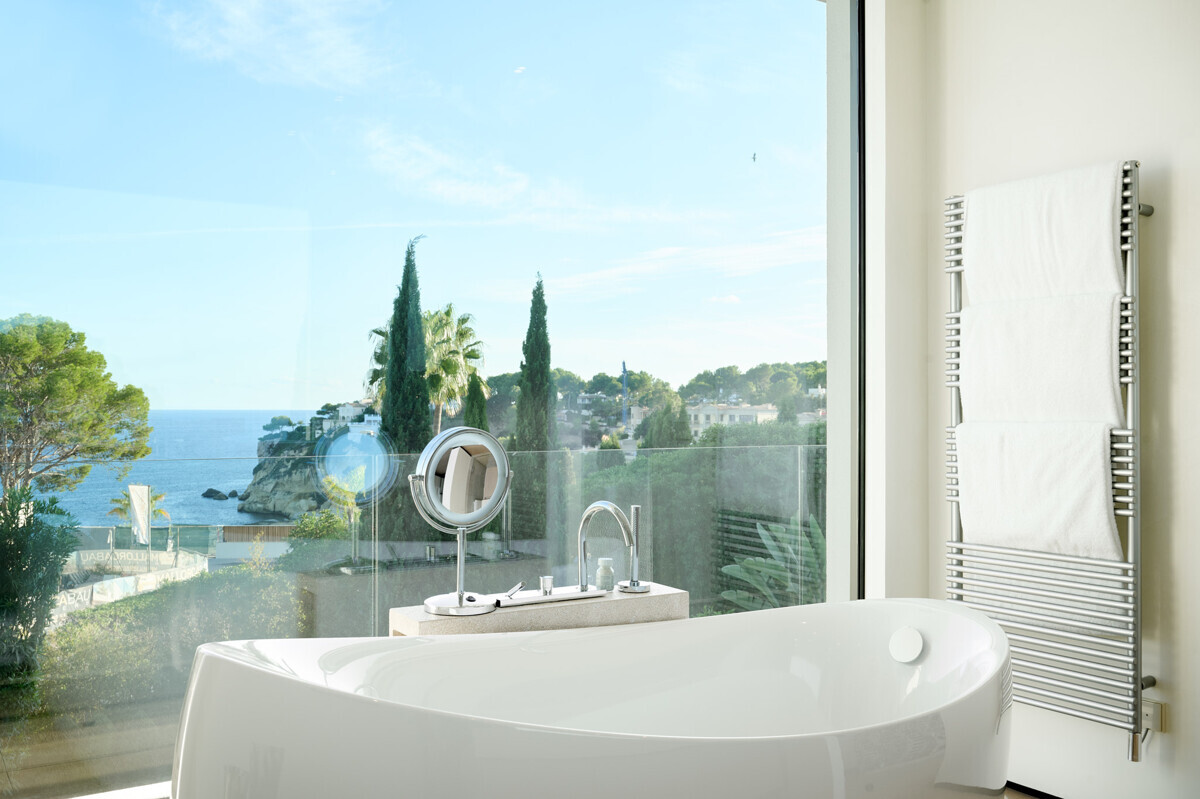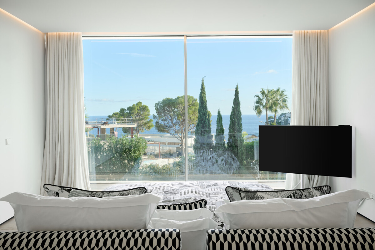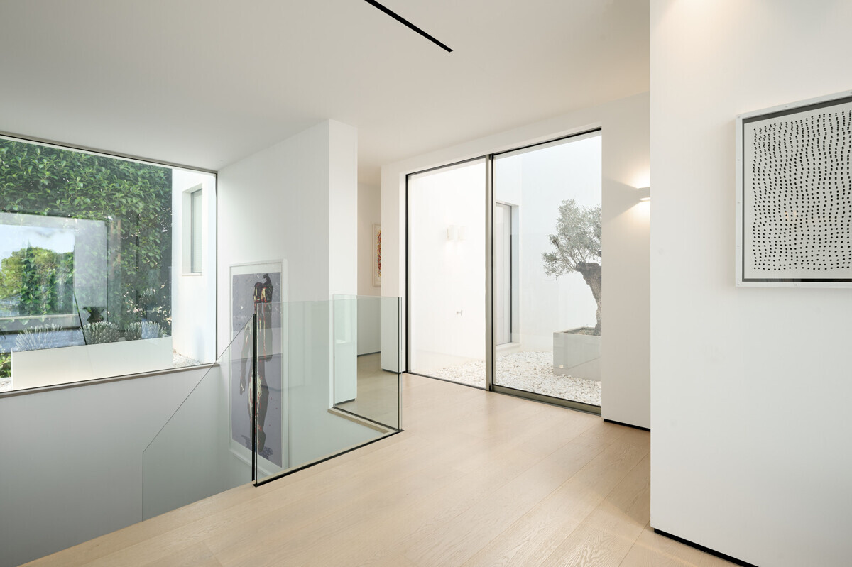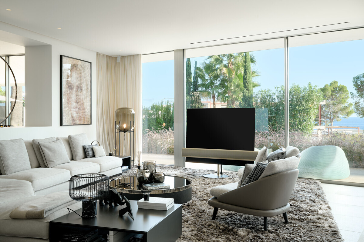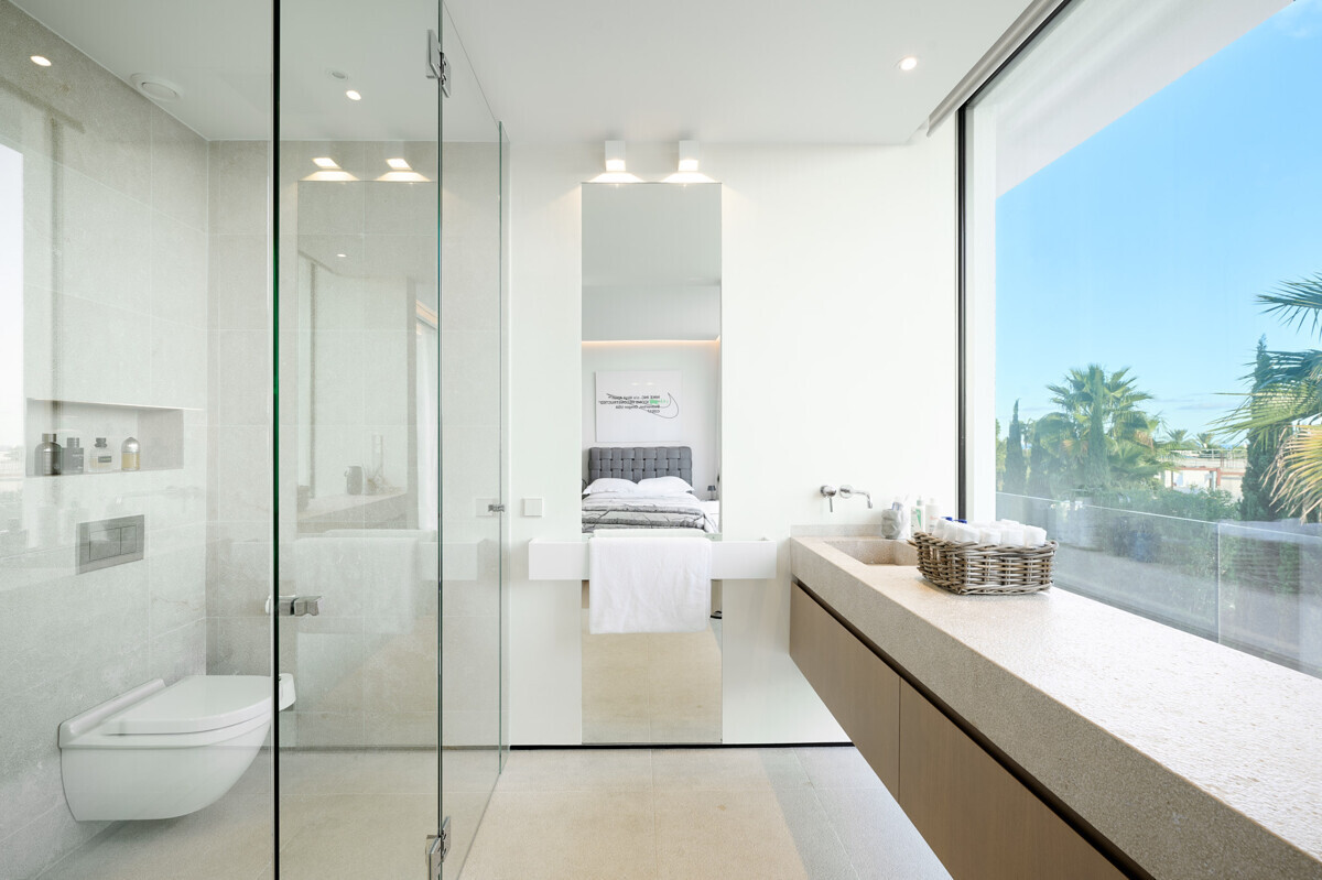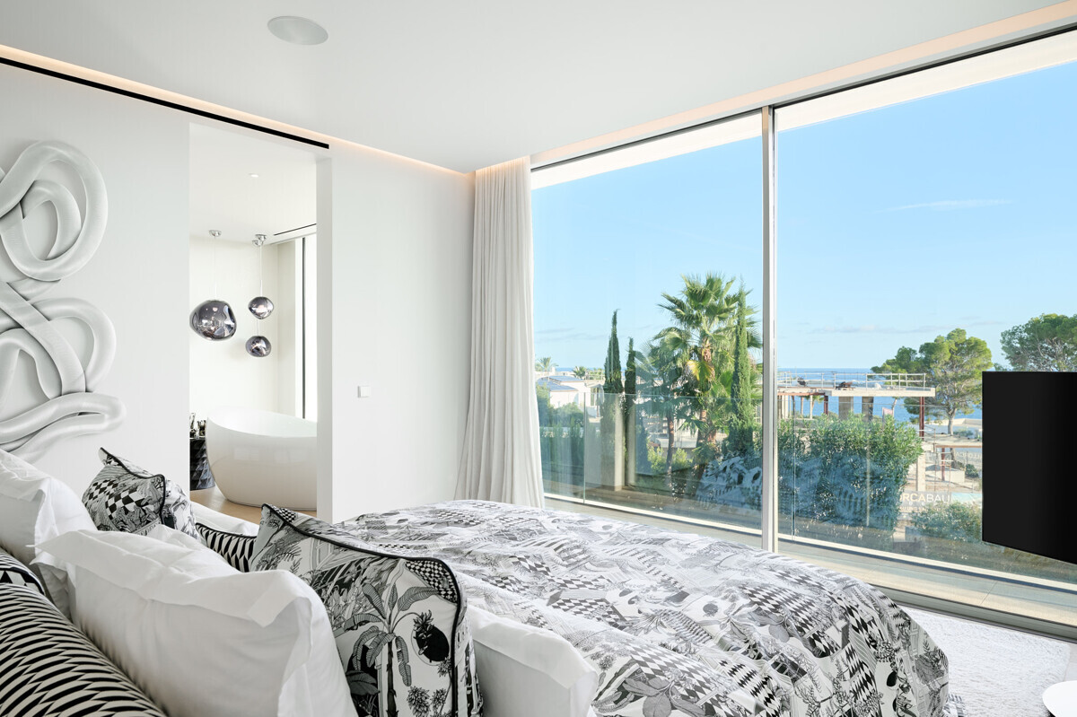 amplio y luminoso salón-comedor, elegante zona de estar con chimenea, moderna cocina americana con electrodomésticos Gaggenau, despacho con cuarto de baño que también puede utilizarse como dormitorio, aseo de invitados, acceso directo a la terraza cubierta, barbacoa, zona de piscina con dos piscinas, terraza solárium y bonito jardín mediterráneo