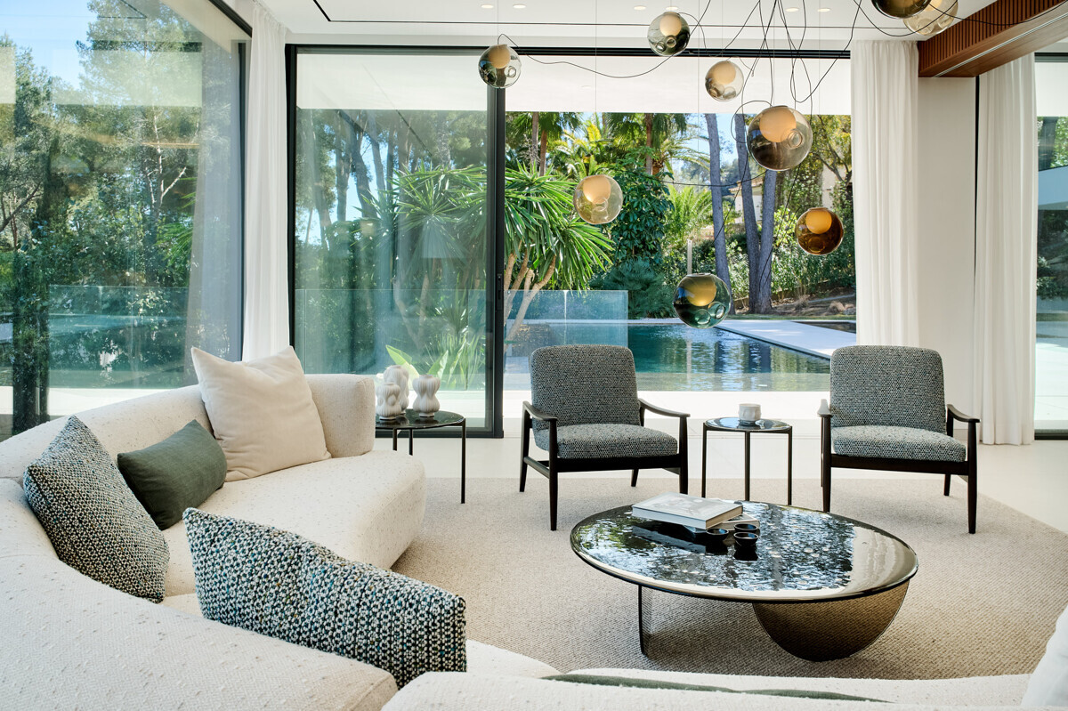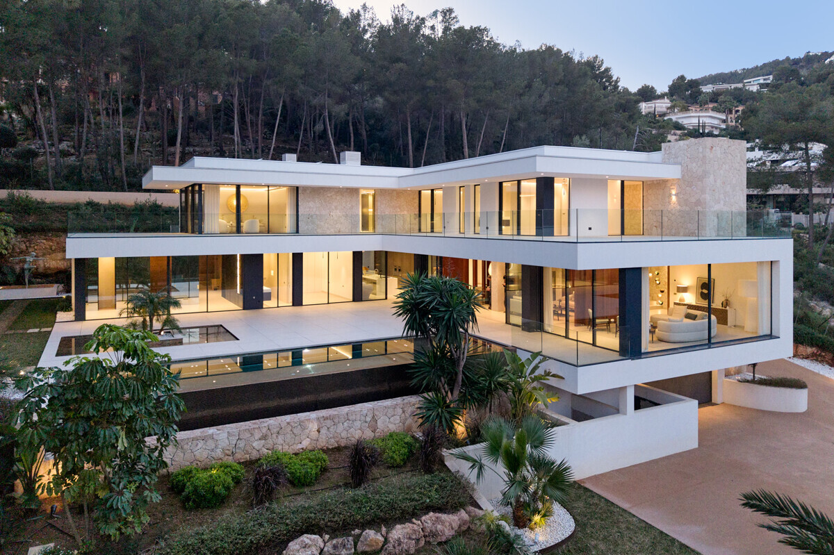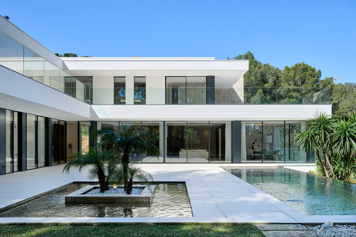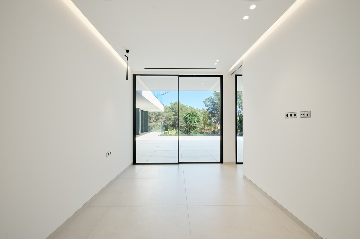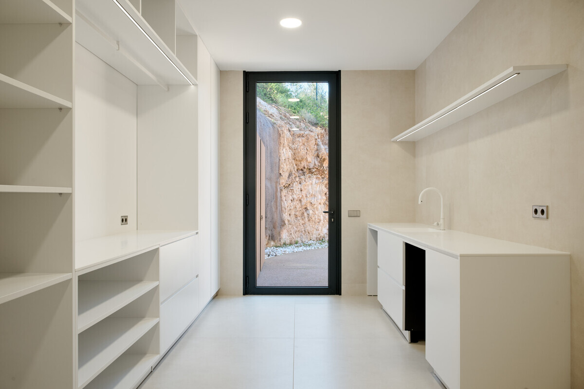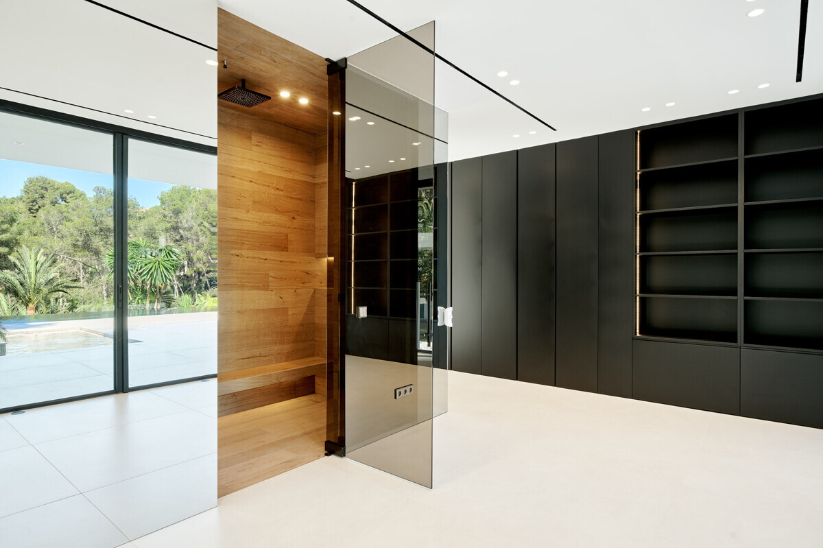heller Eingangsbereich, Wohn- Esszimmer mit Kamin, offene Küche mit Vorbereitungsküche, Büro, 1 Schlafzimmer mit Bad en Suite, Hauswirtschaftsraum mit separatem Zugang, Gäste WC, exklusiver Spa Bereich mit Dampfsauna, Sauna, Fitnessraum, Bad und Terrasse, Poolbereich mit grosszügiger Sonnenterrasse und schön angelegter mediterraner Garten