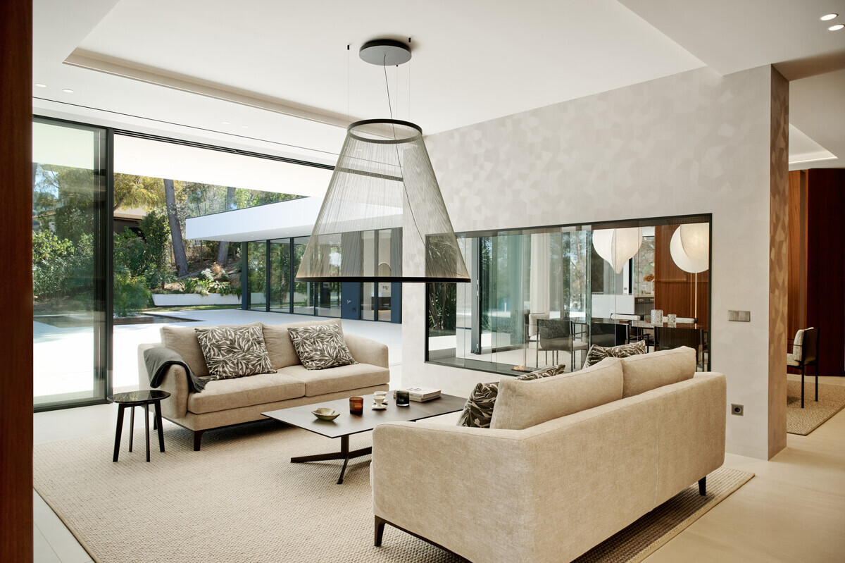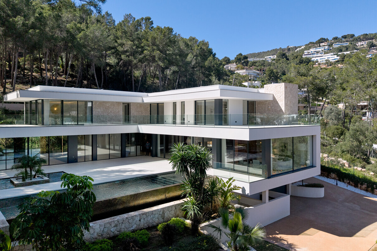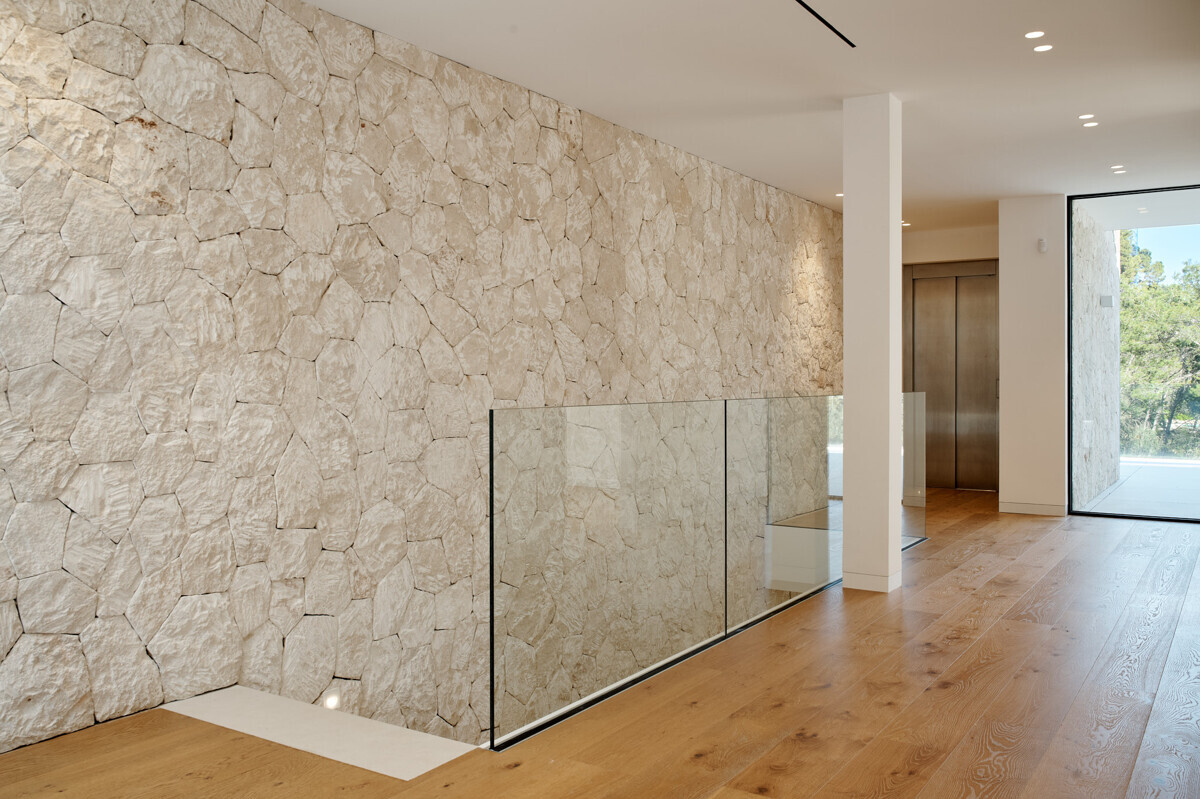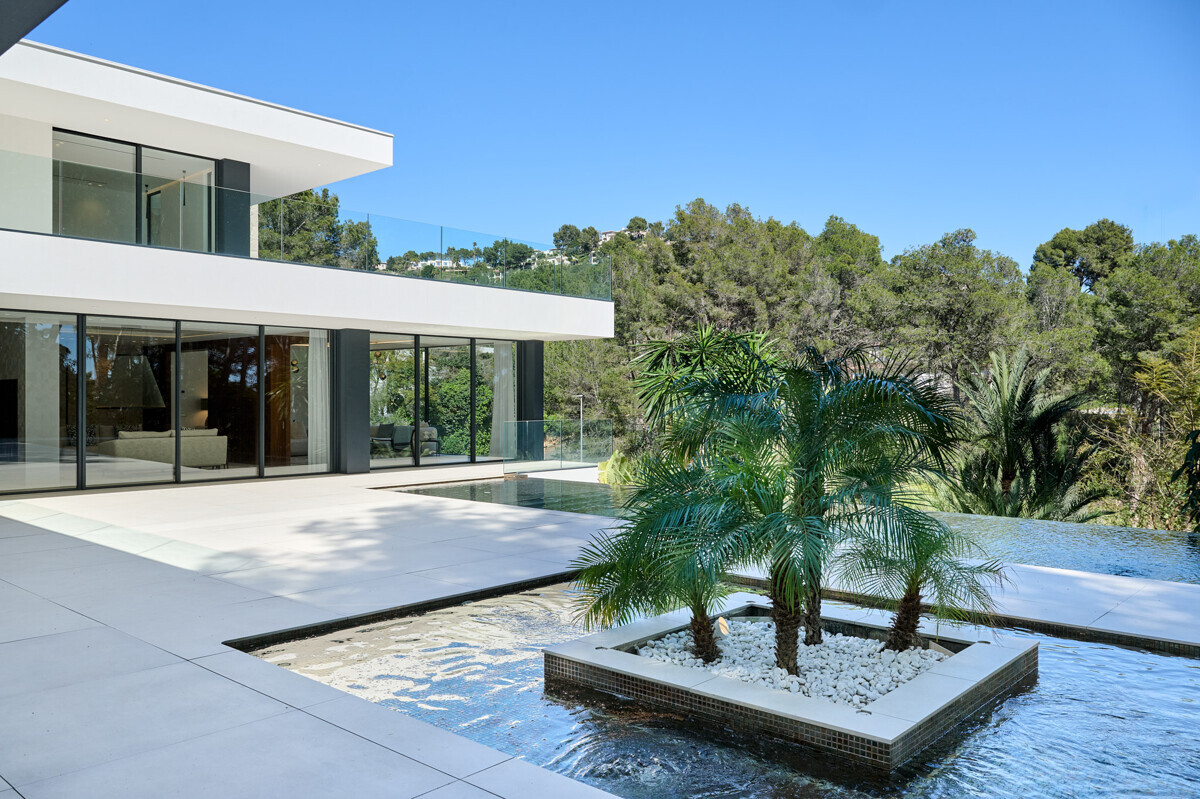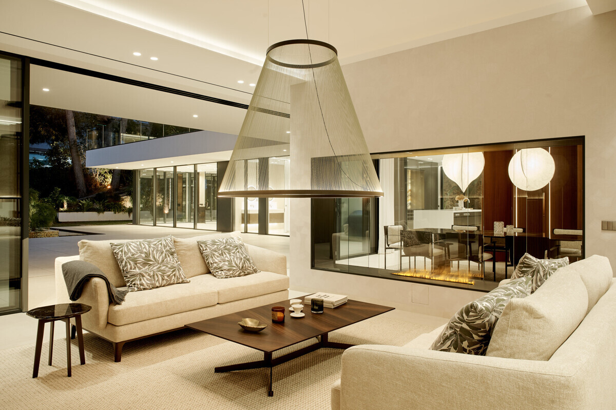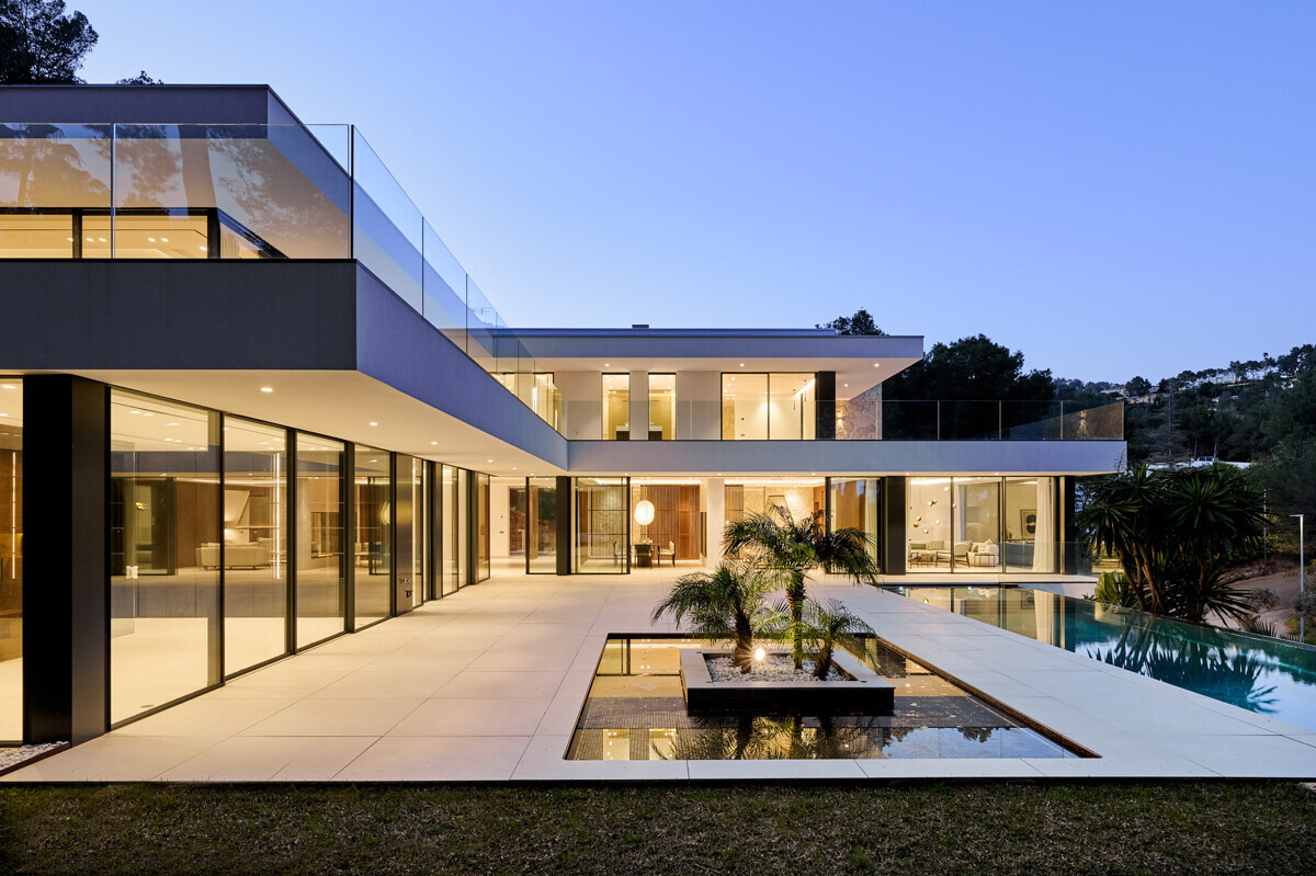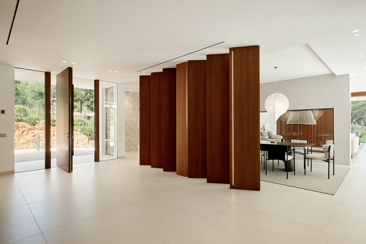 heller Eingangsbereich, Wohn- Esszimmer mit Kamin, offene Küche mit Vorbereitungsküche, Büro, 1 Schlafzimmer mit Bad en Suite, Hauswirtschaftsraum mit separatem Zugang, Gäste WC, exklusiver Spa Bereich mit Dampfsauna, Sauna, Fitnessraum, Bad und Terrasse, Poolbereich mit grosszügiger Sonnenterrasse und schön angelegter mediterraner Garten