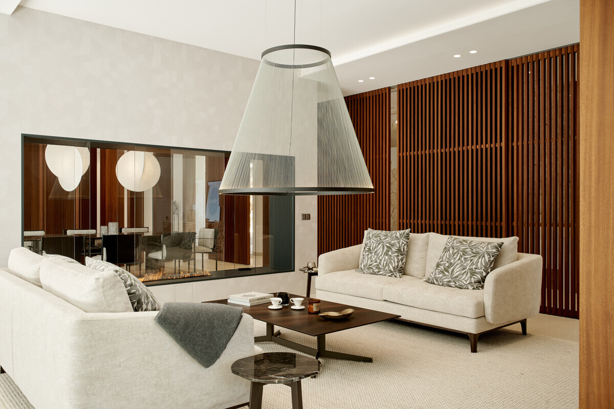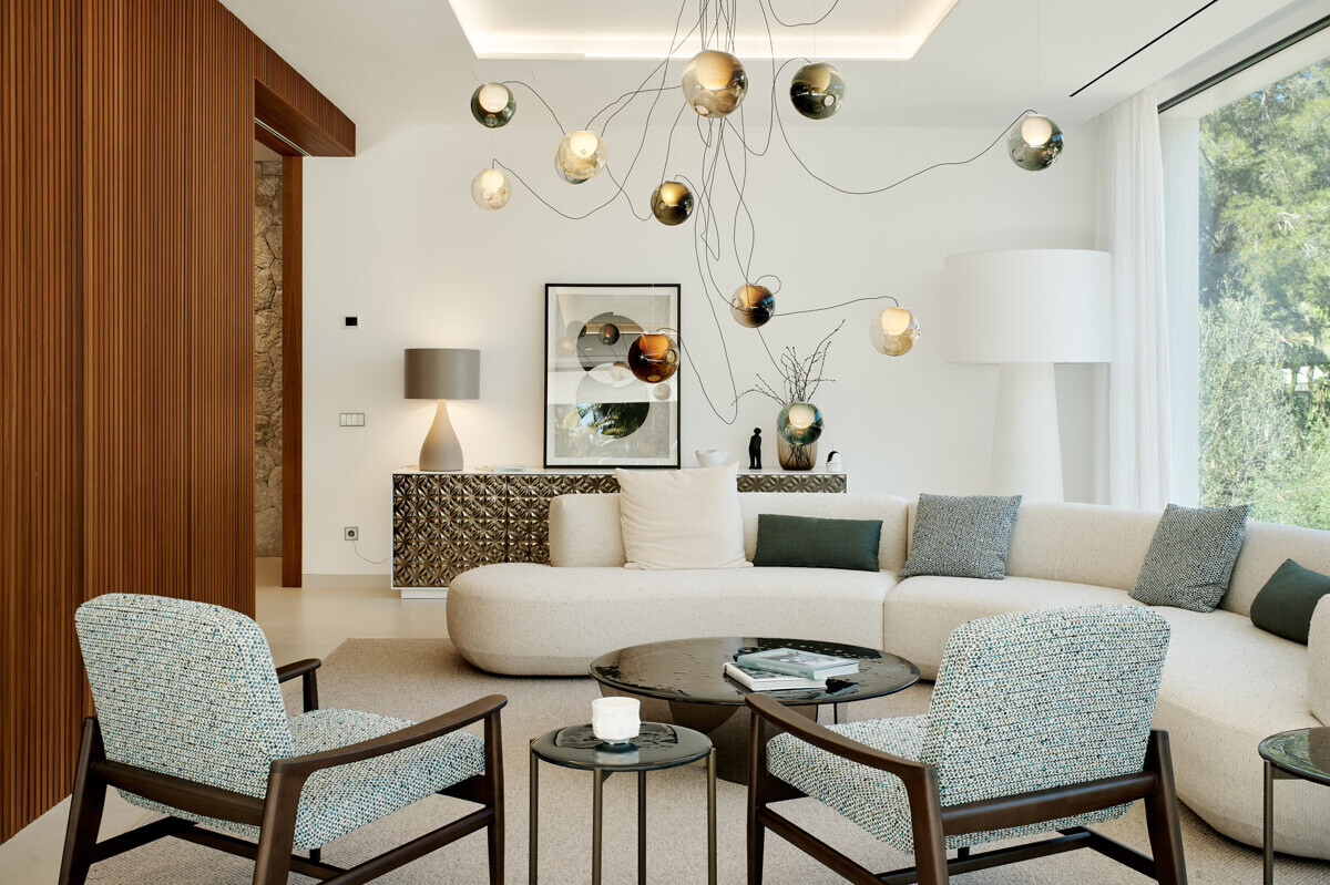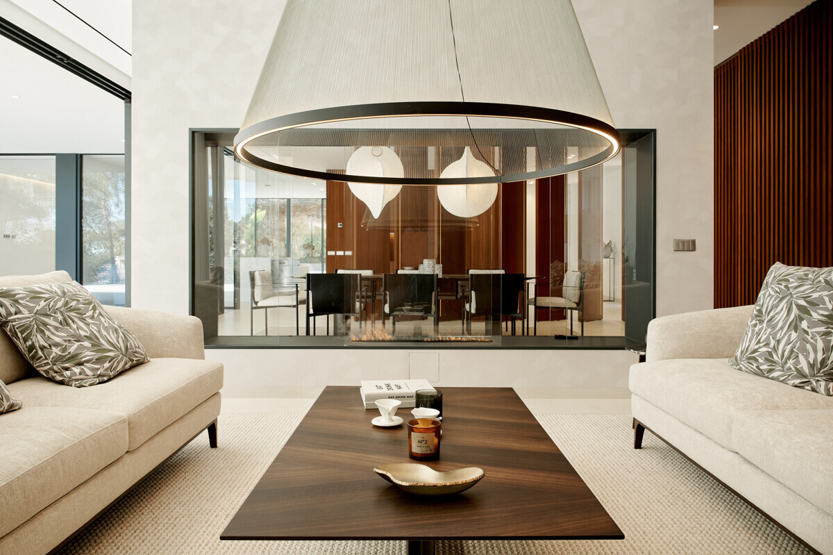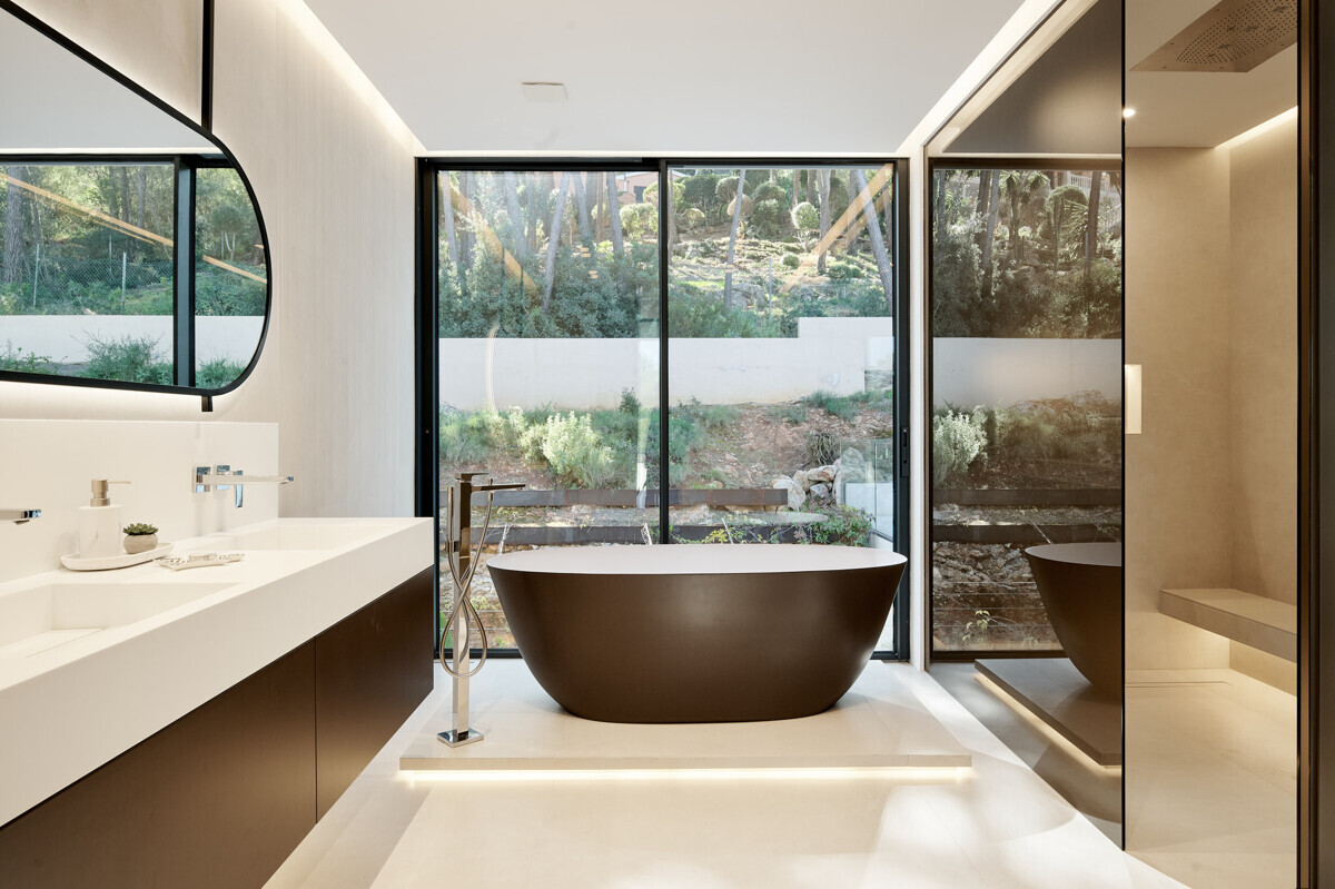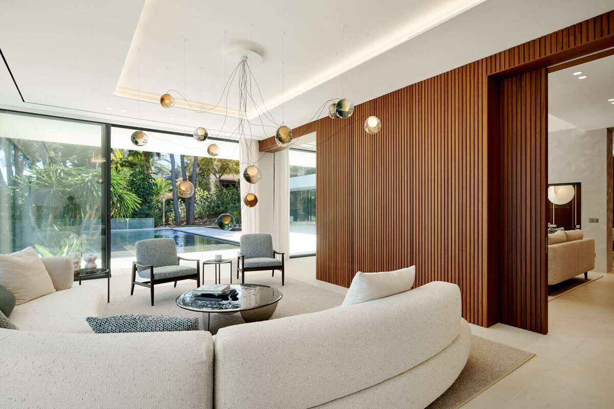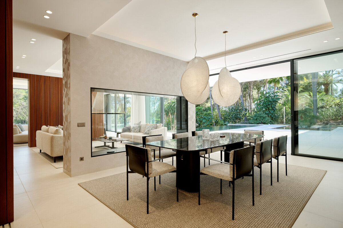 heller Eingangsbereich, Wohn- Esszimmer mit Kamin, offene Küche mit Vorbereitungsküche, Büro, 1 Schlafzimmer mit Bad en Suite, Hauswirtschaftsraum mit separatem Zugang, Gäste WC, exklusiver Spa Bereich mit Dampfsauna, Sauna, Fitnessraum, Bad und Terrasse, Poolbereich mit grosszügiger Sonnenterrasse und schön angelegter mediterraner Garten