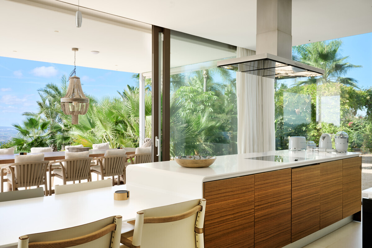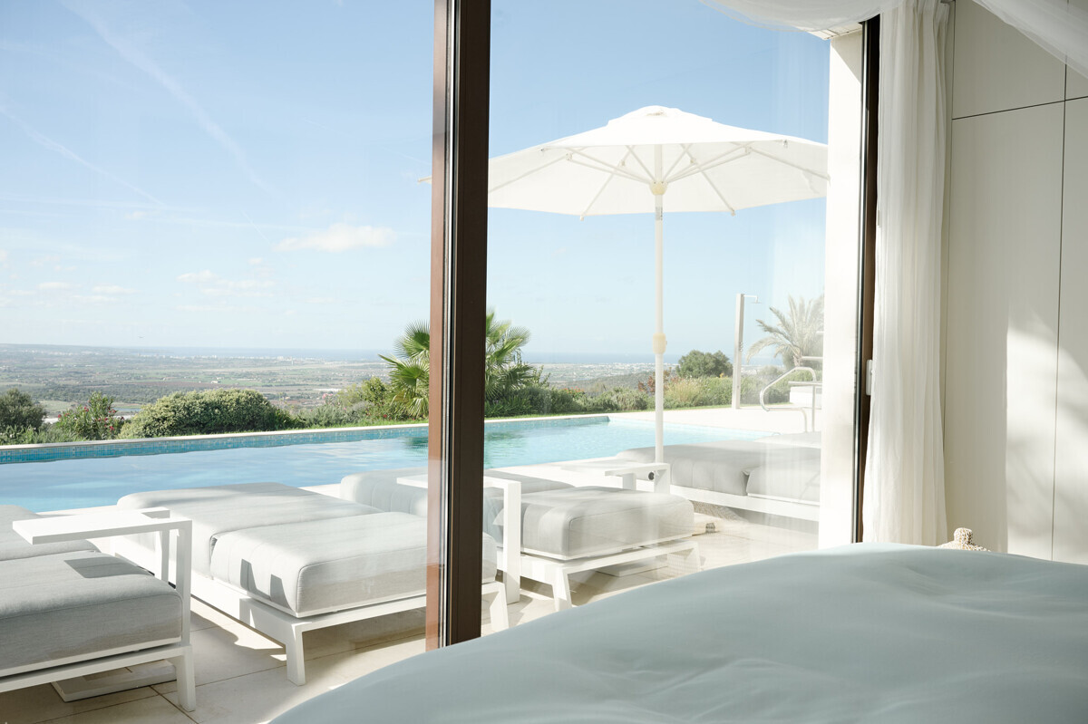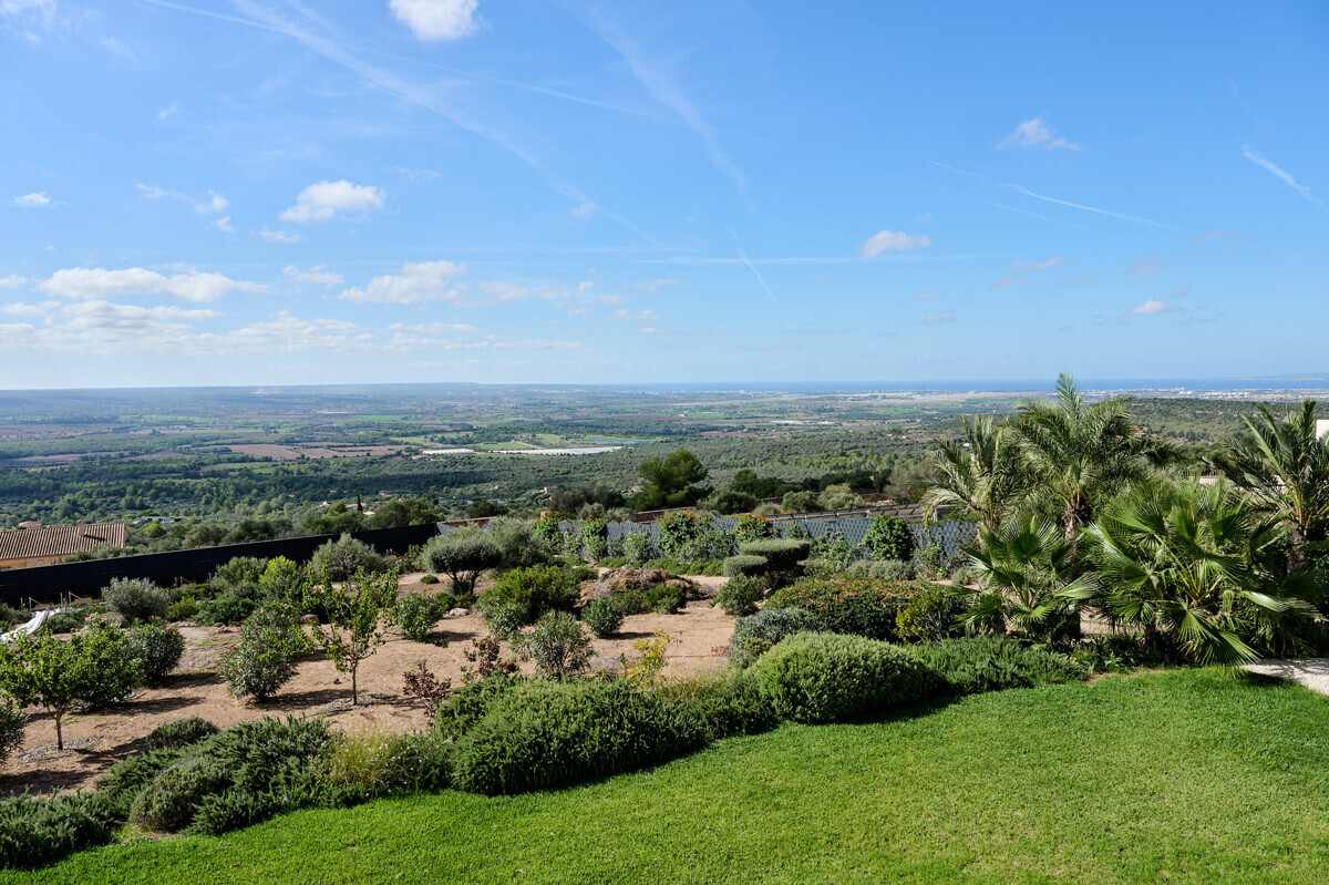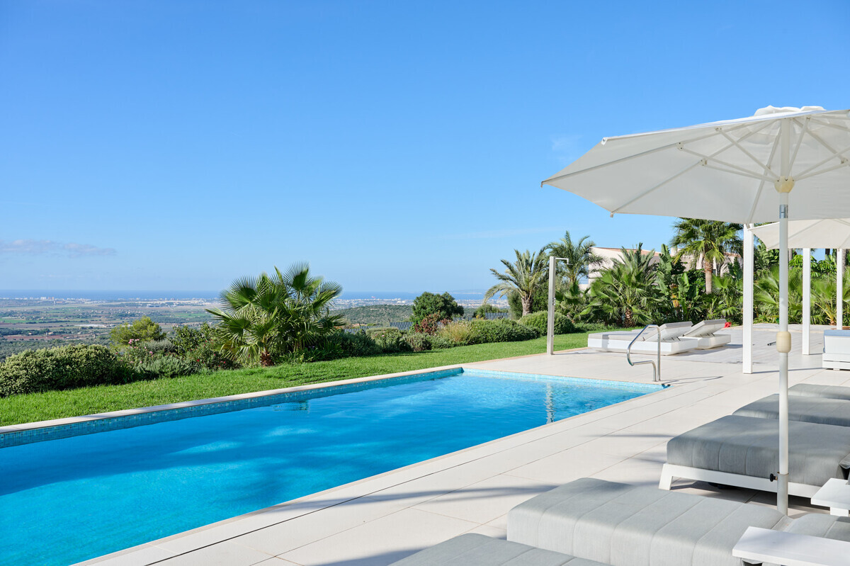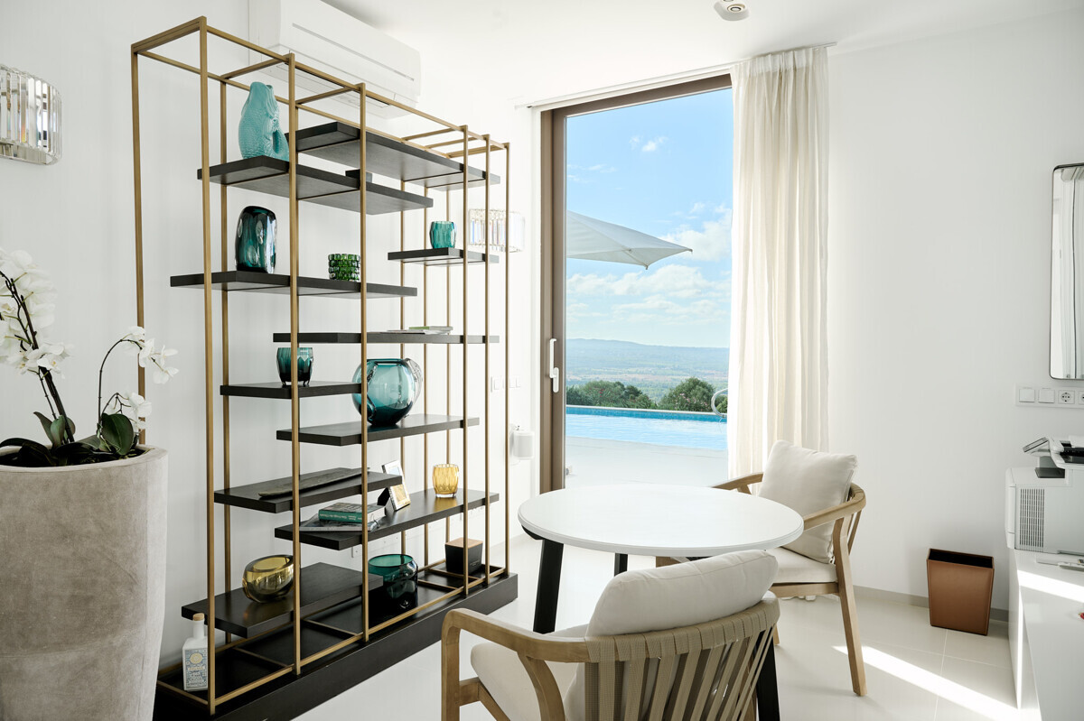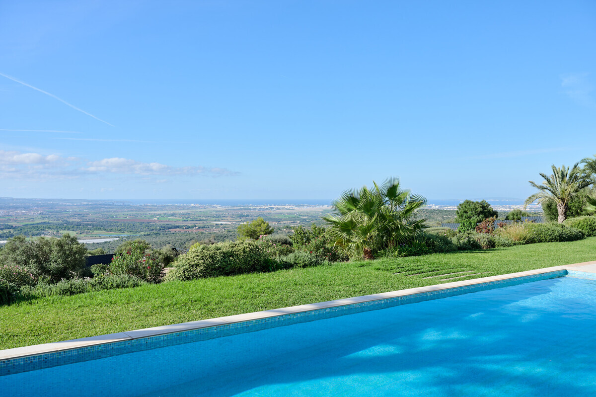 2 Schlafzimmer mit Panoramablick über den Pool, 2 Badezimmer, offene voll ausgestattete Küche, grosszügiges helles Wohn- Esszimmer mit Kamin und angrenzendem Büro, Zugang zur überdachten Terrasse, Loungearea, Aussenküche mit BBQ & Pizzaofen, Poolbereich mit grosser Sonnenterrasse, traumhaft schön angelegter mediterraner Garten