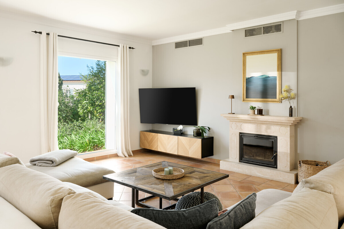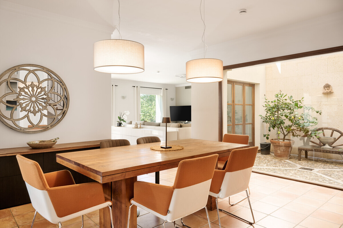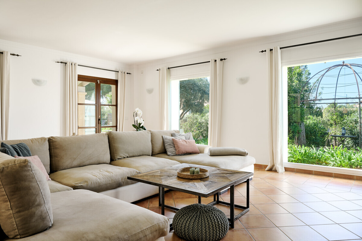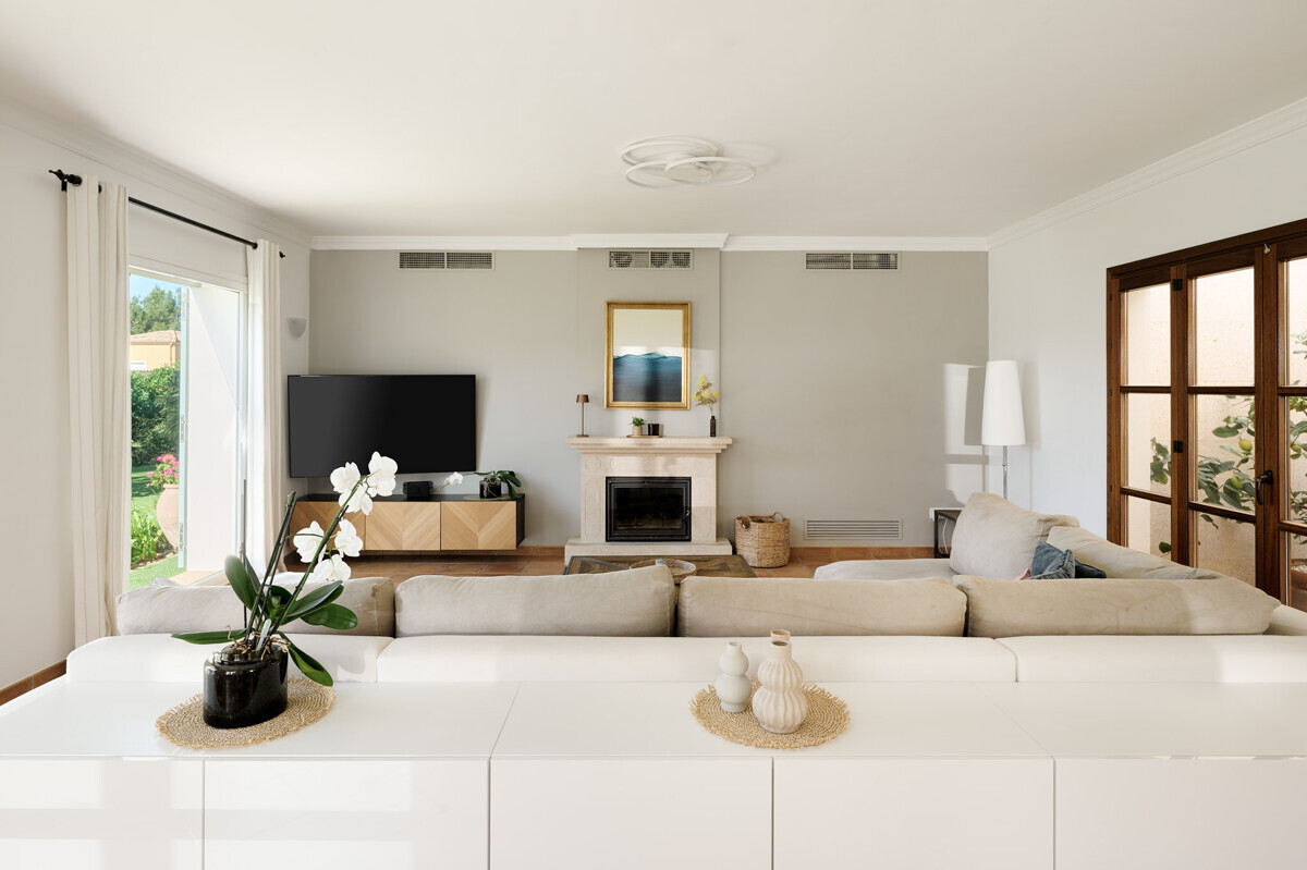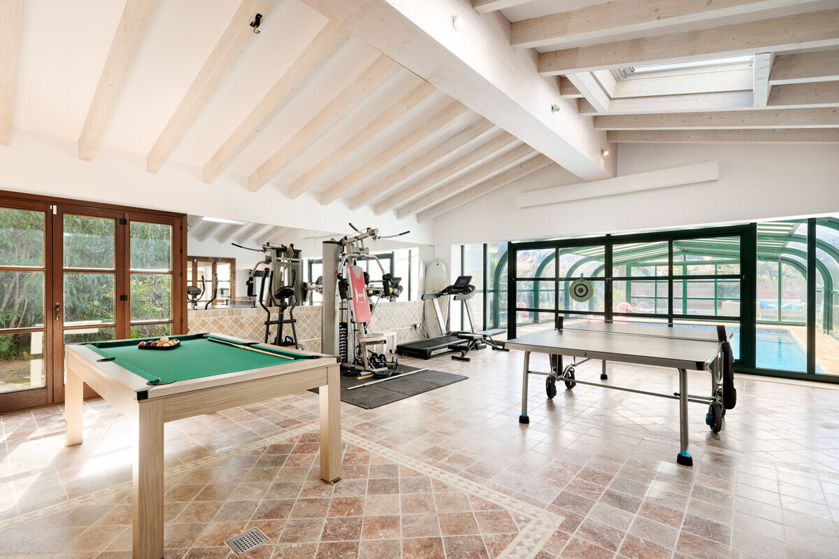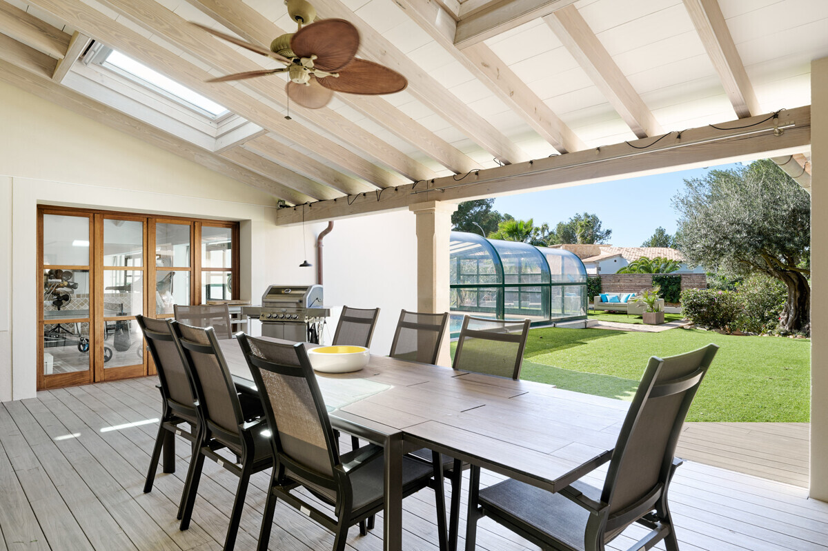 heller Eingangsbereich, Wohn- Esszimmer mit Kamin, offene voll ausgestattete Küche, 2 Schlafzimmer, Bad, idyllischer Patio, Hauswirtschaftsraum, Gäste WC, Mehrzweckraum für Fitness mit Dampfbad und finnischer Sauna, Zugang zur überdachten Terrasse, beheizbarer Pool mit Panoramaüberdachung, grosszügiger schön angelegter mediterraner Garten
