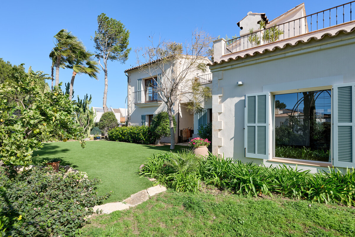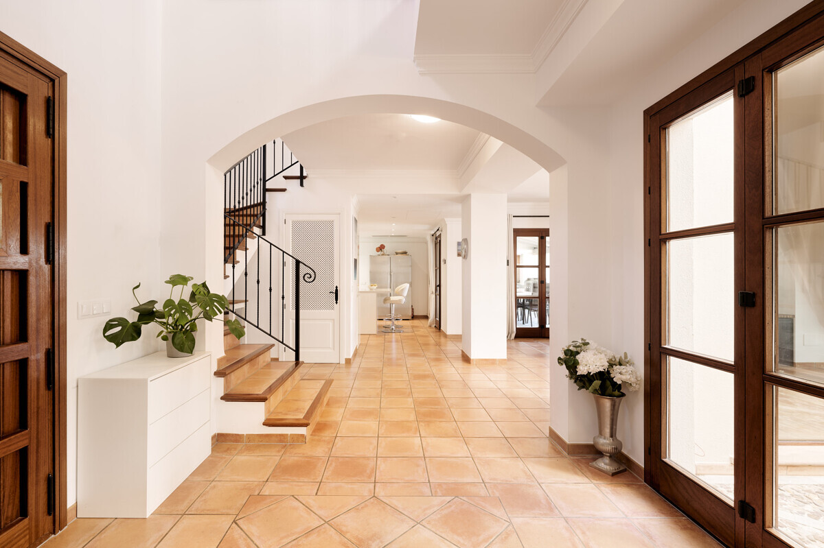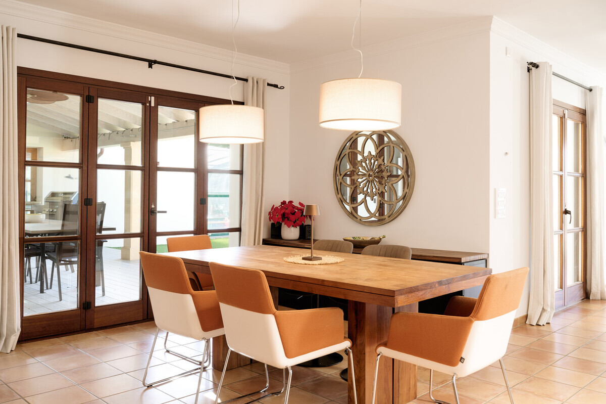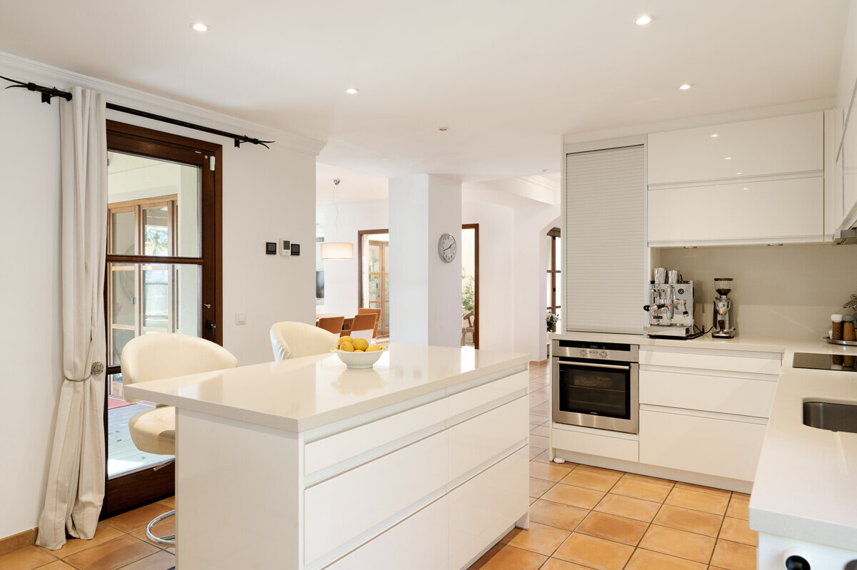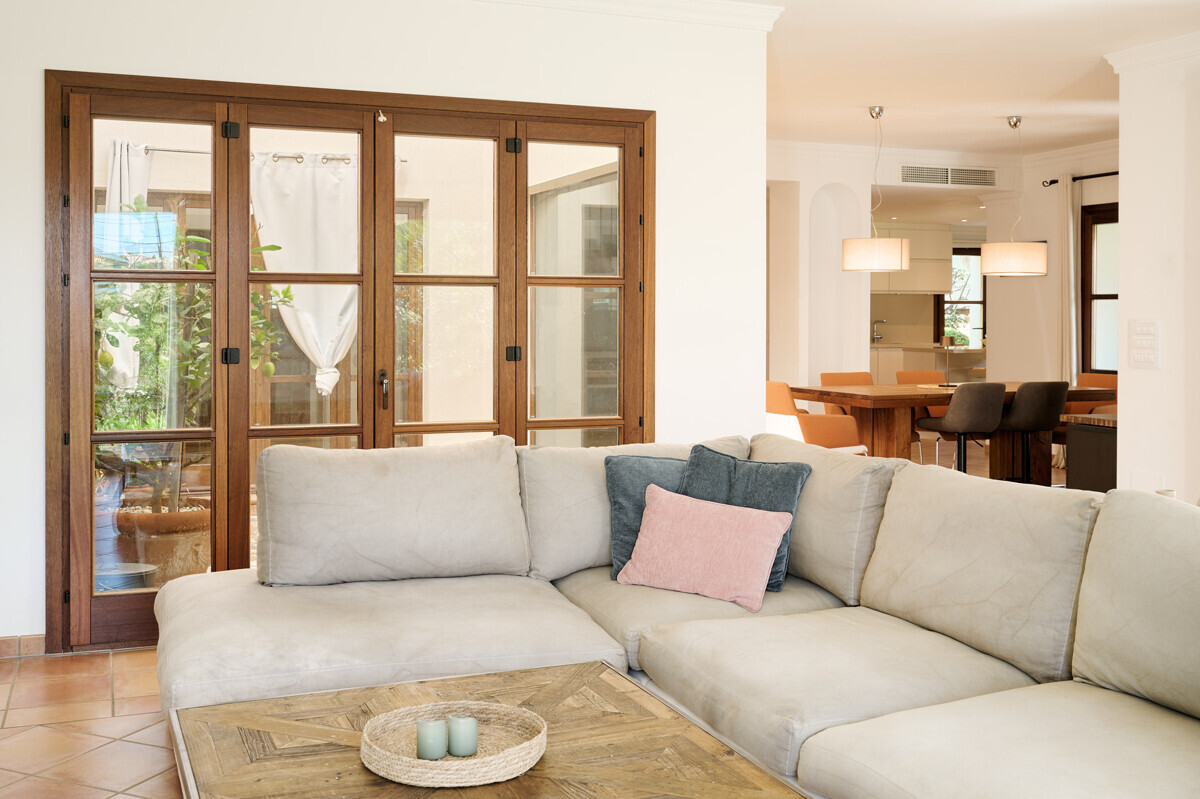 heller Eingangsbereich, Wohn- Esszimmer mit Kamin, offene voll ausgestattete Küche, 2 Schlafzimmer, Bad, idyllischer Patio, Hauswirtschaftsraum, Gäste WC, Mehrzweckraum für Fitness mit Dampfbad und finnischer Sauna, Zugang zur überdachten Terrasse, beheizbarer Pool mit Panoramaüberdachung, grosszügiger schön angelegter mediterraner Garten