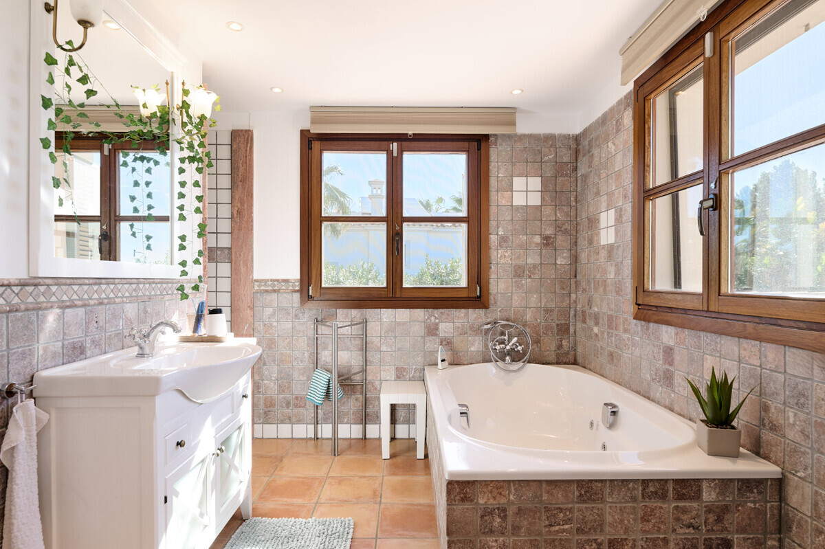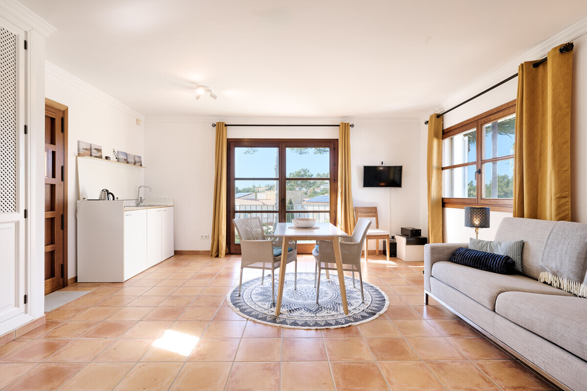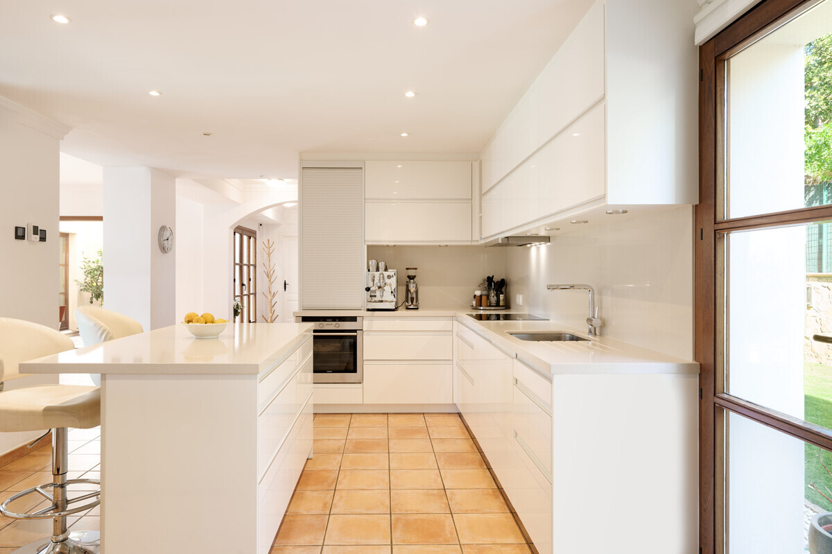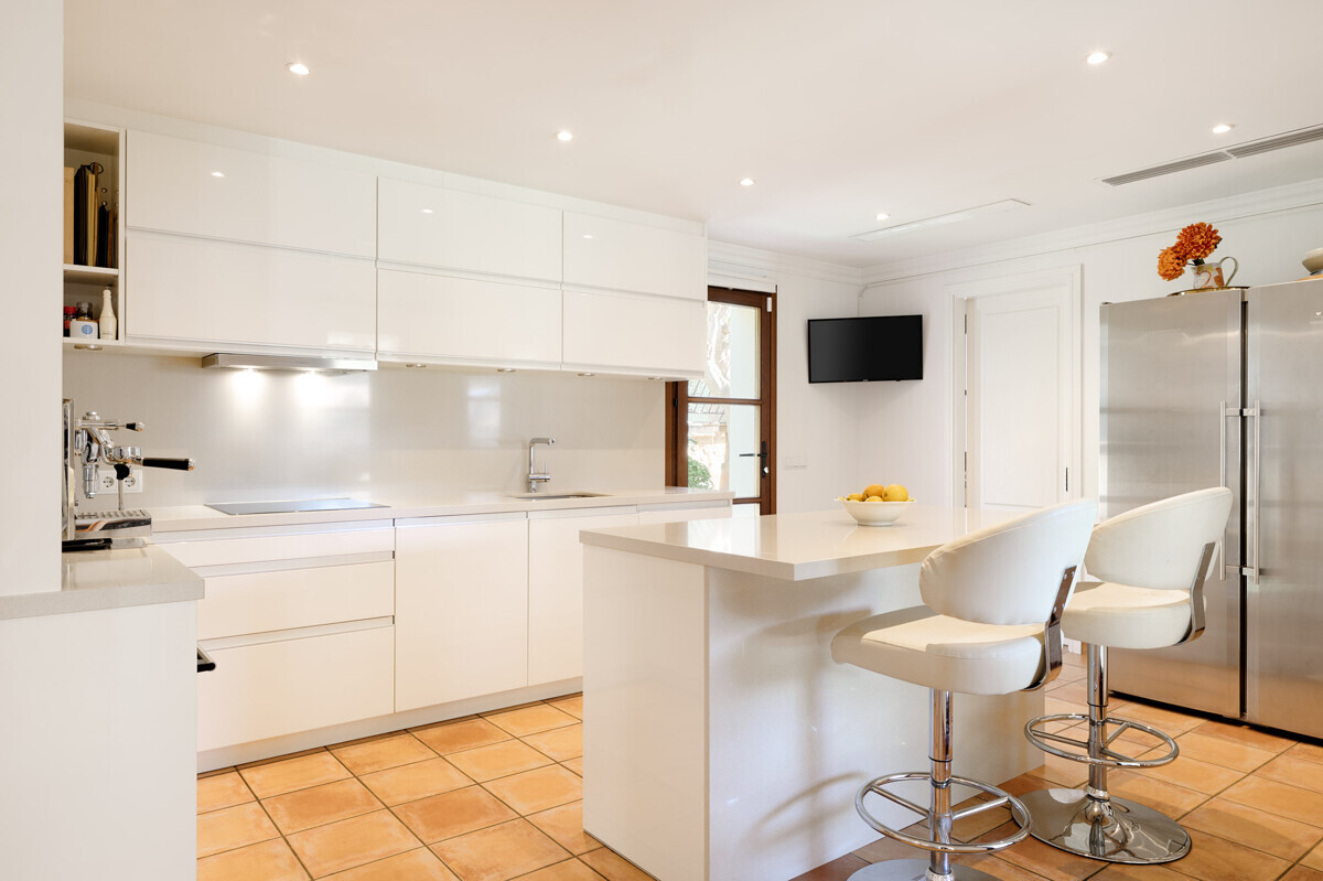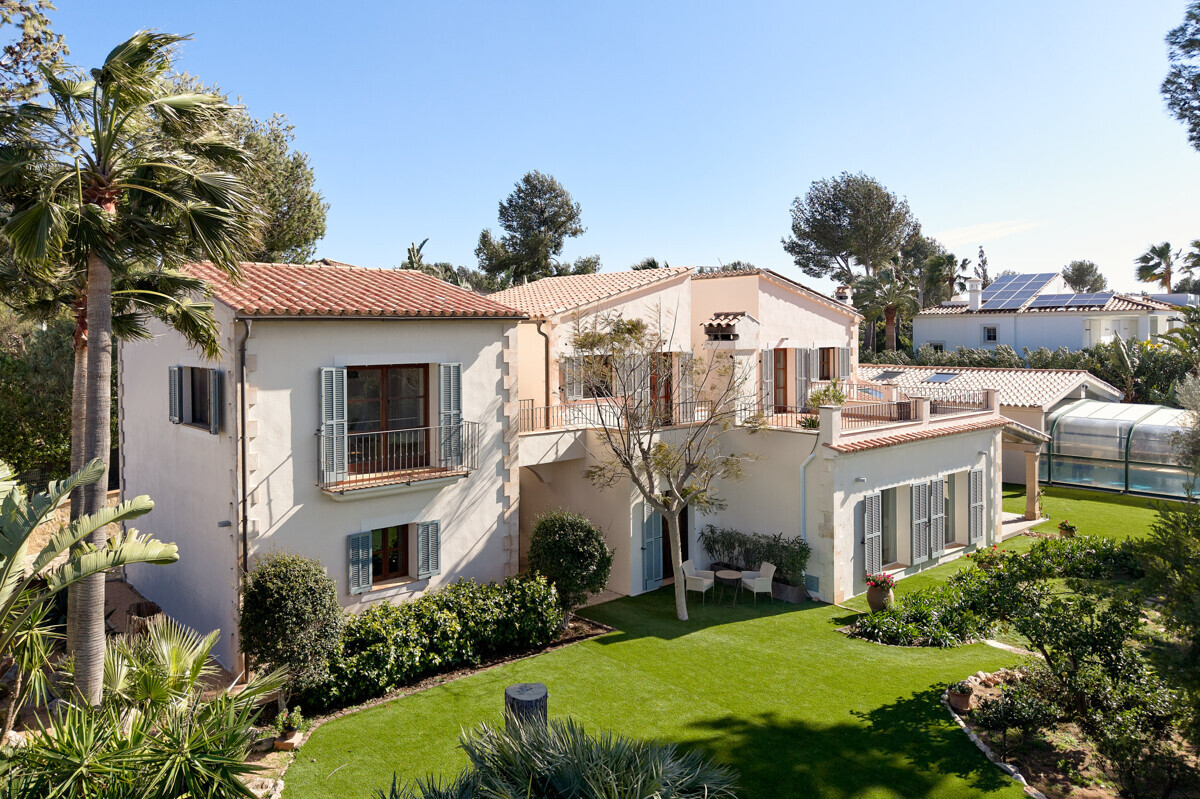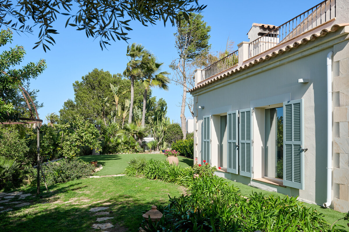 heller Eingangsbereich, Wohn- Esszimmer mit Kamin, offene voll ausgestattete Küche, 2 Schlafzimmer, Bad, idyllischer Patio, Hauswirtschaftsraum, Gäste WC, Mehrzweckraum für Fitness mit Dampfbad und finnischer Sauna, Zugang zur überdachten Terrasse, beheizbarer Pool mit Panoramaüberdachung, grosszügiger schön angelegter mediterraner Garten