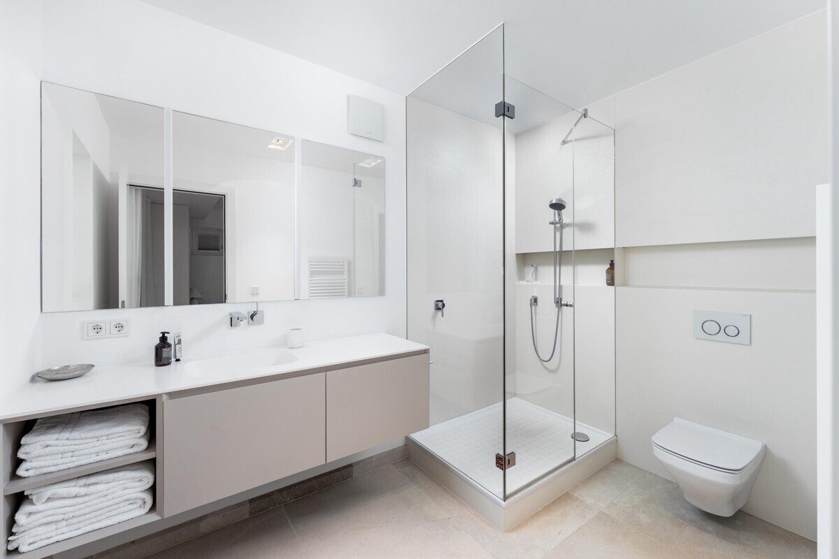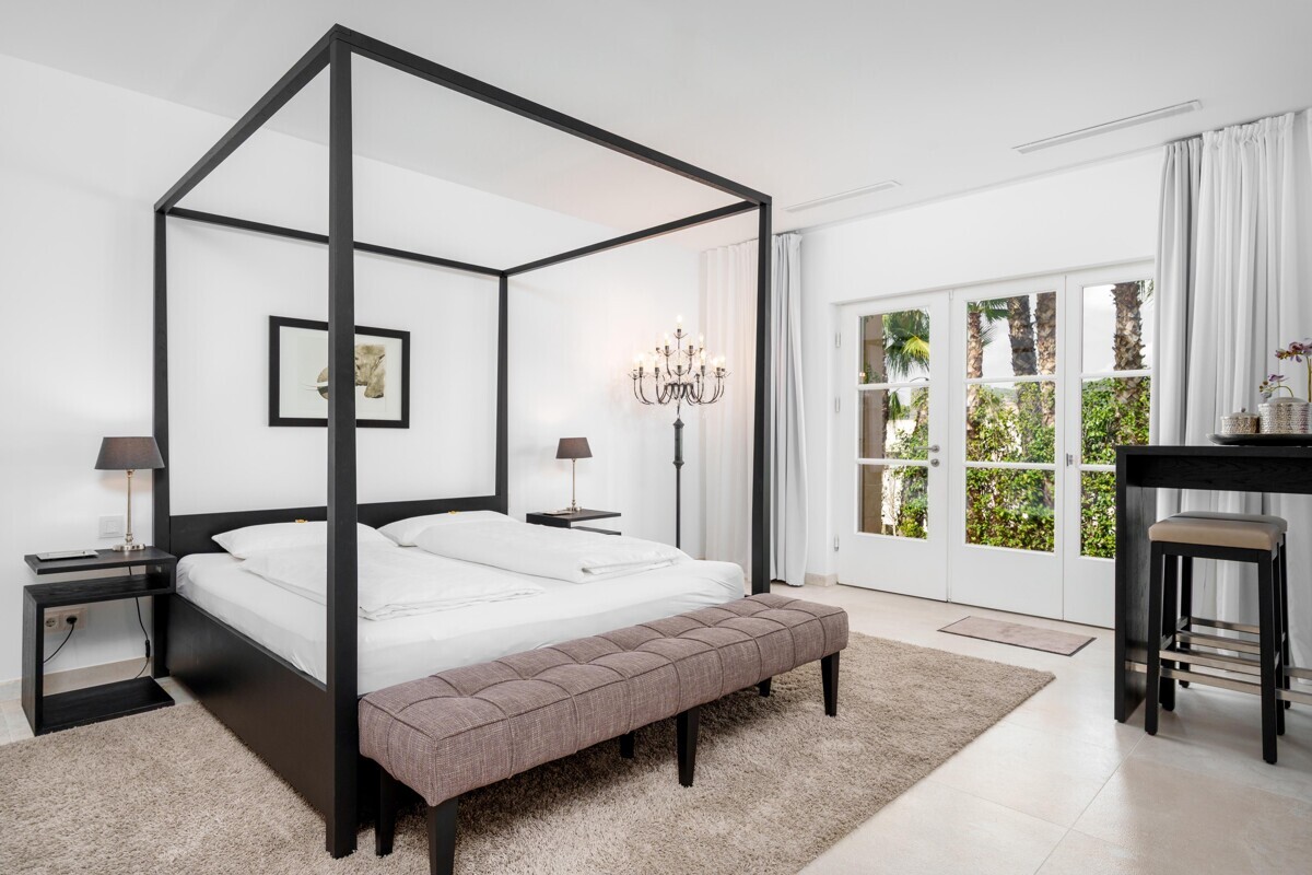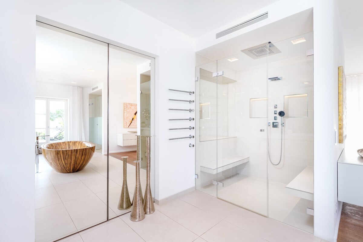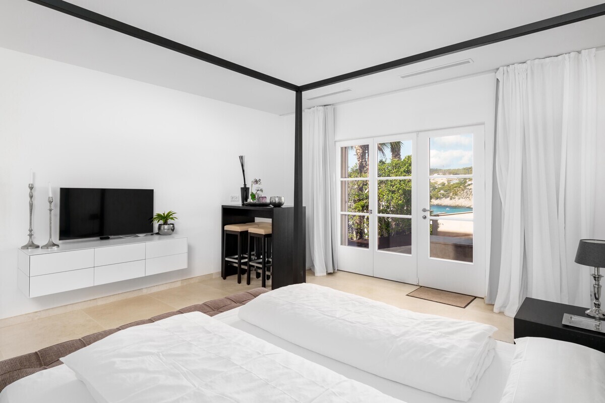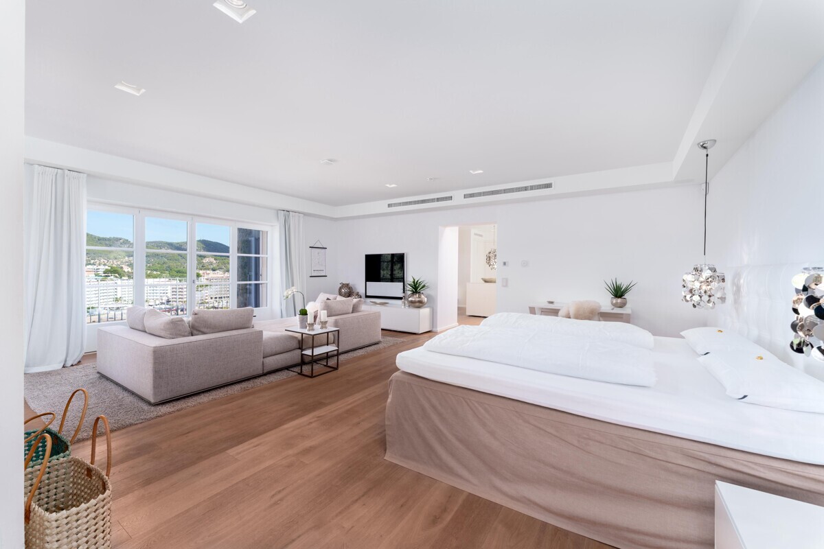 Die Villa erstreckt sich über drei Etagen und verfügt über ein modernes Design mit zahlreichen Lounge-Bereichen sowohl im Innen- als auch im Außenbereich. Jedes Schlafzimmer hat ein eigenes en-suite Badezimmer sowie ein Satelliten-TV. Sie können sich auf den verschiedenen Terrassen entspannen, egal ob Sie Schatten oder Sonne bevorzugen, ein erfrischendes Bad im beheizten Infinity-Pool oder im Whirlpool nehmen oder mit den modernen Technogym-Fitnessgeräten aktiv bleiben. Die zentral gesteuerte Klimaanlage und die Fußbodenheizung sorgen überall für angenehme Temperaturen. Eine Doppelgarage ist mit dem Haus verbunden, und es gibt einen zusätzlichen Parkplatz im Freien.